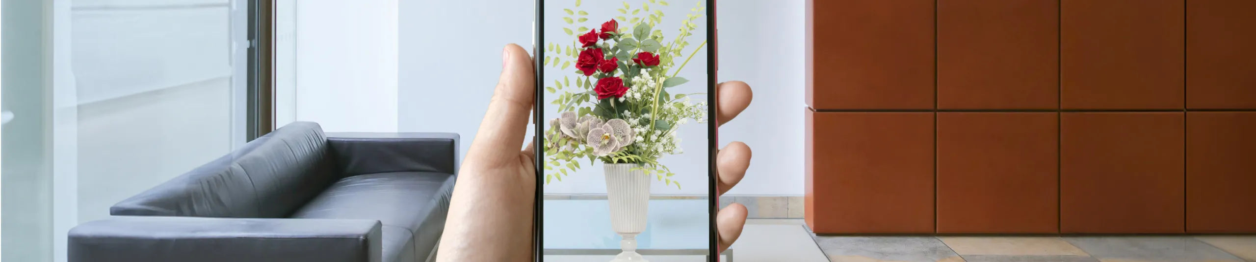 お手持ちのスマホで花や装飾品を試し置きできるAR(拡張現実)機能と商品をご紹介。