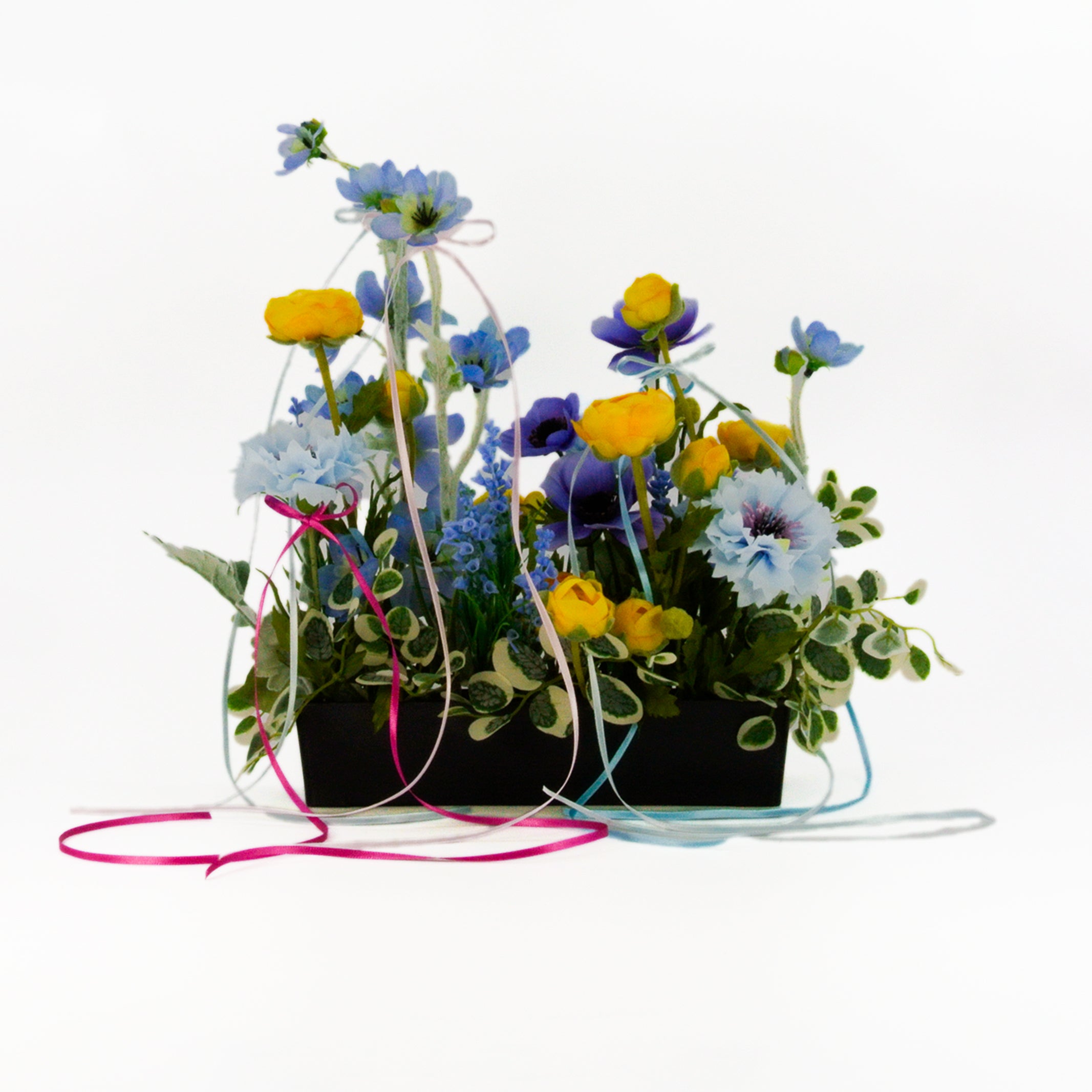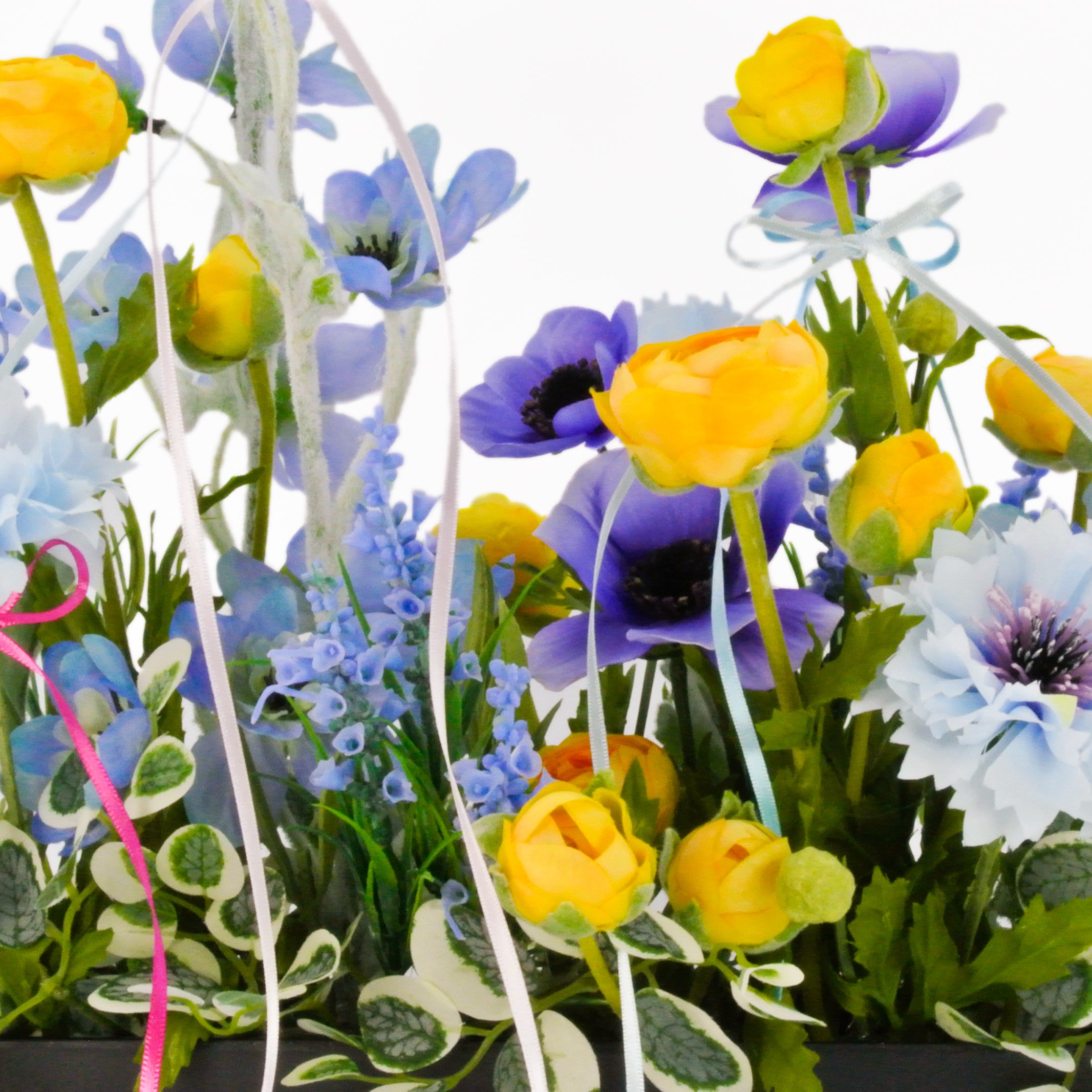 フレッシュなイエローラナンキュラスと、若々しさを感じさせるパステルカラーのブルーコーンフラワーにパープルアネモネが印象的なアレンジメント。