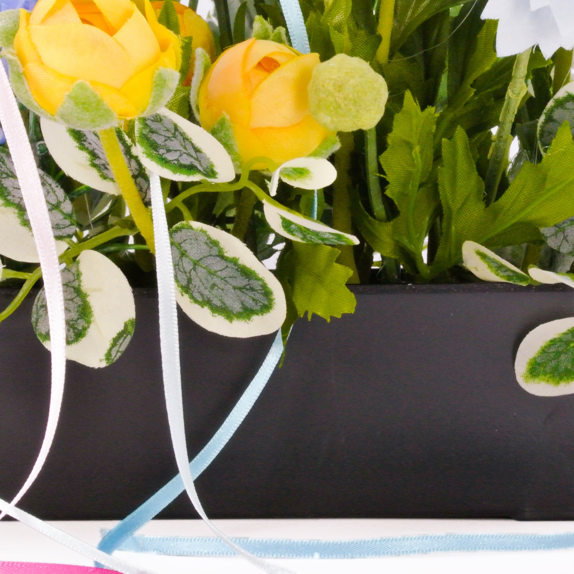 「優しい心遣い」が花言葉であるイエローラナンキュラス、爽やかなブルーが心地よいアネモネとニゲラにお洒落なリボンアレンジは、ガーリーな印象ながら、バランスよく配置されたグリーンのおかげで甘すぎず、様々な空間にマッチ。