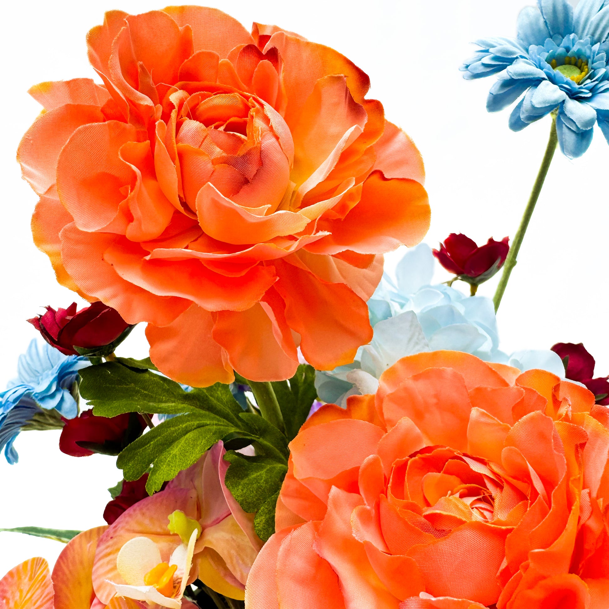 大輪のオレンジカラーと、グラデーションが豪華な胡蝶蘭が目を引くアレンジメント。見ているだけで笑顔がこぼれそうな、明るくフレッシュな花々の共演です。