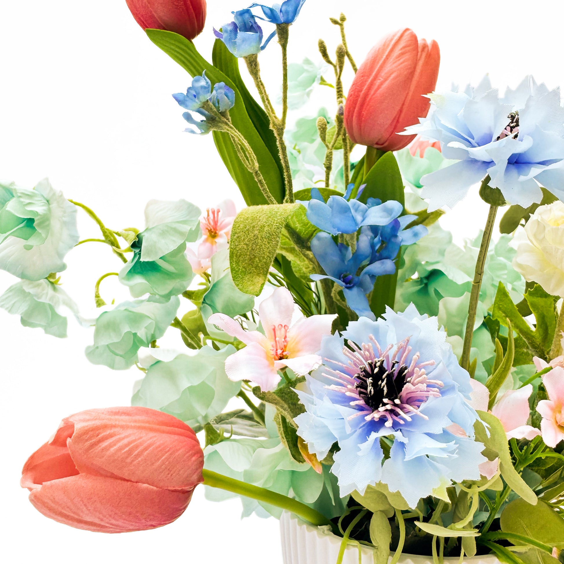 万人受けする愛らしいチューリップをメインに、落ち着いたグリーンのスイートピー、華やかに咲き誇るブルーが知的なスカビオサ、元気な印象を与えるイエローのラナンキュラス、星形がかわいいブルースター、フワッと優しい花ニゲラ、愛らしいブロッサムスプレーなどがまさに豪華共演。