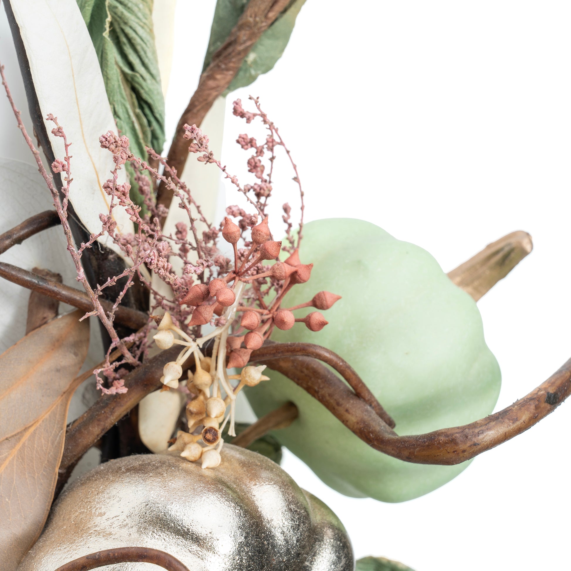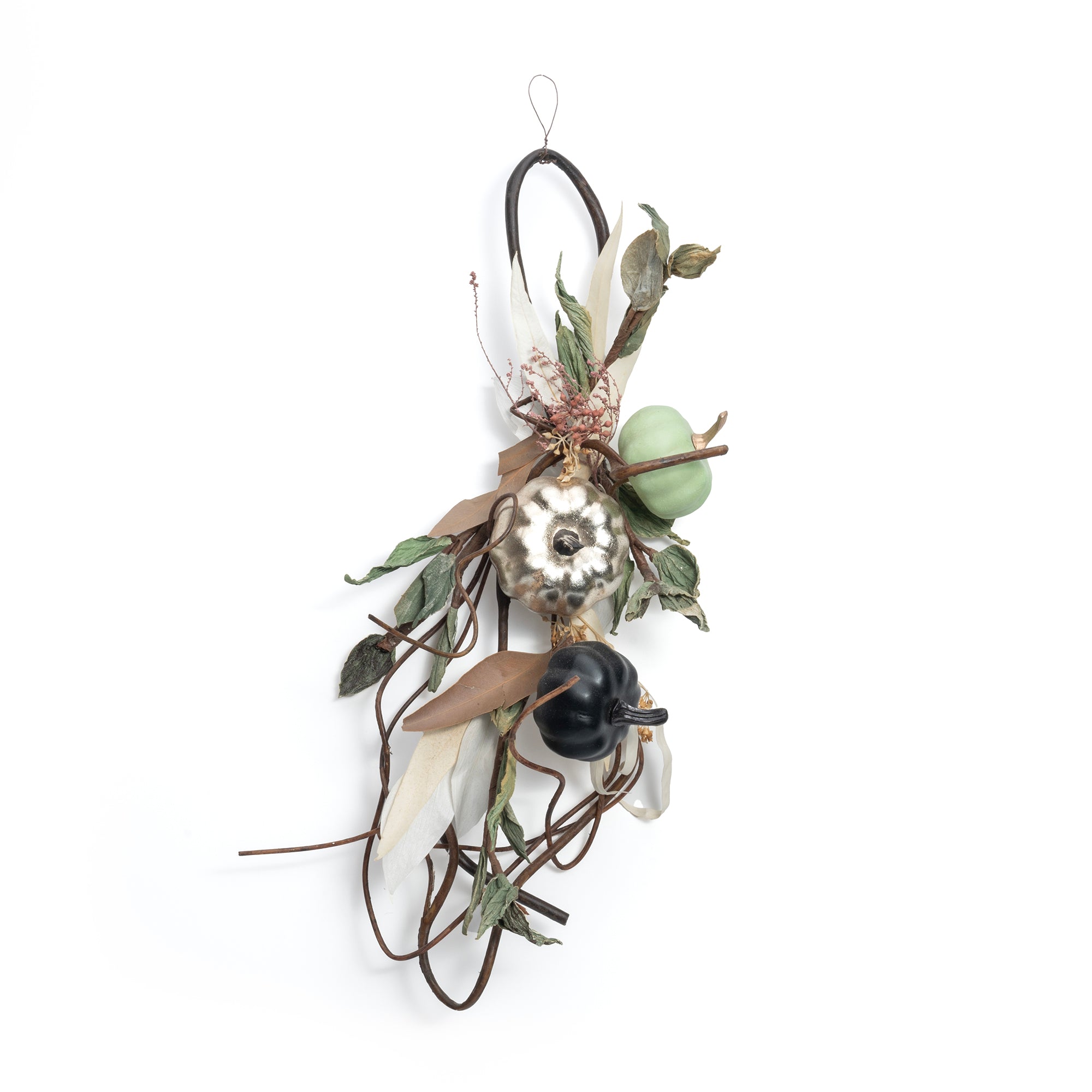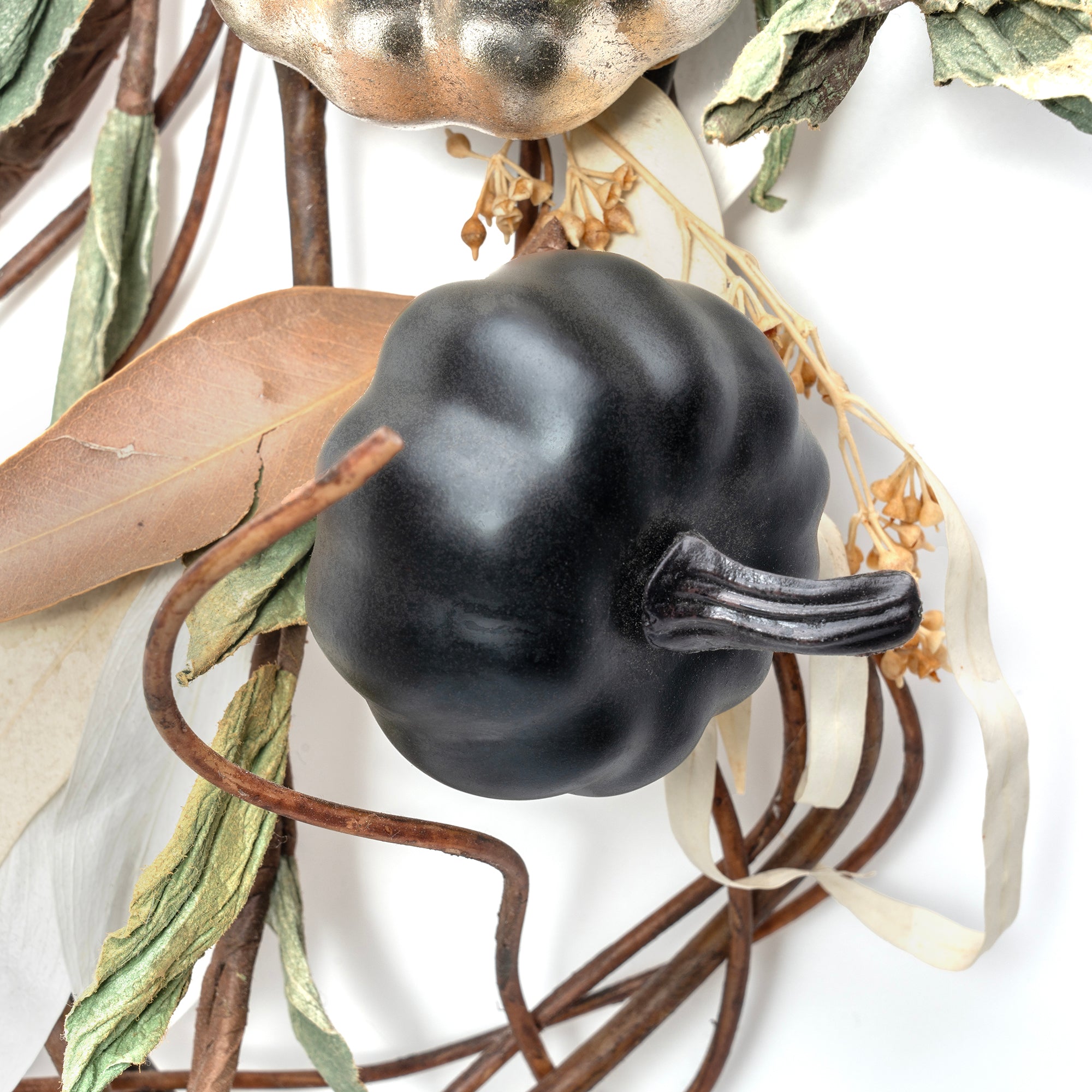 ブラックパンプキンをメインにモダンかつシックさを醸し出す都会的なアレンジメントです。カラフルな空間が苦手な方や、落ち着いた装飾をお探しの方におススメです。シンプルの中にもインテリアとしてイノベーティブなファッションセンスを感じさせる秀逸なアイテムです。老若男女問わず使いやすいため、プレゼントにも。