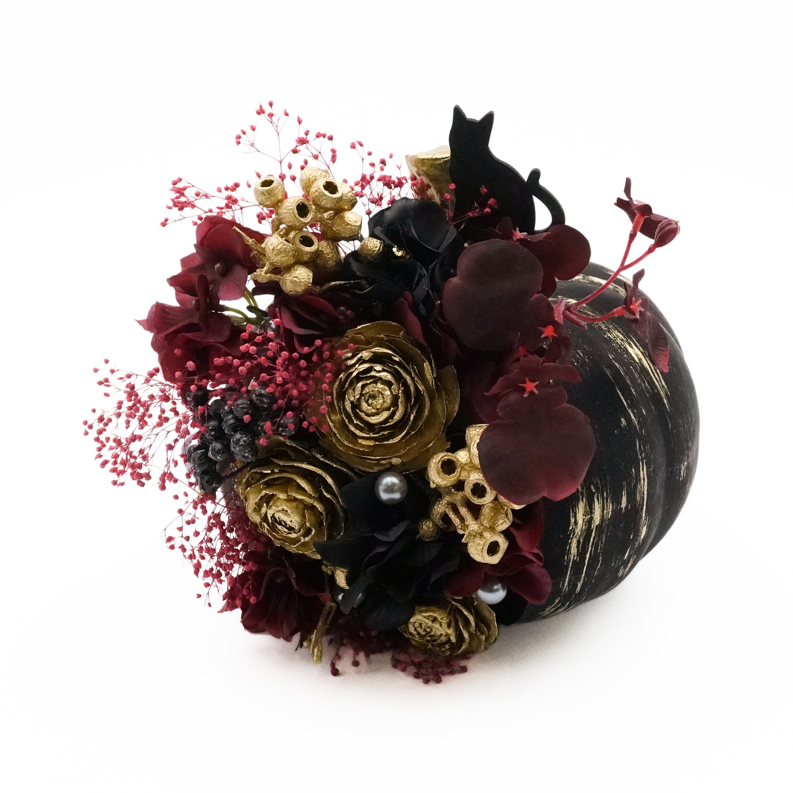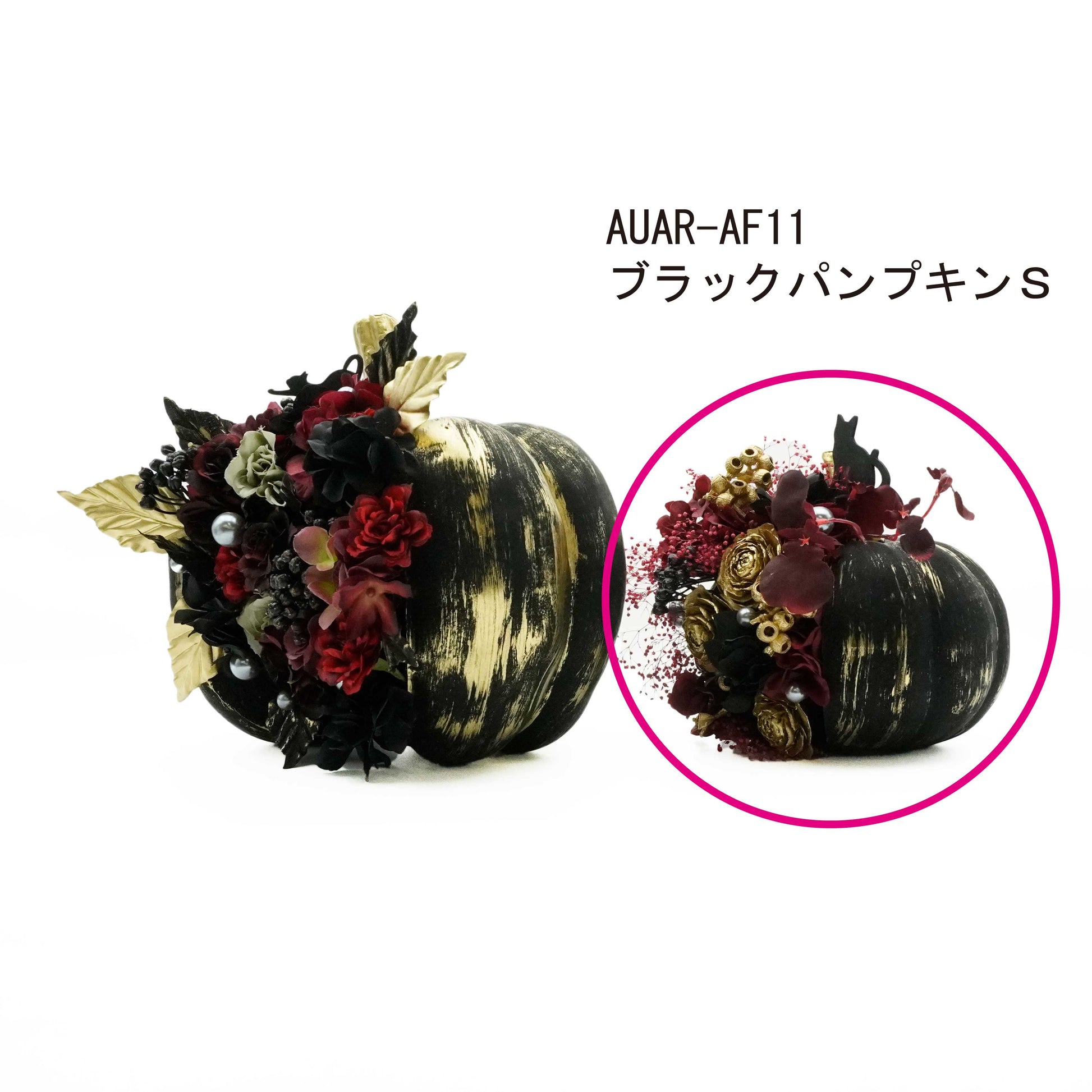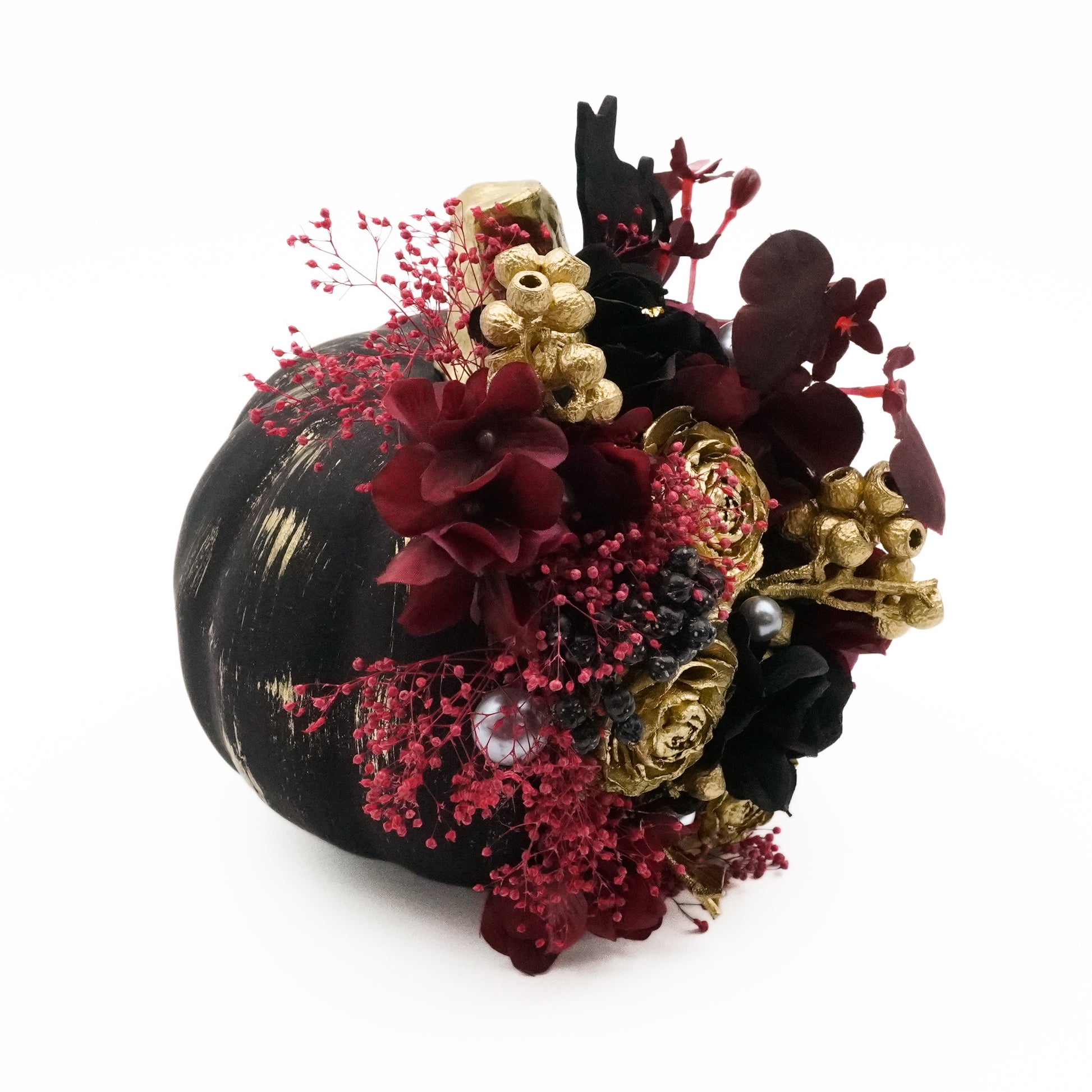 ブラックパンプキンSは、バラやアジサイ、シルバーピック、カスミソウが華やかさを演出し、シックでエレガントな高級感のあるインテリアです。ハロウィンのパーティースペースなどの小物としても使い勝手が良く、玄関やウェルカムスペースなどに飾るだけで、場が華やぐでしょう。<注:ドライフラワーは乾燥しているため、散りやすいものや壊れやすい場合がございます。繊細な商品なため飾る場所や季節等により、ご購入後の色の変化や劣化具合は異なります。>
