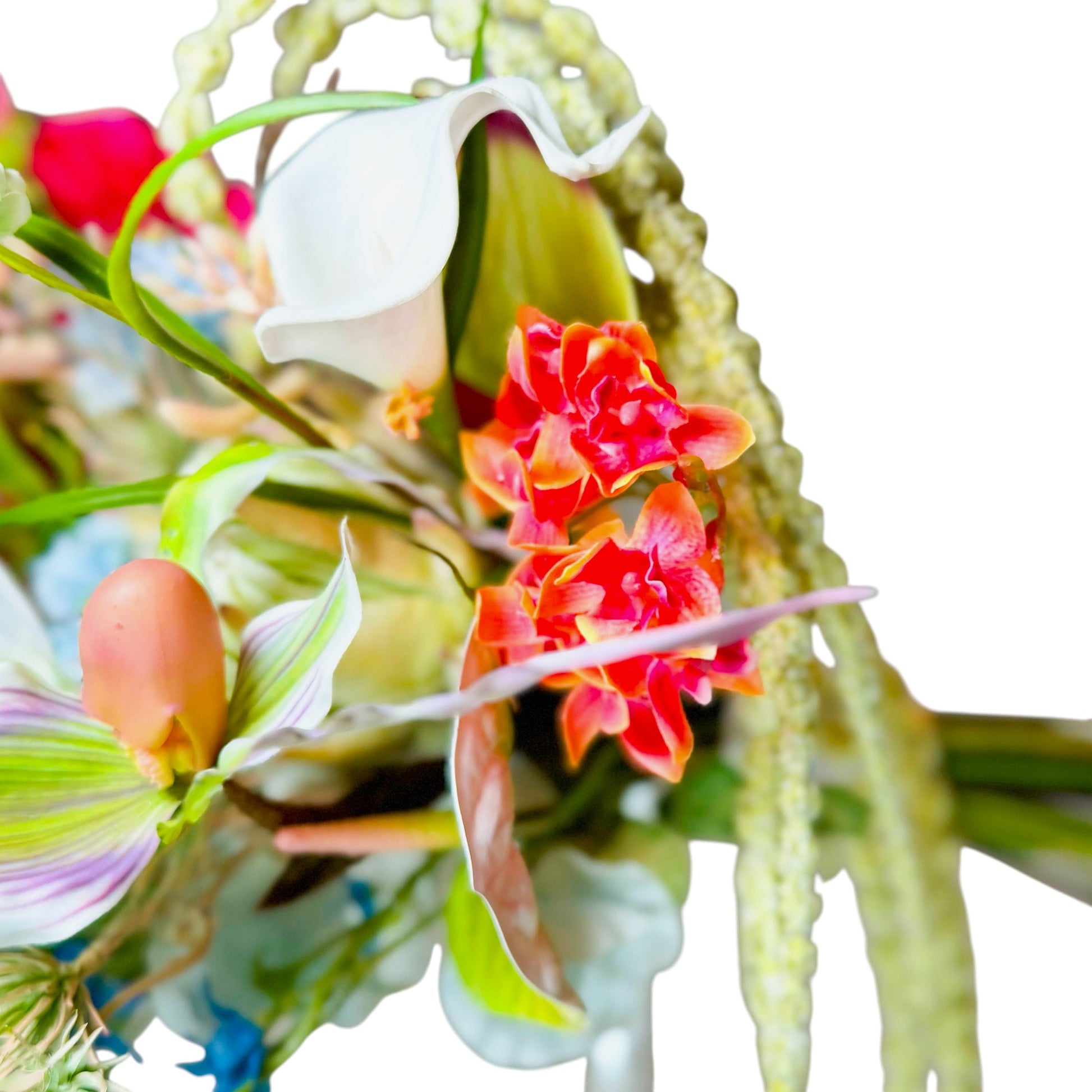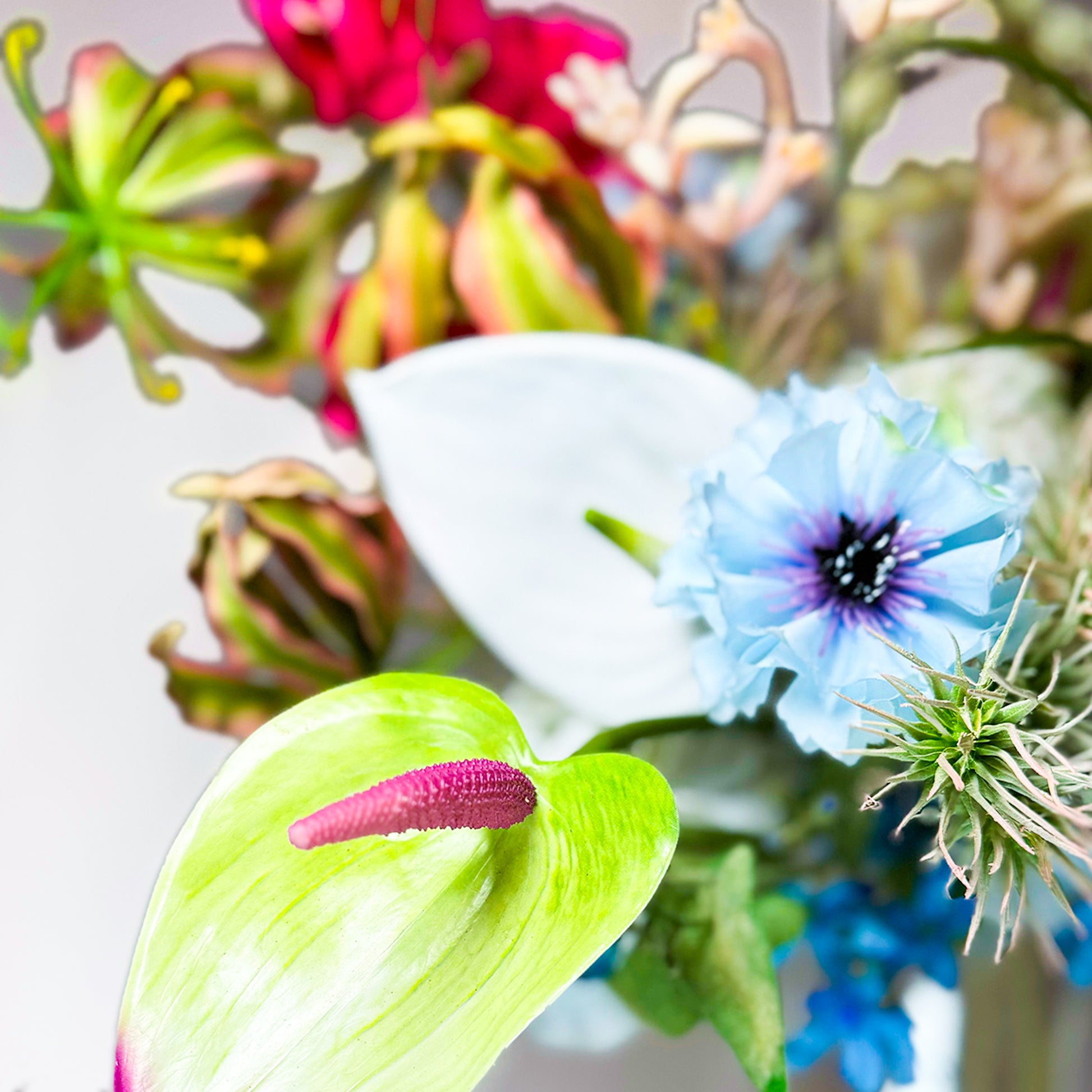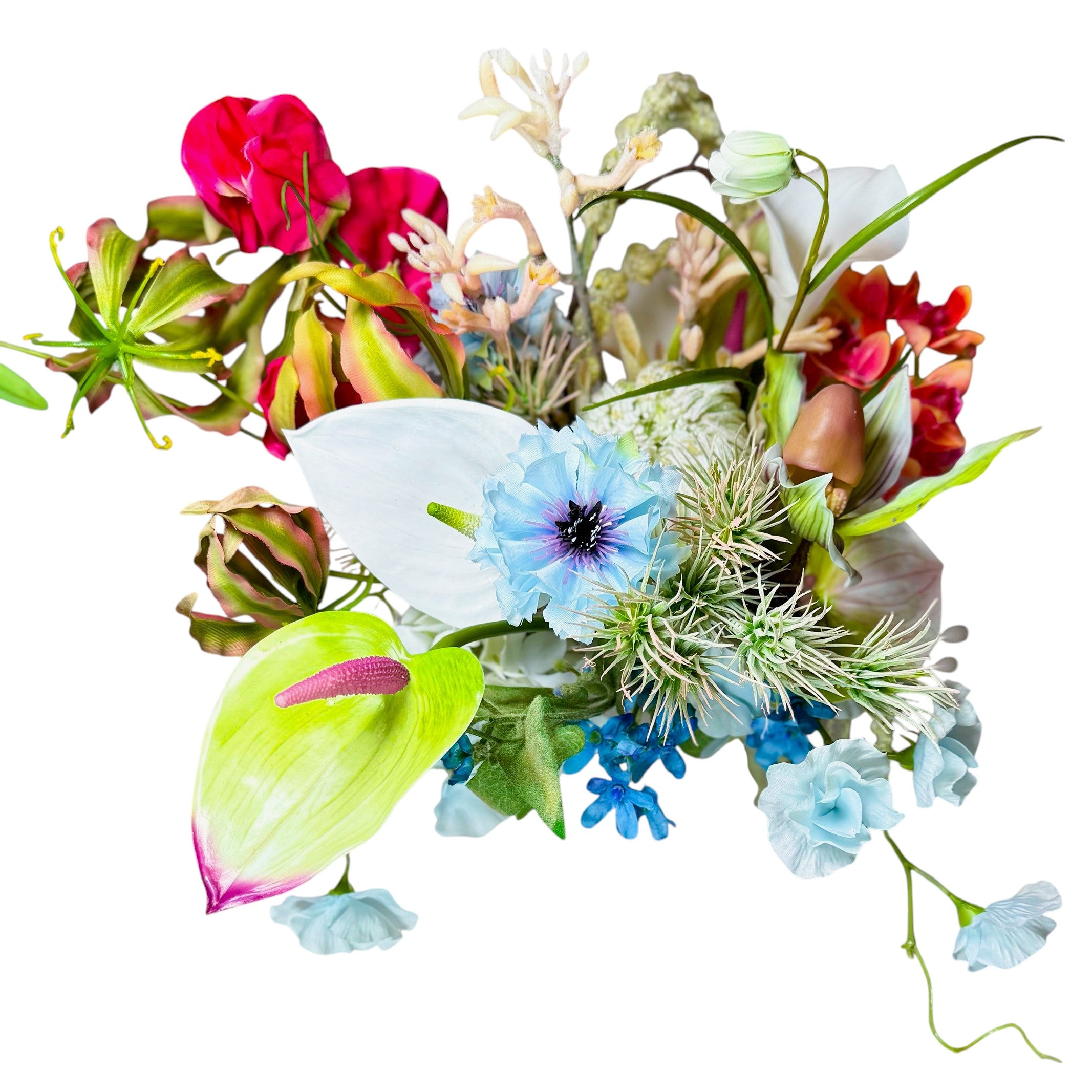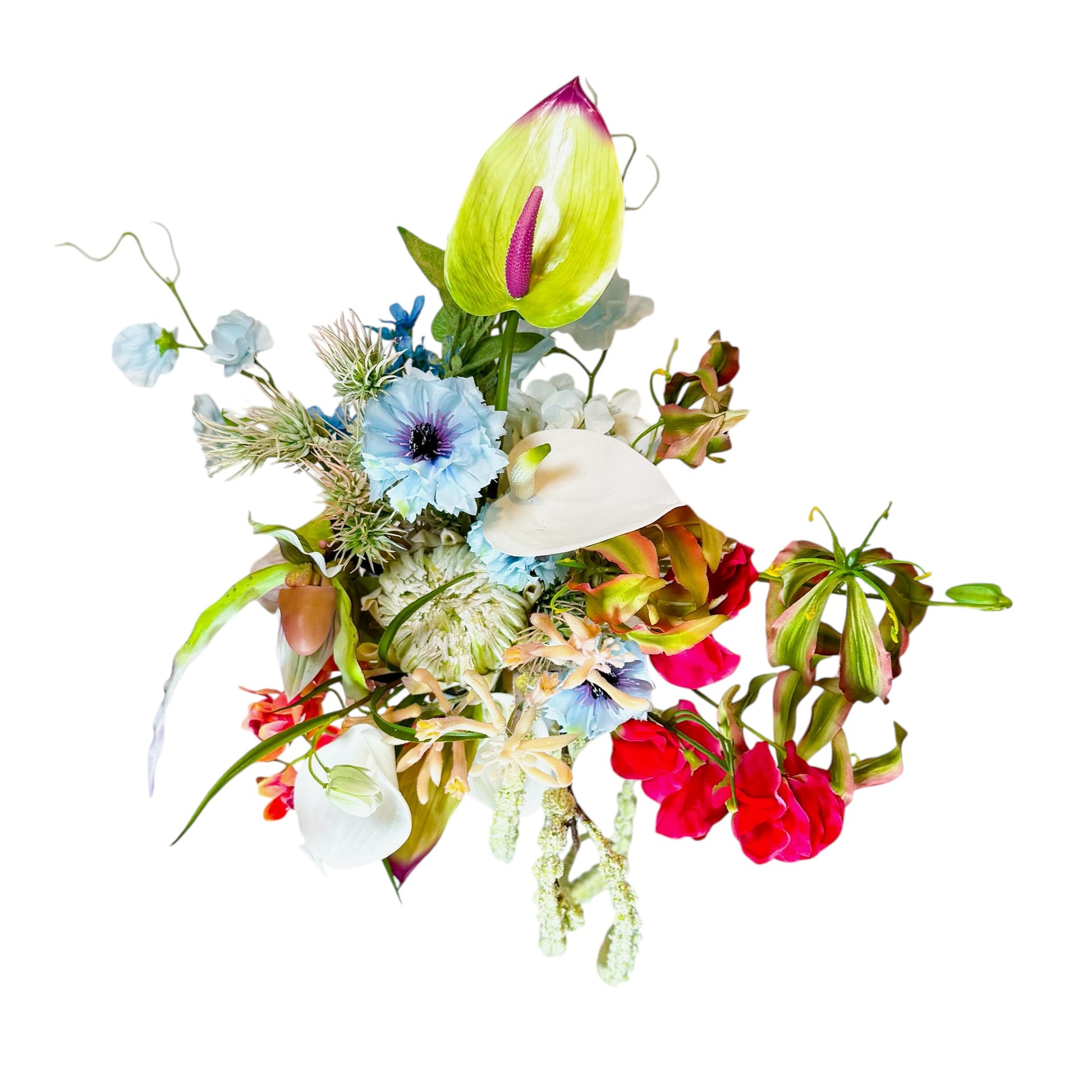 - 花材:スイートピー、蘭、スイートピー、白あじさい、グロリオサ、アンスリウム、カンガルーポー、コーンフラワー、あざみ、プロテア
