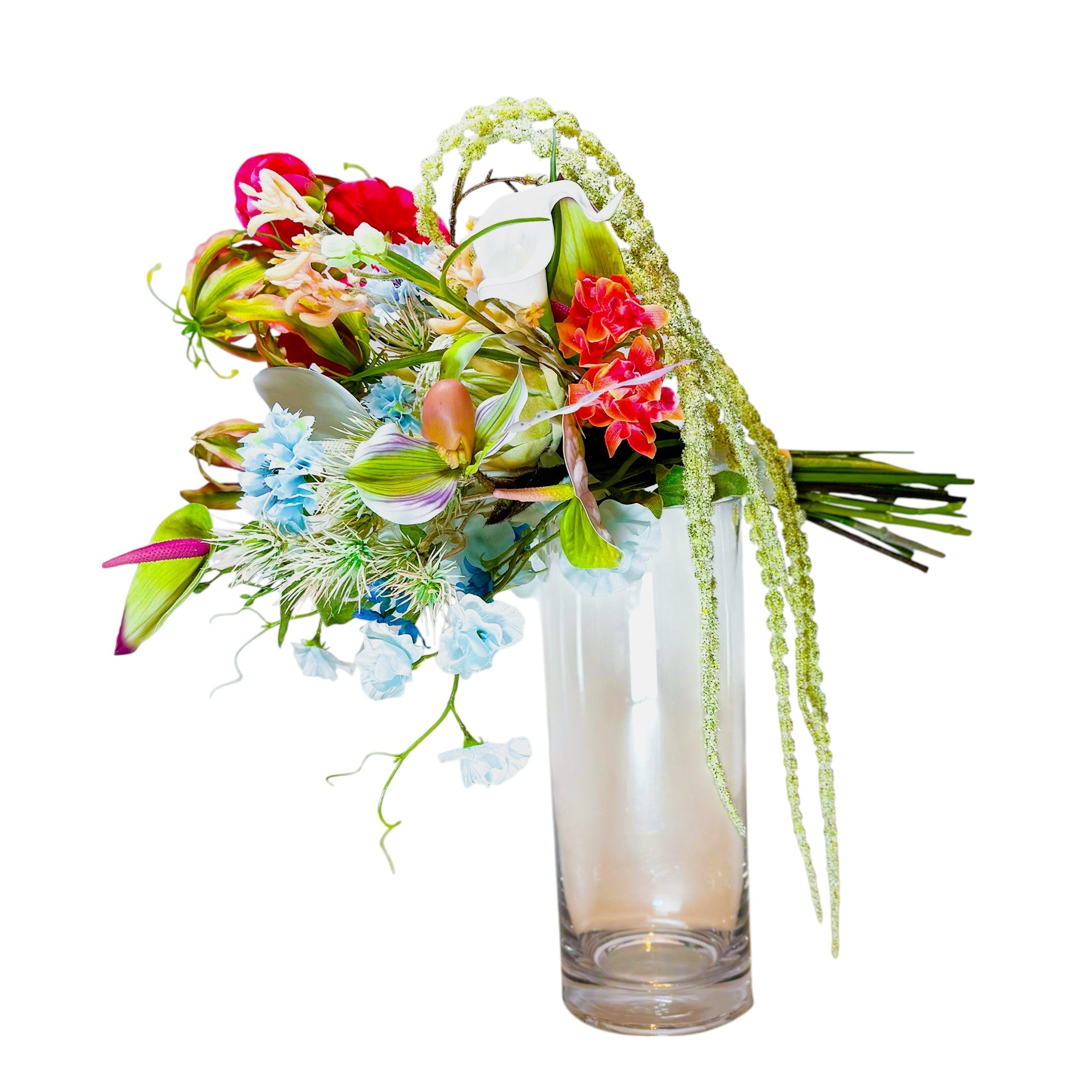 まるで海辺にいるかのような爽やかなアレンジメントは、青空を思わせるスカイブルーのスイートピーやコーンフラワー、白い砂浜をイメージさせるアンスリウムや紫陽花、そして太陽のように鮮やかなオレンジやピンクの蘭、プロテアが華やかさを添えています。さらに、あざみやカンガルーポー、グロリオサがボリュームとモード感をプラス。持ち手には純白のリボン付です。