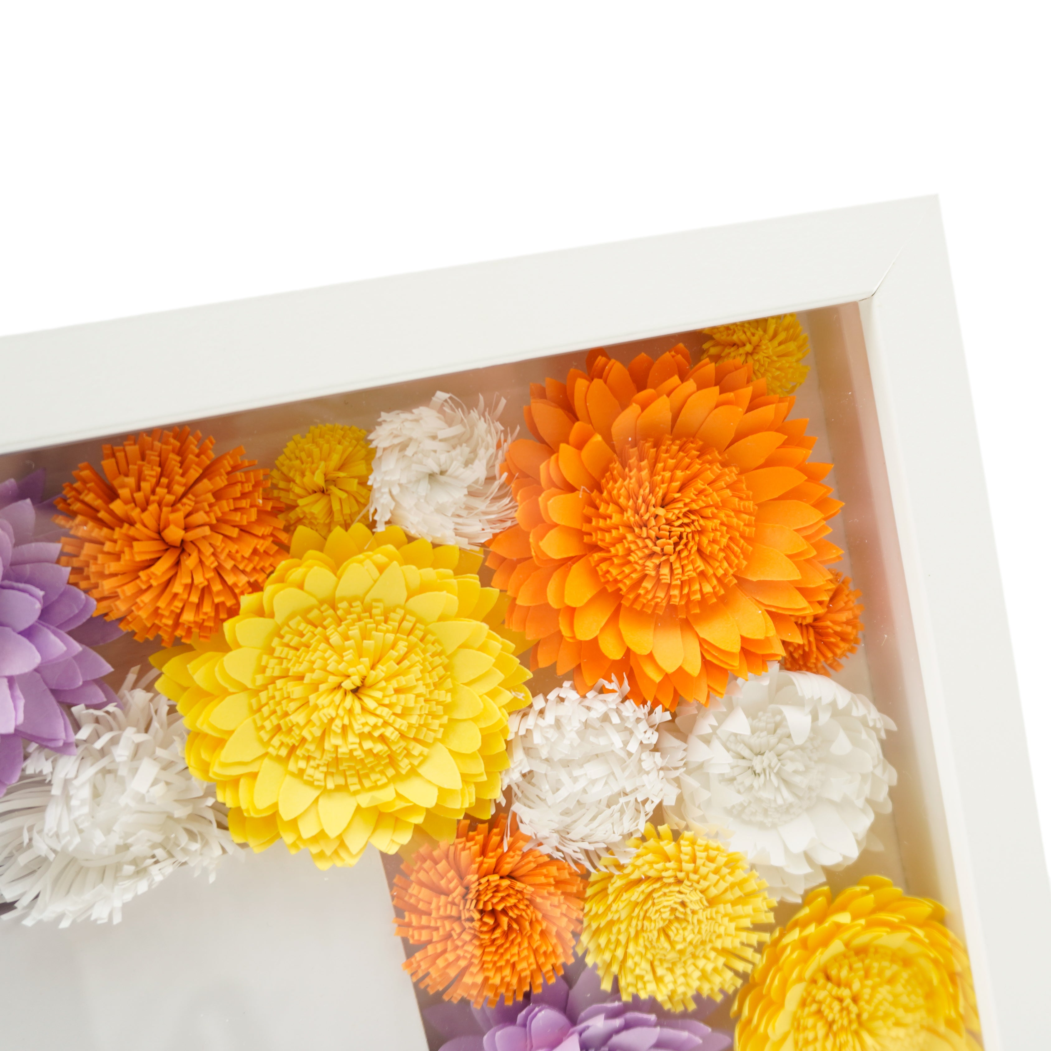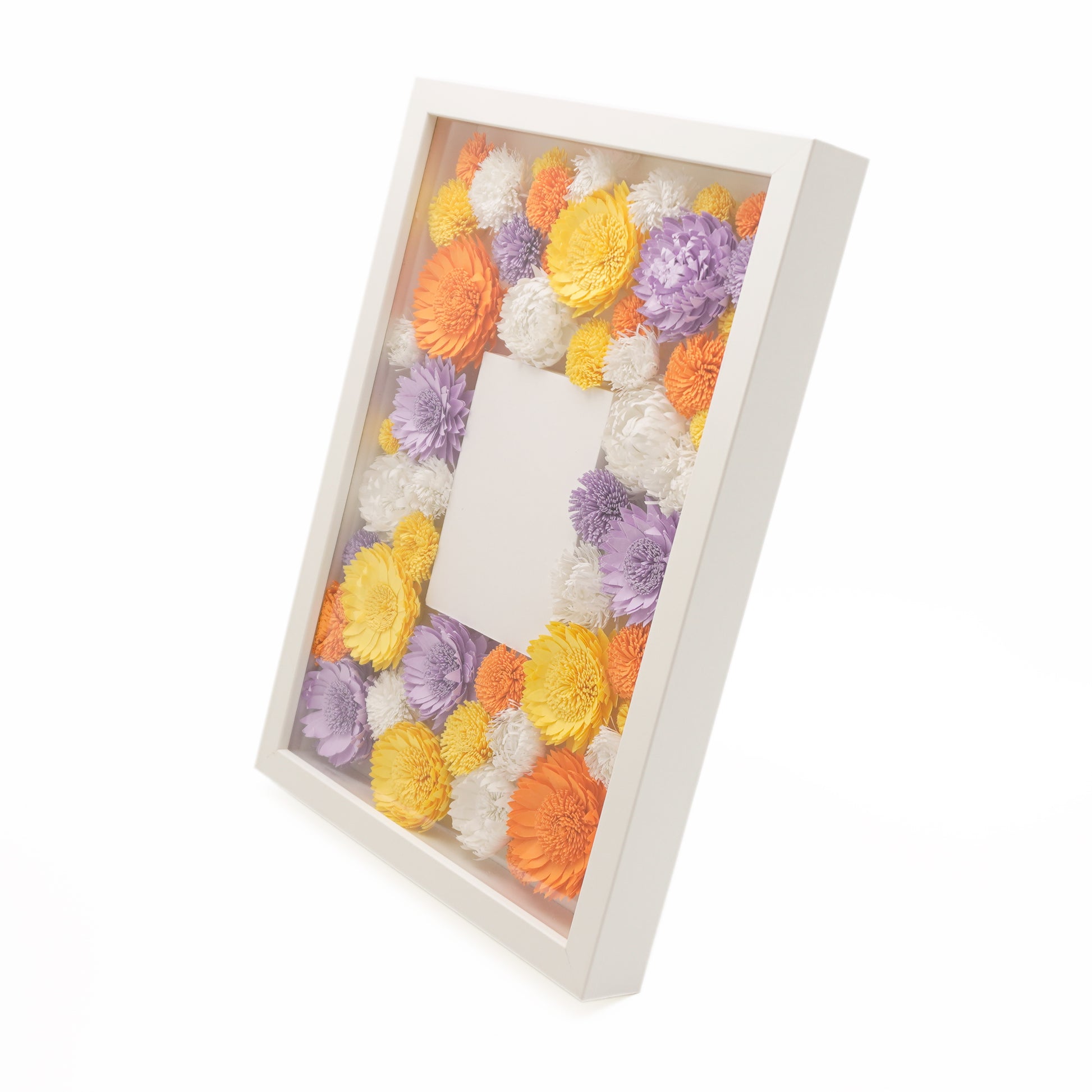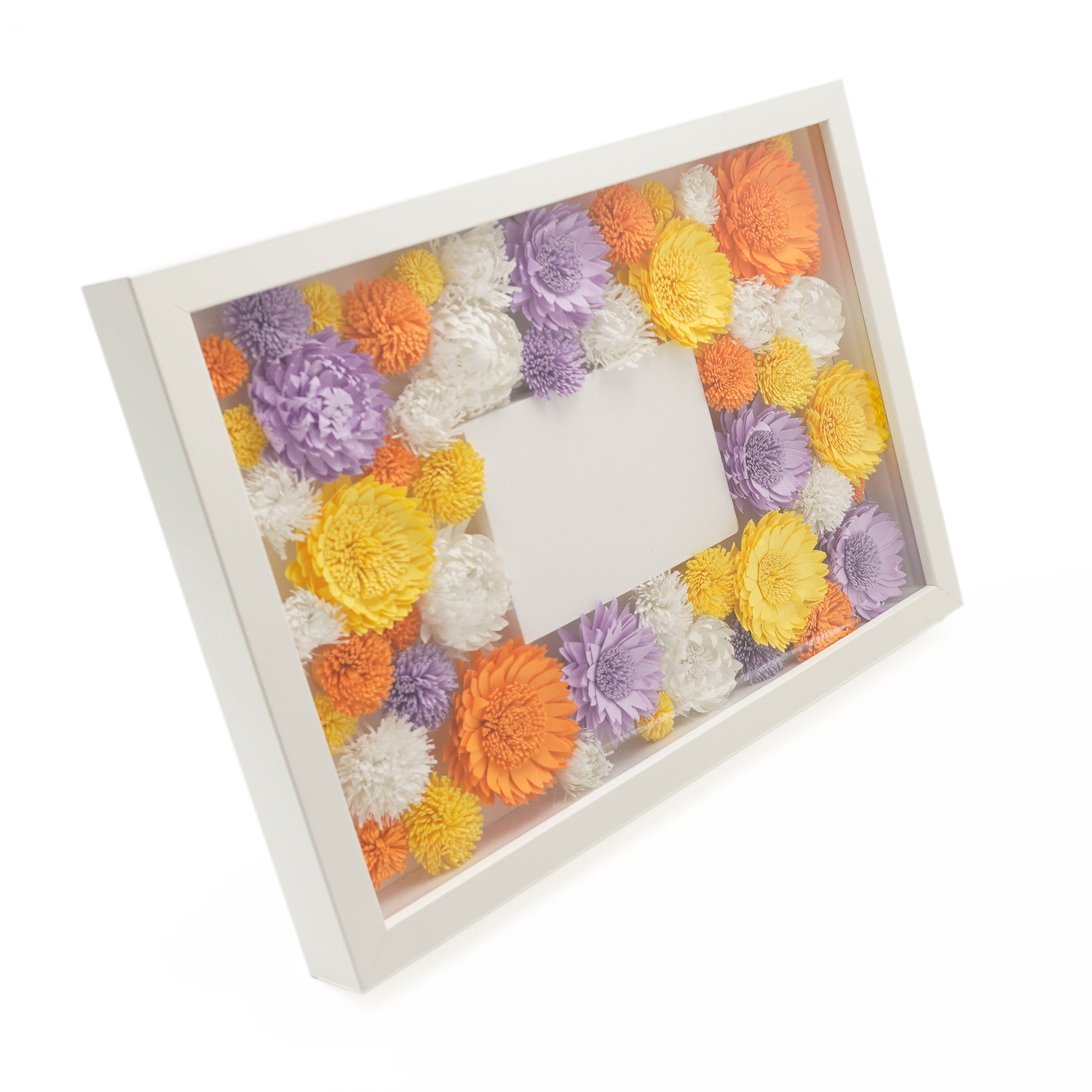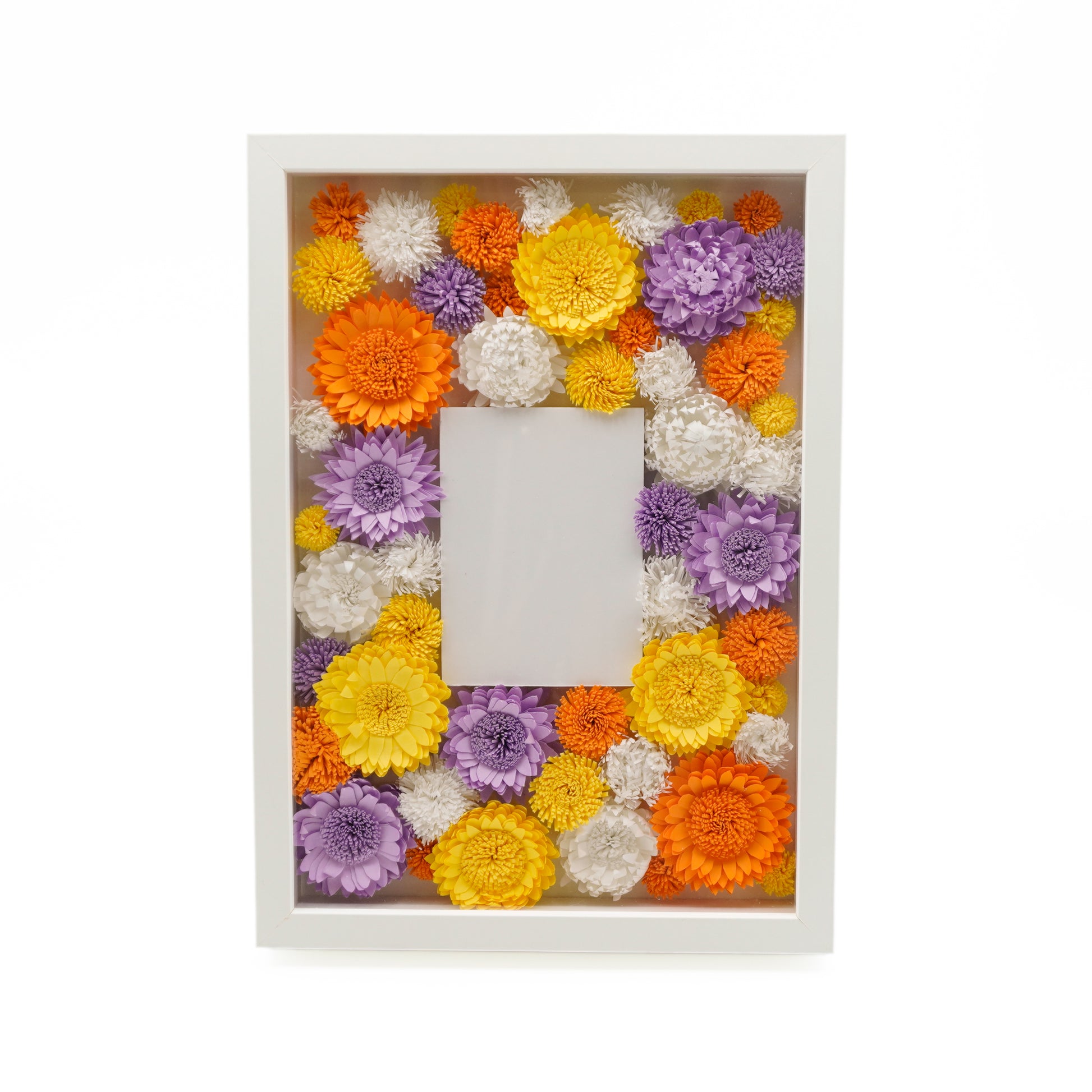 熟練の職人によるペーパーフラワーは1輪ずつ繊細につくられており、プレゼントとしておすすめです。黄、オレンジ、紫、白、明るく秋らしいカラフルな色使いが魅力的な一品で、中央にメッセージや写真をいれて世界でひとつだけのオリジナルなボックスフラワーにできます。壁掛けでも置き式でもどこにでも飾れますので、お部屋を飾る小物としても、空間のすき間を美しく装飾するためにも良い装飾です。<注:この商品は色あせの原因となりますので直射日光、湿気の多い場所に飾るのはお控えください。><注:中央のメッセージカード、写真等は付属しません。ご自由にアレンジしてお楽しみください。>