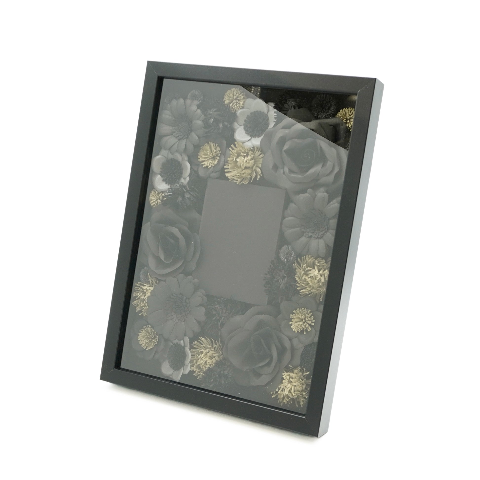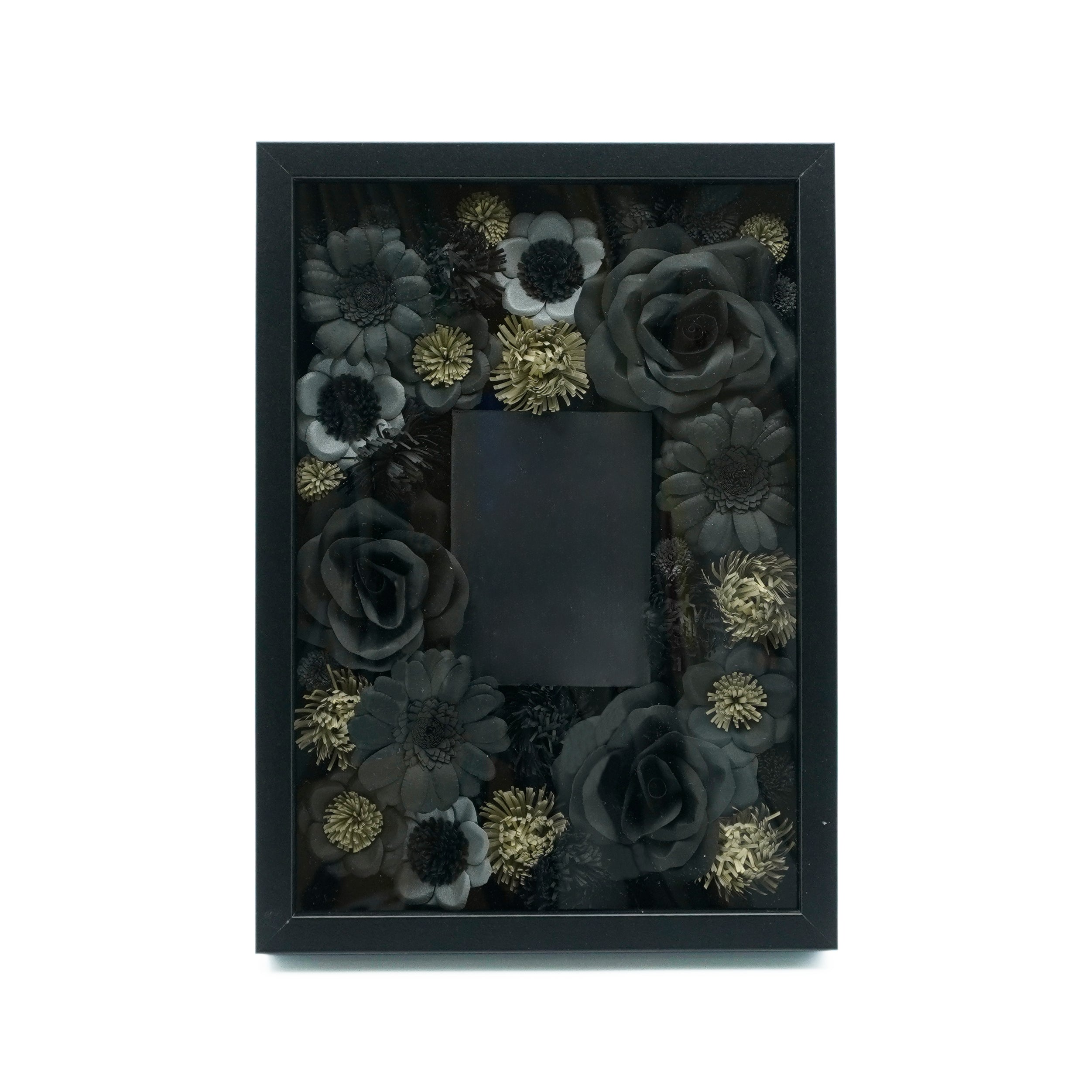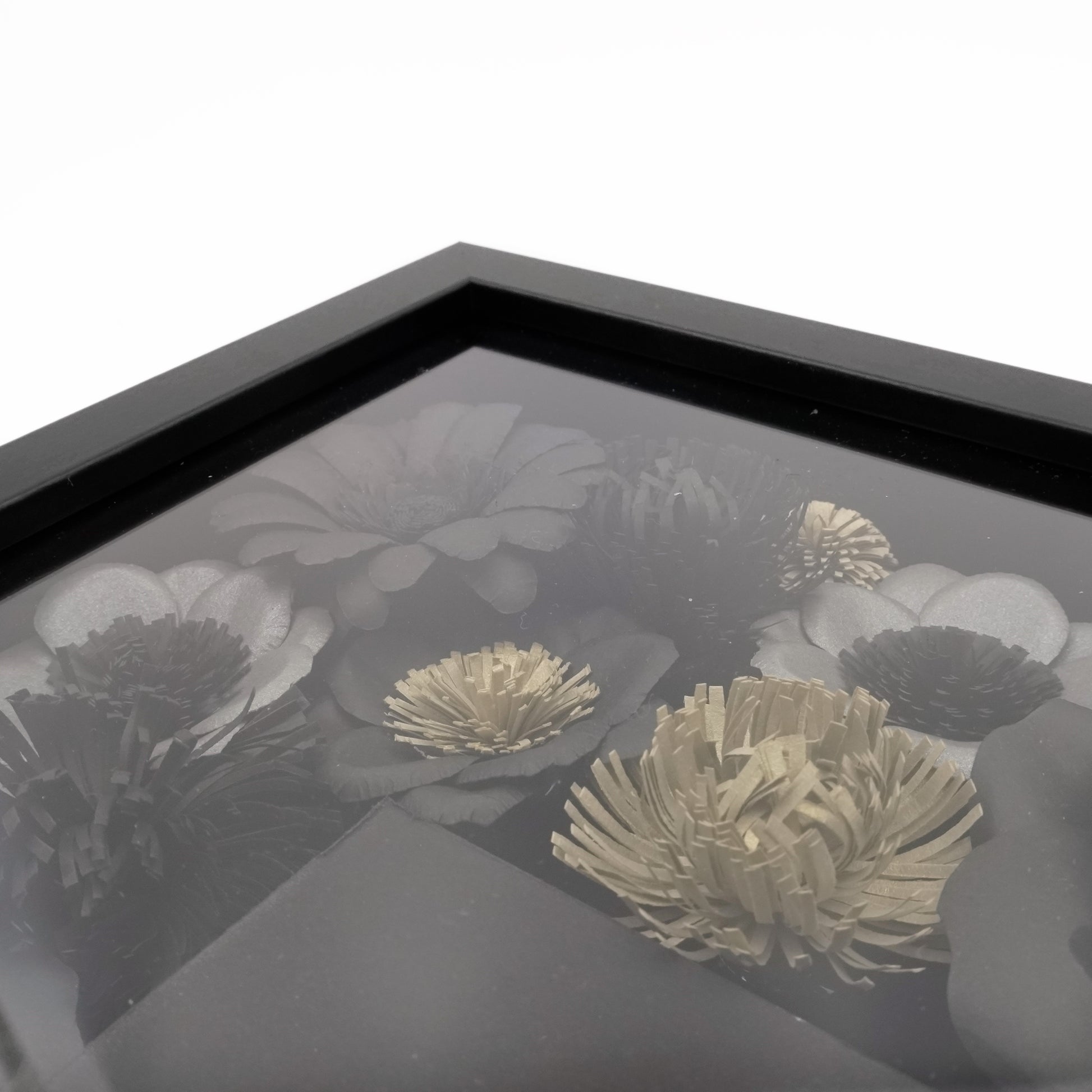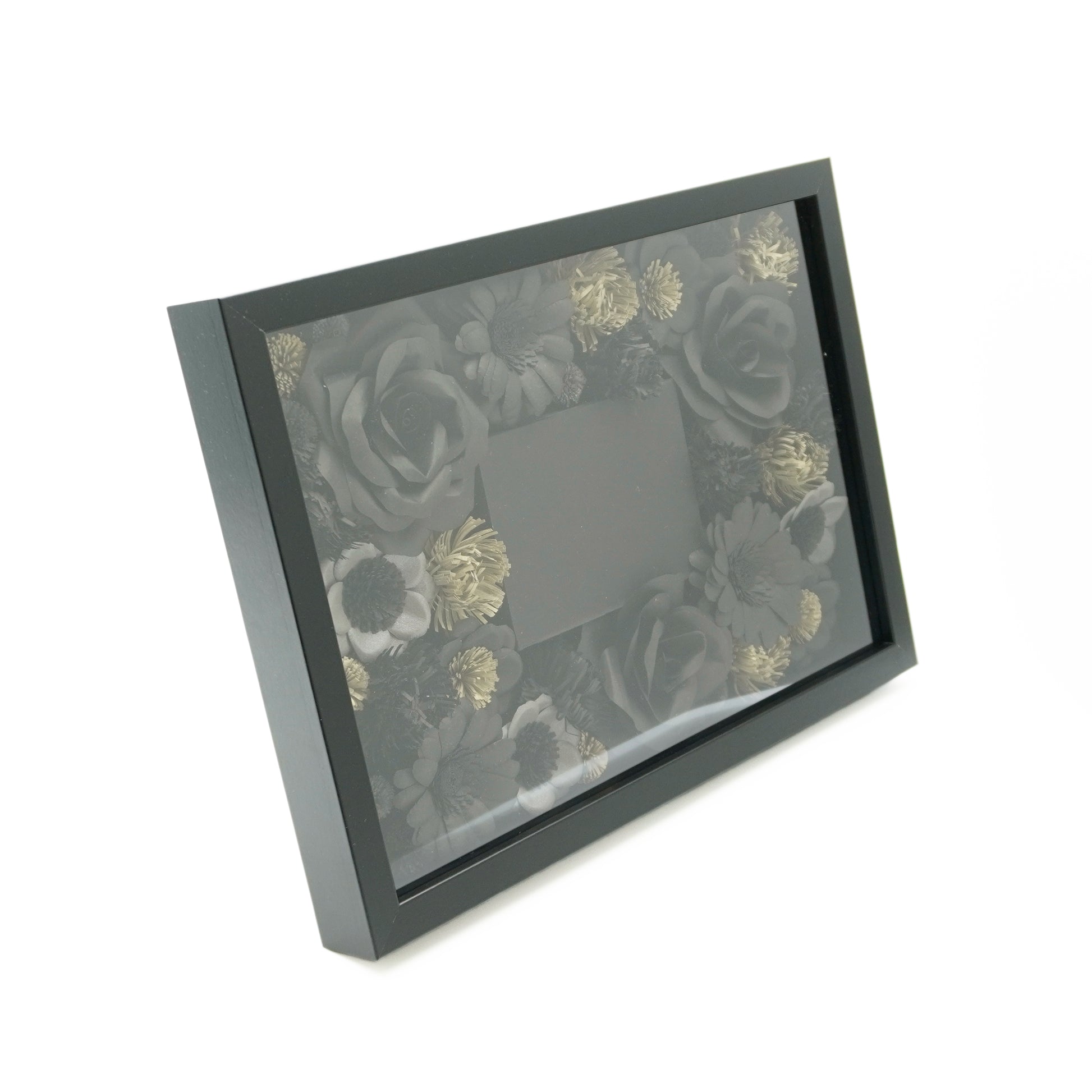 熟練の職人によるペーパーフラワーは1輪ずつ繊細につくられており、プレゼントとしておすすめです。シックなモノトーンの色使いが魅力的な一品で、中央にメッセージや写真をいれて世界でひとつだけのオリジナルなボックスフラワーにできます。壁掛けでも置き式でもどこにでも飾れますので、お部屋を飾る小物としても、空間のすき間を美しく装飾するためにも良い装飾です。<注:この商品は色あせの原因となりますので直射日光、湿気の多い場所に飾るのはお控えください。><注:中央のメッセージカード、写真等は付属しません。ご自由にアレンジしてお楽しみください。>