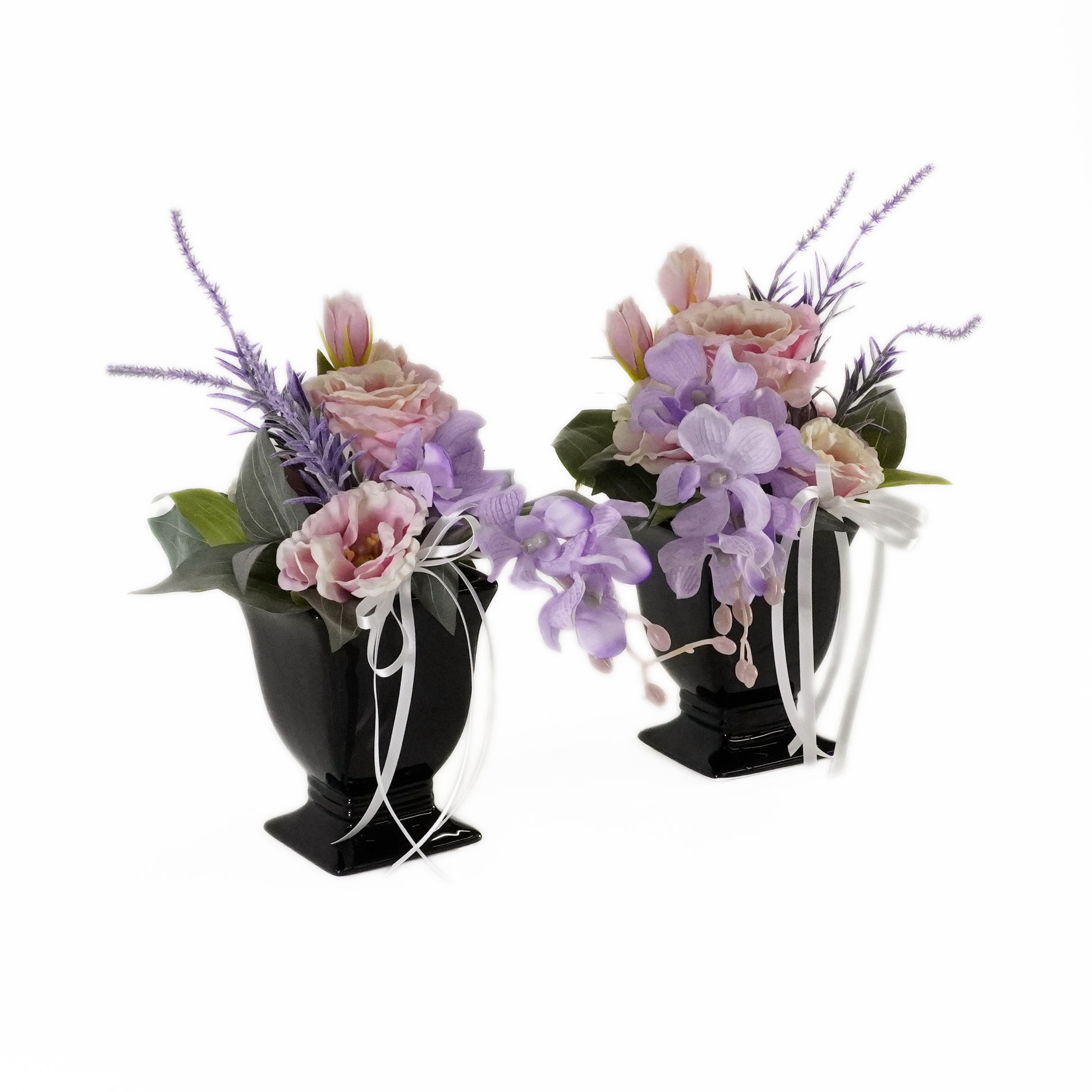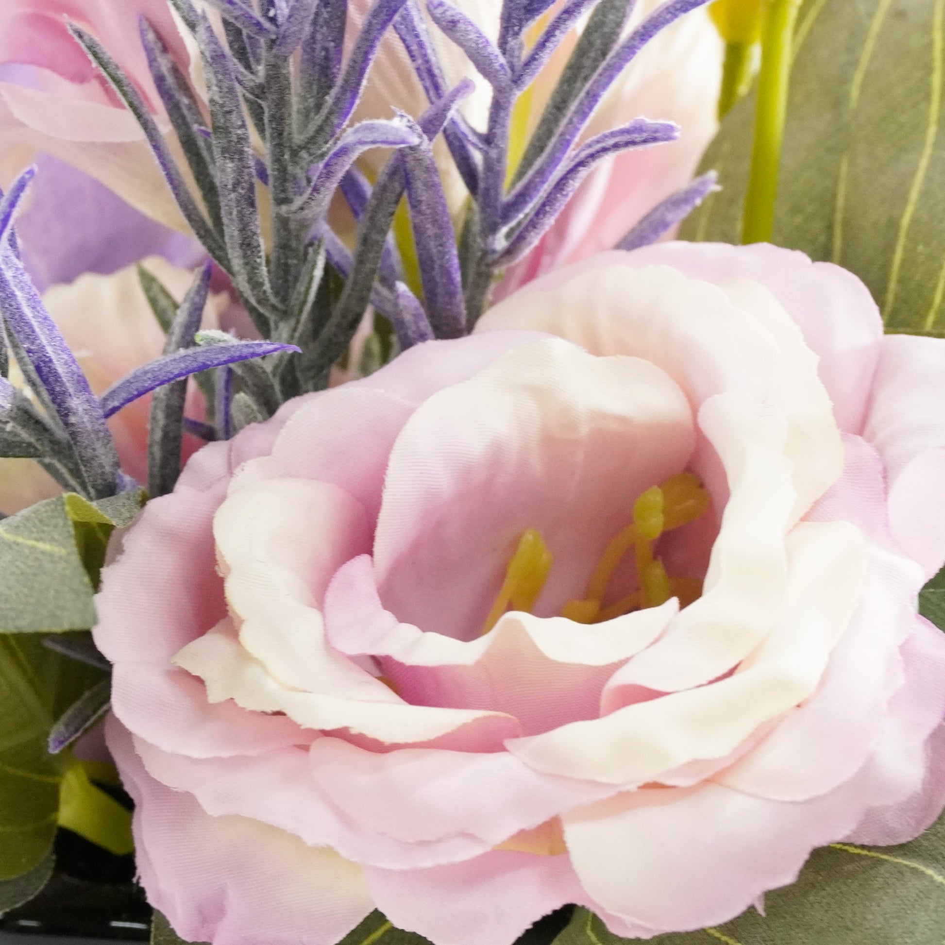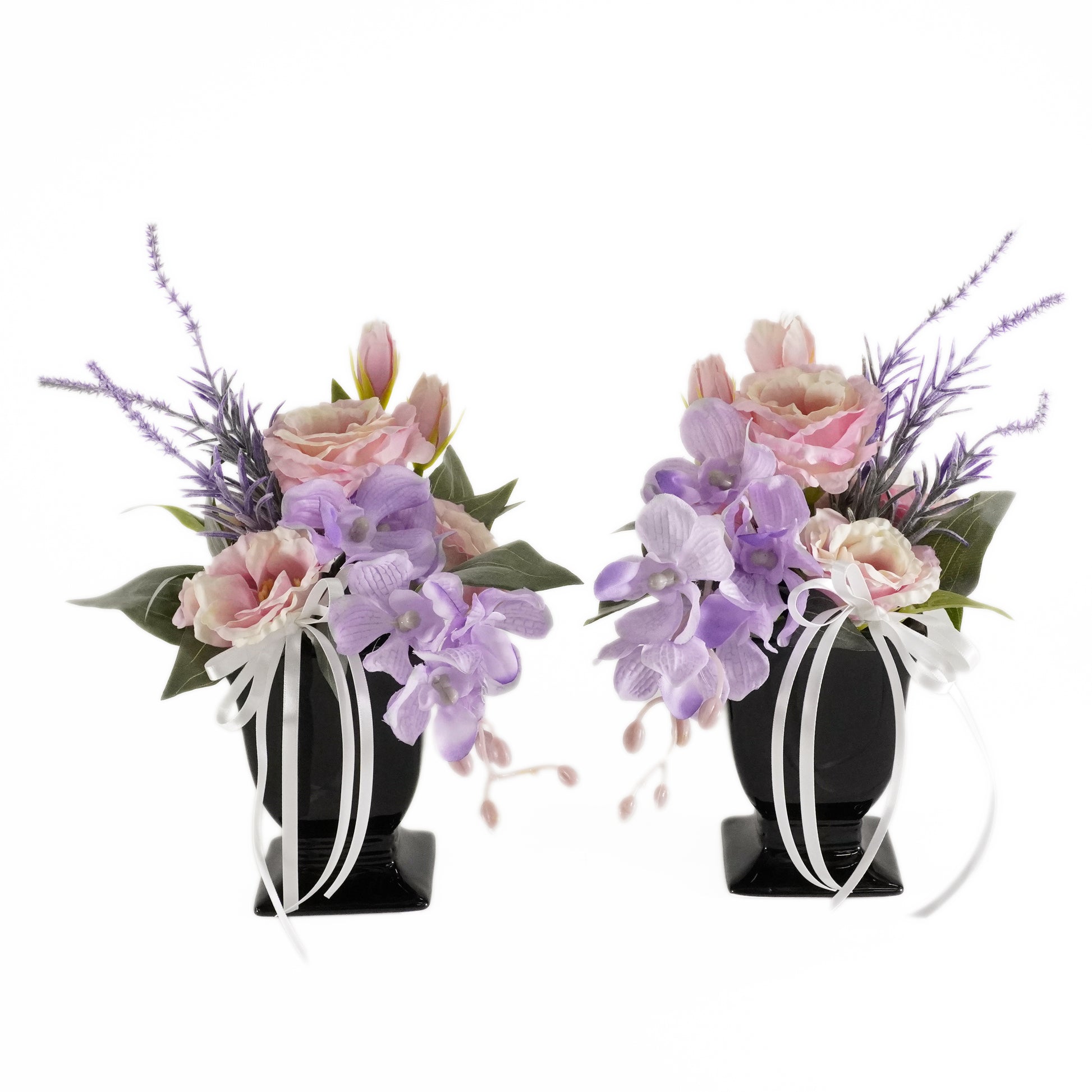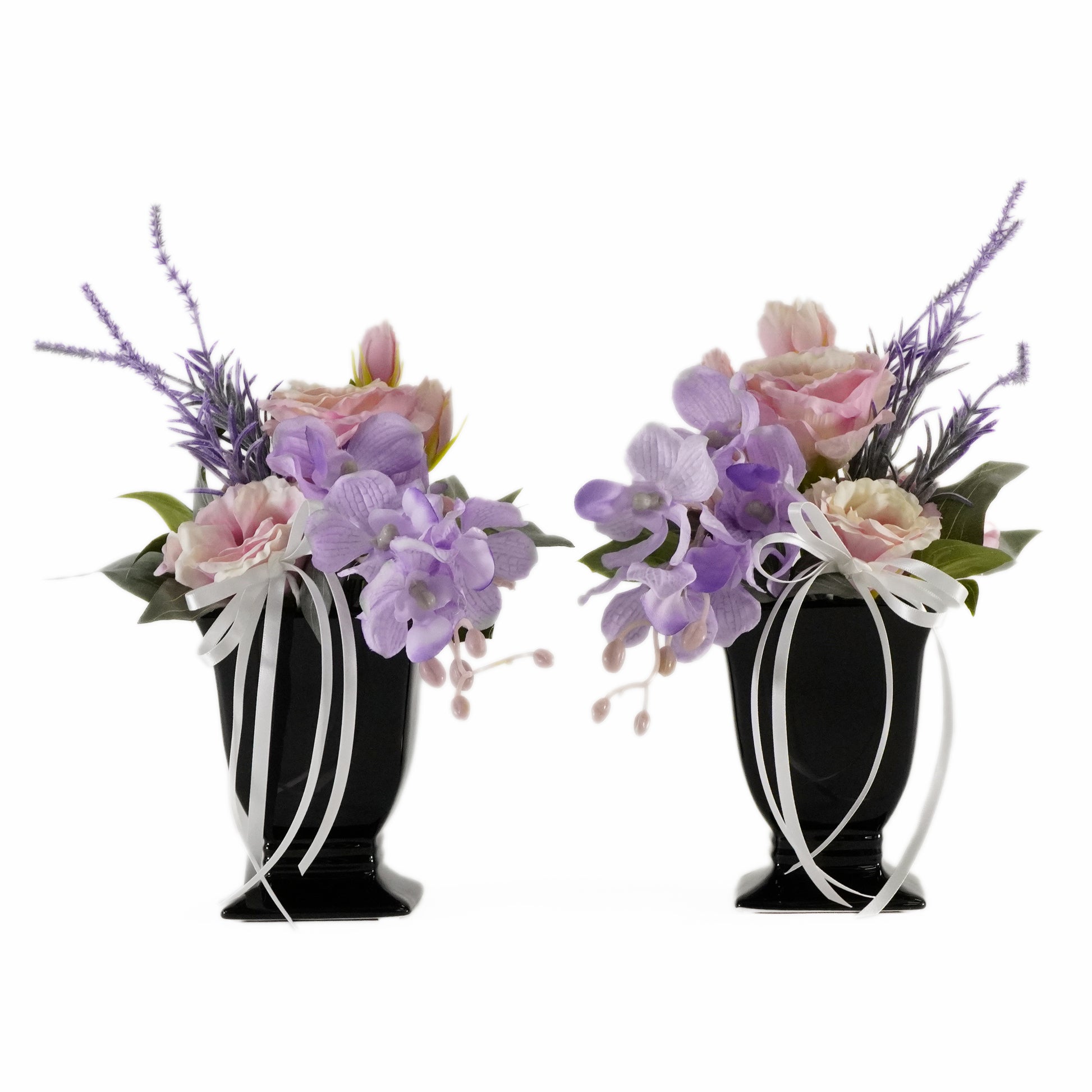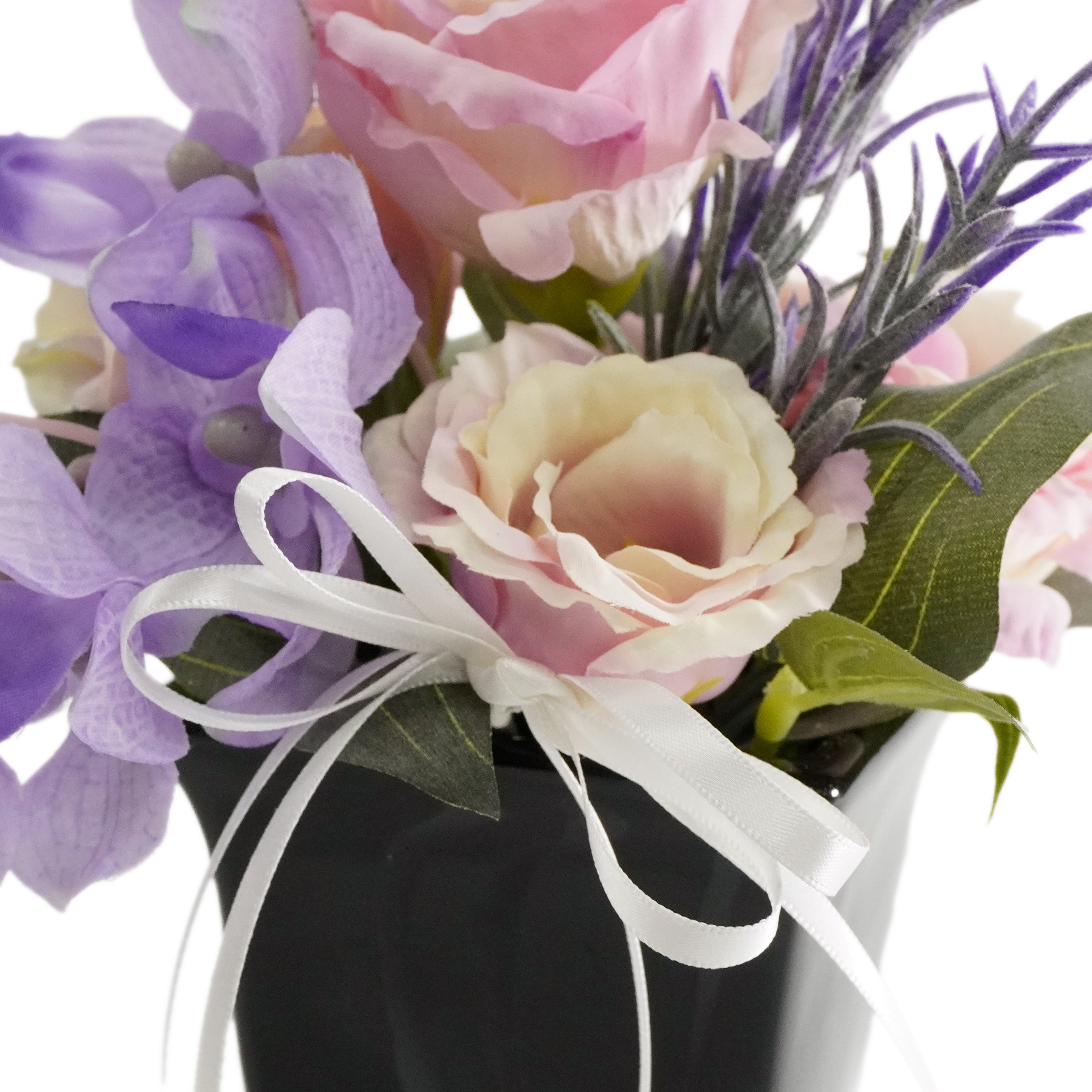 - 花材:造花(リシアンサス、ラベンダー、オーキッドなど)/サテンリボン/花器