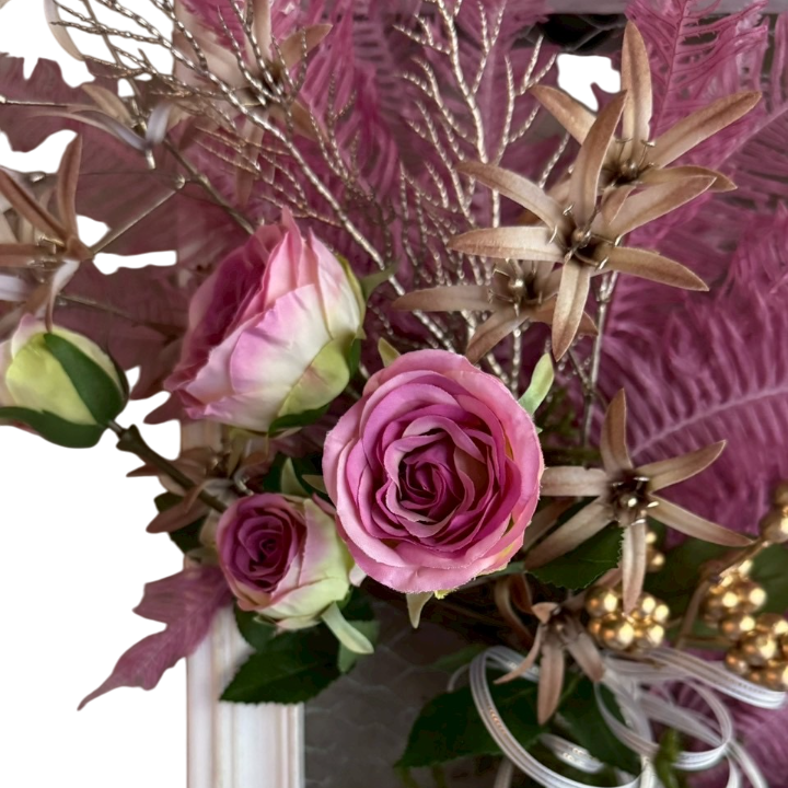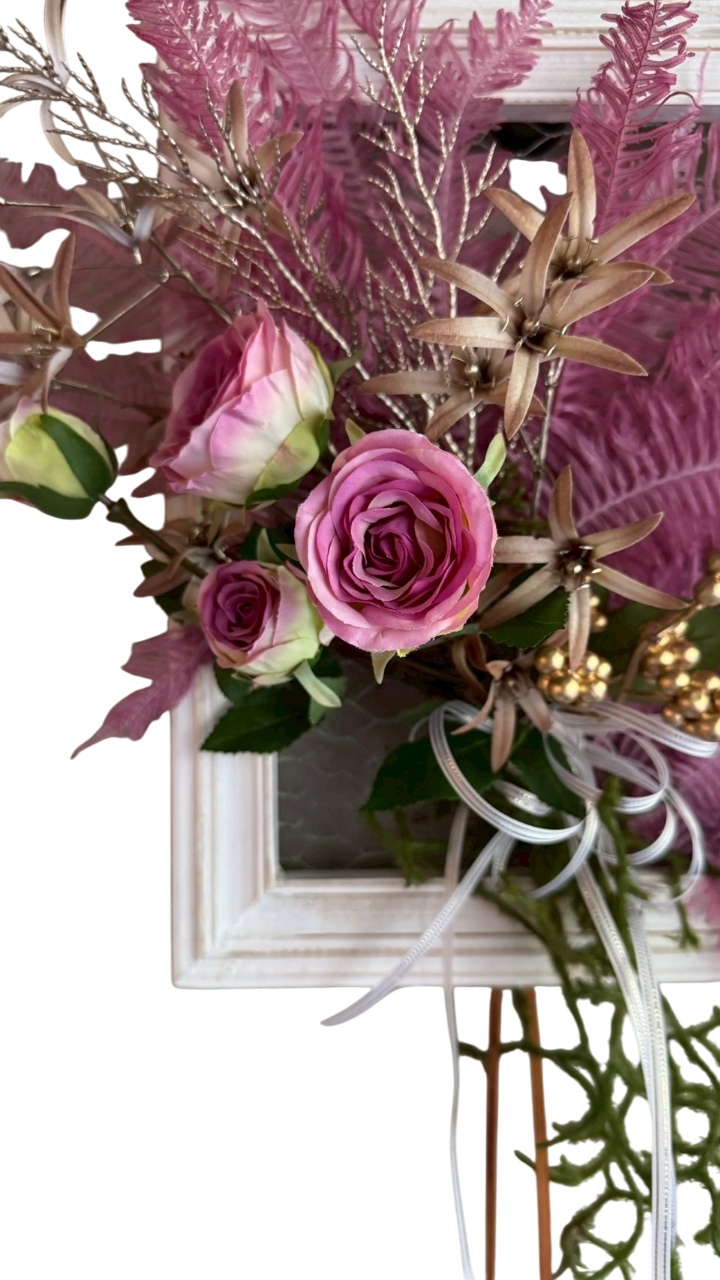 ホワイトのフレームに、溢れんばかりのピンクシダとヒカゲノカズラ、そしてゴールドのシダを贅沢にデコレーション。