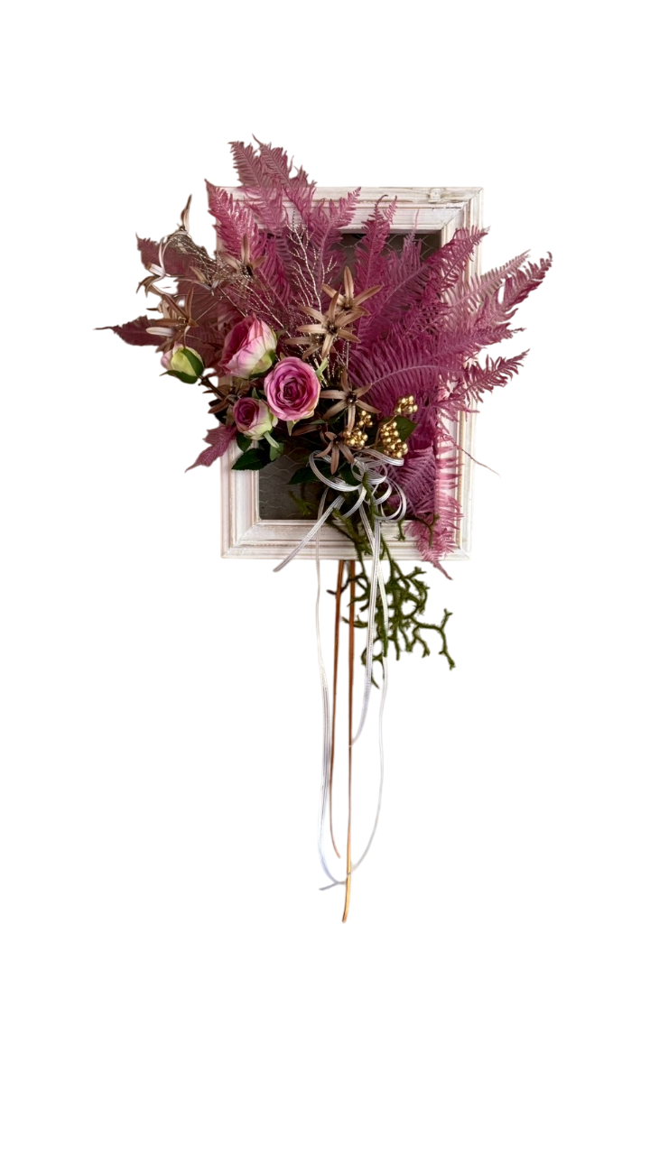 そのまま壁に立てかけたり、壁やドアに吊るすだけで空間を華やかに演出するフレームアレンジメント。