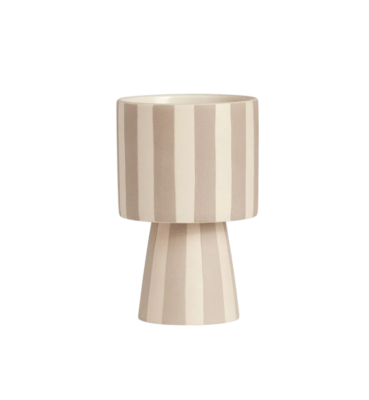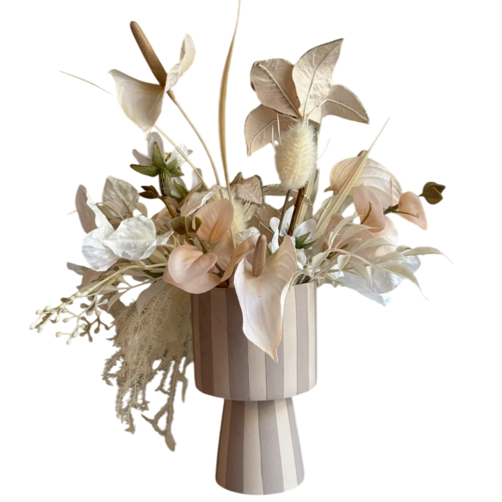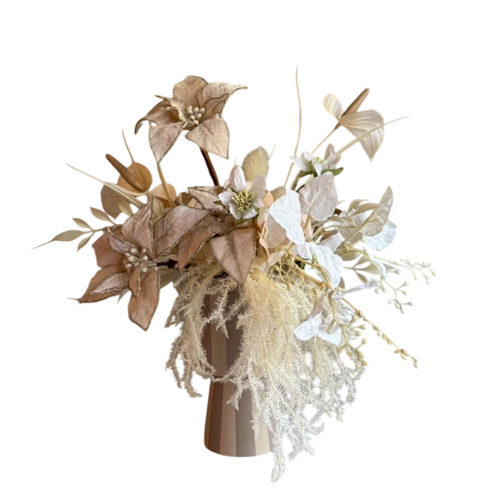 エクリュトーンの陶器の花器には、ノーブルなべージュトーンで統一されたヒカゲノカズラ、アンスリウム、ホワイトリーフ、ラスカスの葉、ラメが施されたポインセチアがアレンジされています。