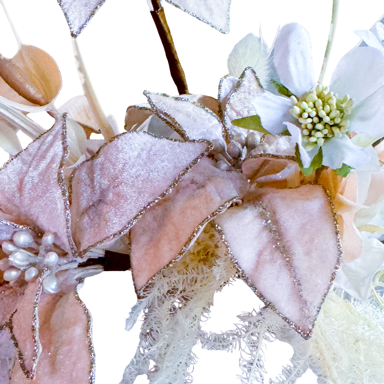 - 花材:ヒカゲノカズラ、ベージュのポインセチア、アンスリウム、ホワイトリーフ、ラスカスの葉 ・その他:花器