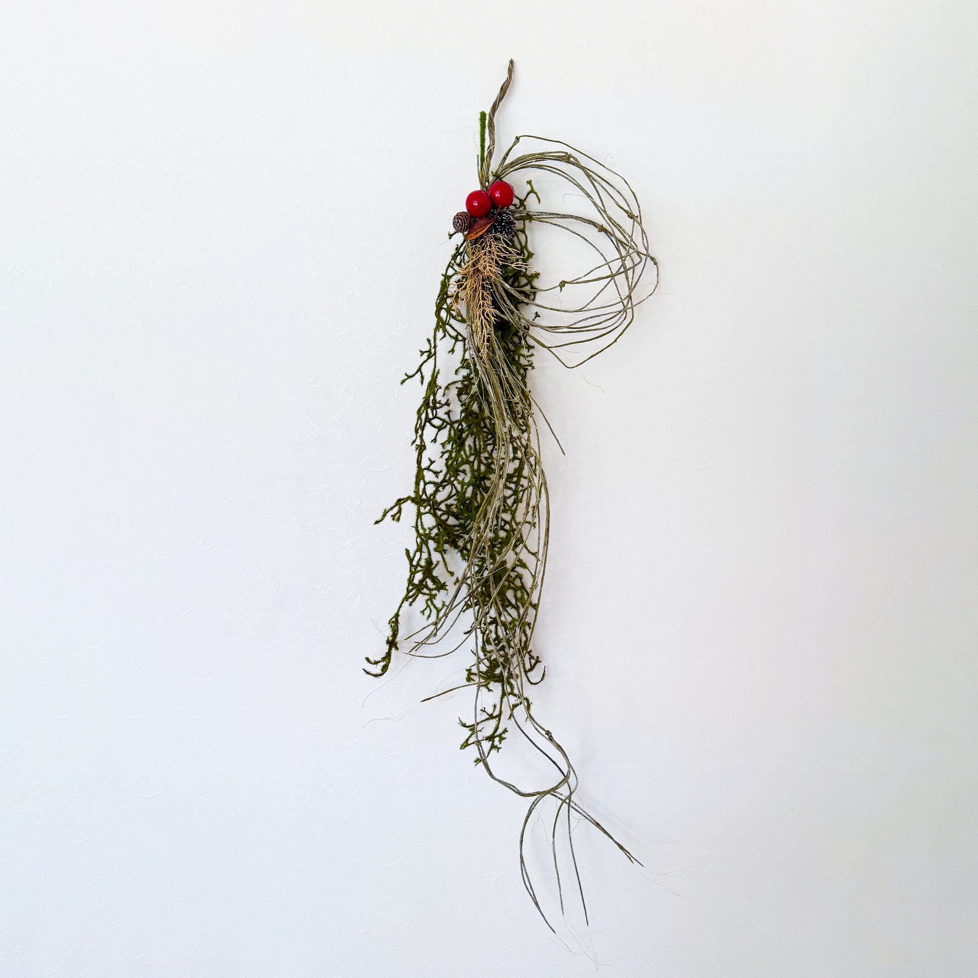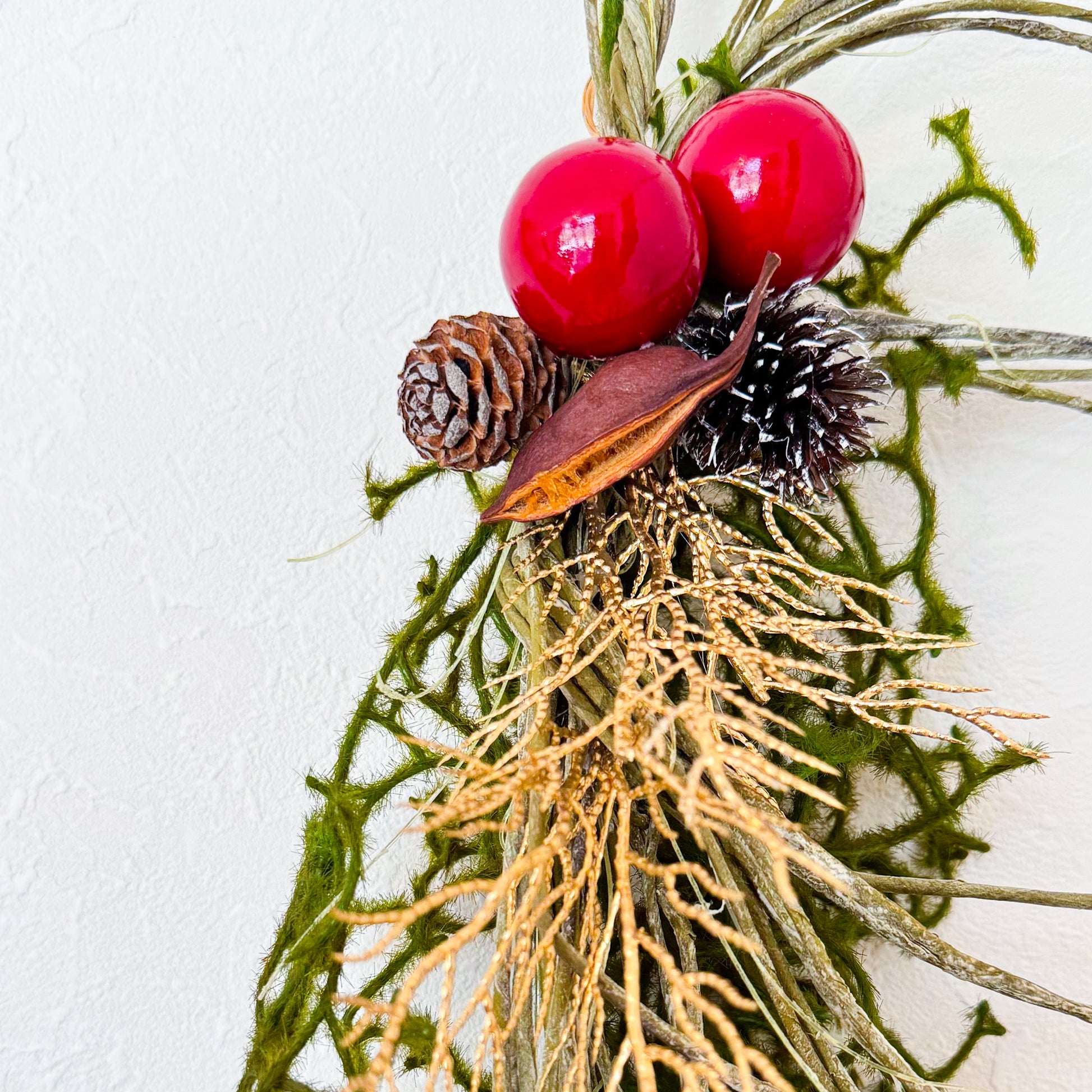 ベースは造花のヒカゲノカズラ、柳、シダのグリーンを基調とし、アクセントに赤い実、松ぼっくり、ノグルミをデコレート。長さがあるため、シンプルで軽量なスワッグながら、存在感があります。