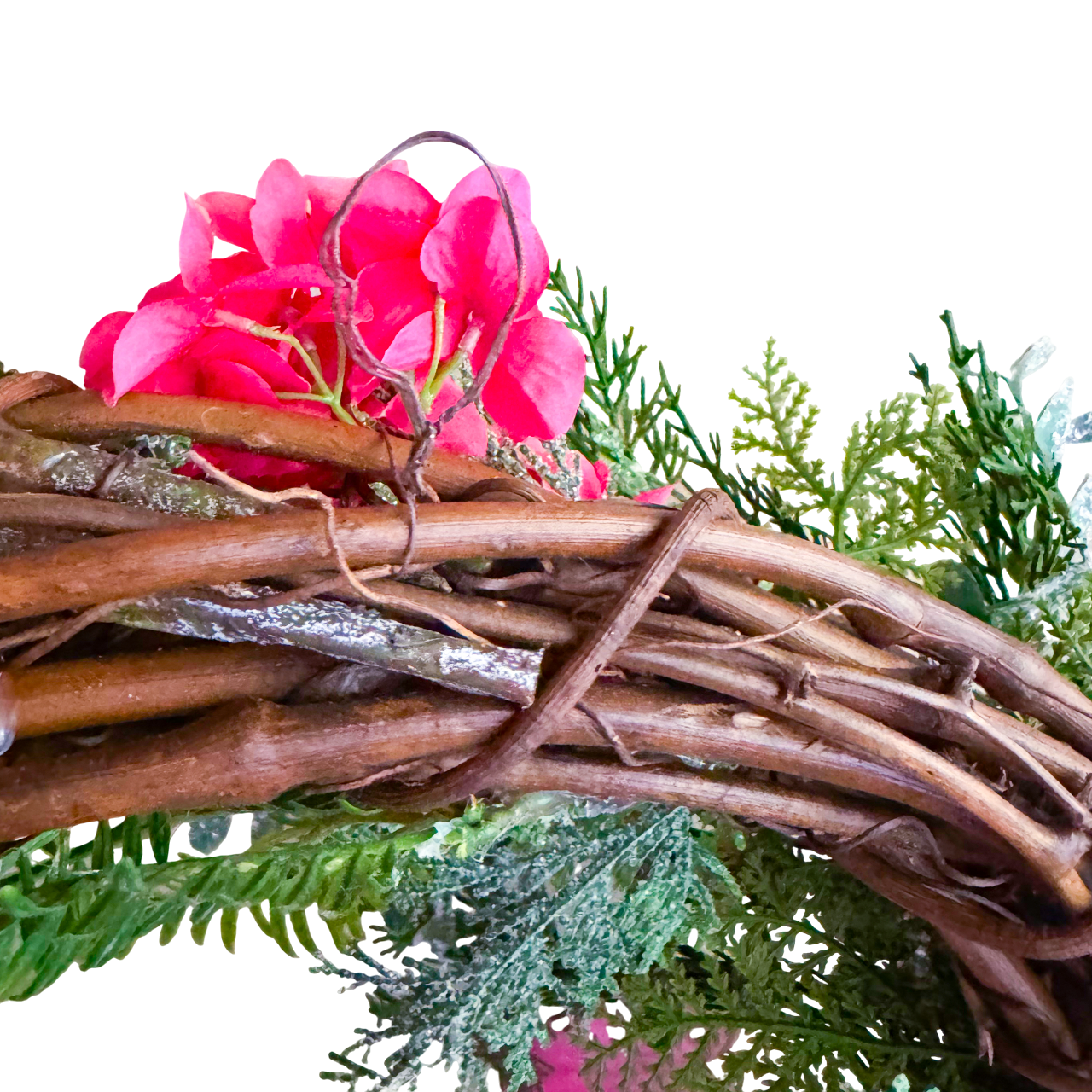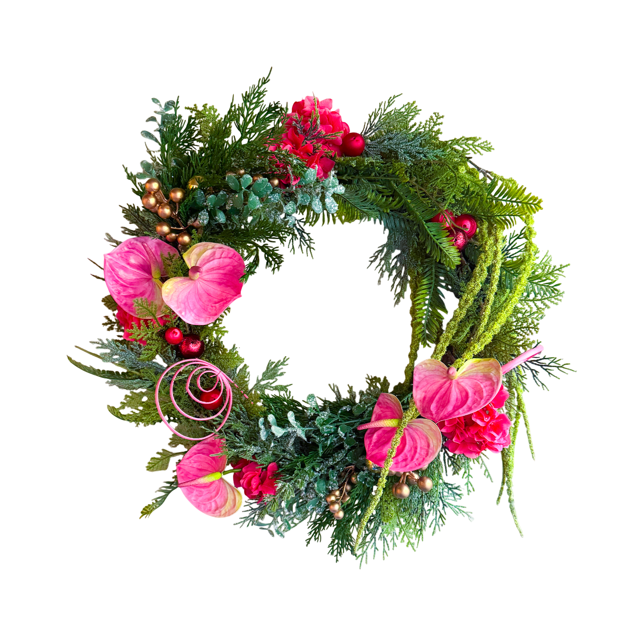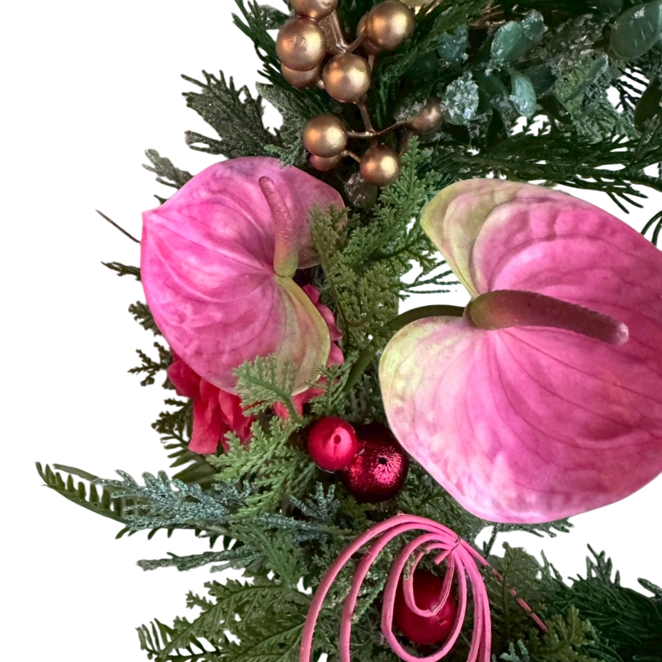 今話題のアマランサスをメインに、ピンクのアンスリウム、レッドの紫陽花、レッドオーナメント、ゴールドの実やオーナメントが豪華。ベースにはシダ、モミ、ユーカリを使用しているので、しっかりクリスマス感を演出。海外リゾートを彷彿とさせつつ、聖夜を彩る唯一無二のアイテムです。