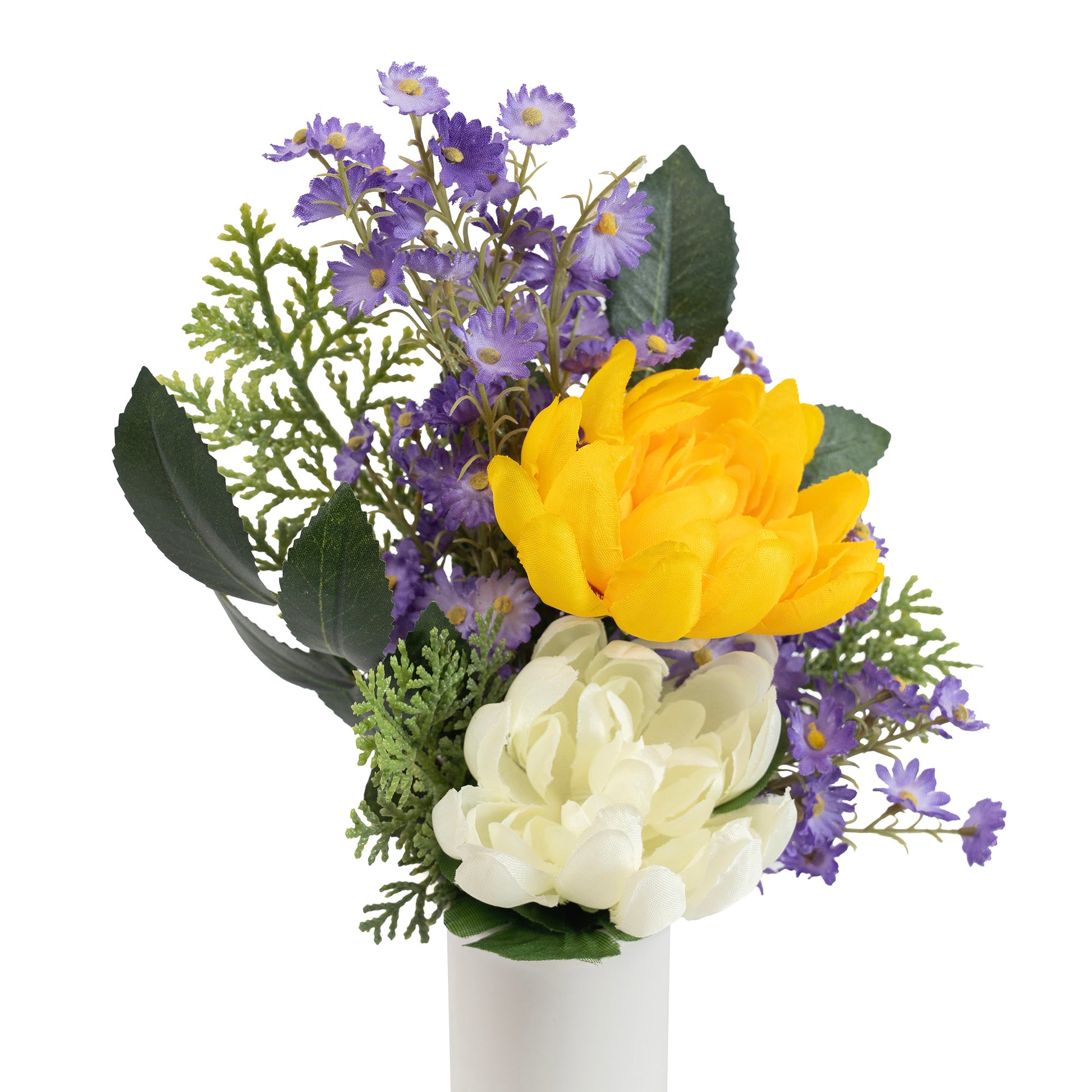 現代のインテリアや仏具にもマッチする華やかな仏花です。生花は夏場や長期不在時に枯れたり、臭いの心配がありますが、アーティフィシャルフラワーは美しさそのままで、お手入れが手軽です。なかでもこのアレンジメントは大振りなイエローとホワイトの菊が厳かな品を漂わせています。生花を頻繁に買いに行けない高齢の方や、お彼岸やお盆をはじめとした仏壇などに重宝するアレンジメント。<注:花器は付属しません>
