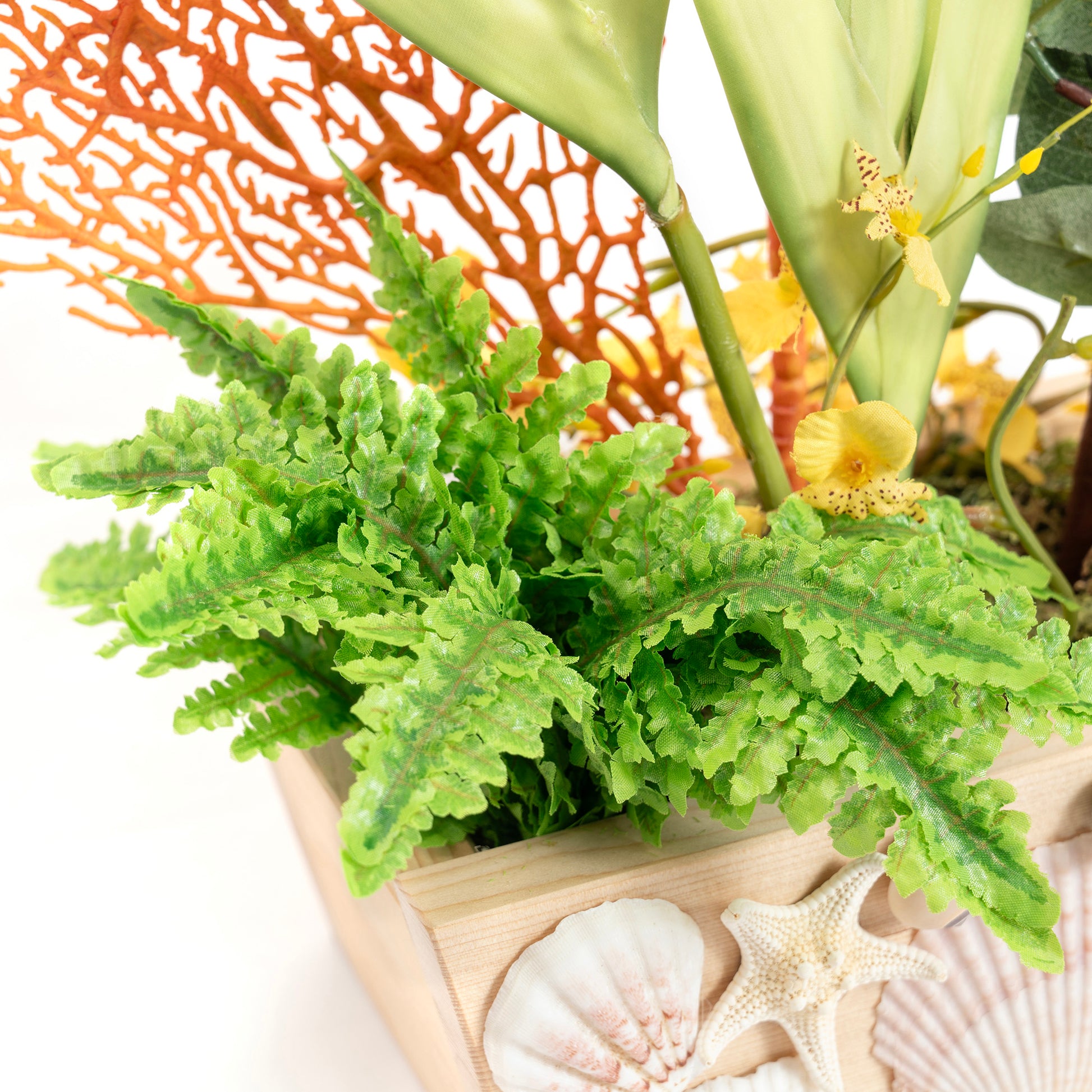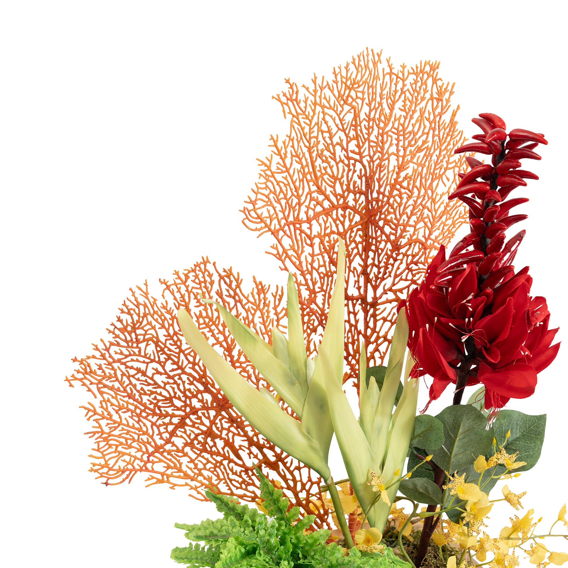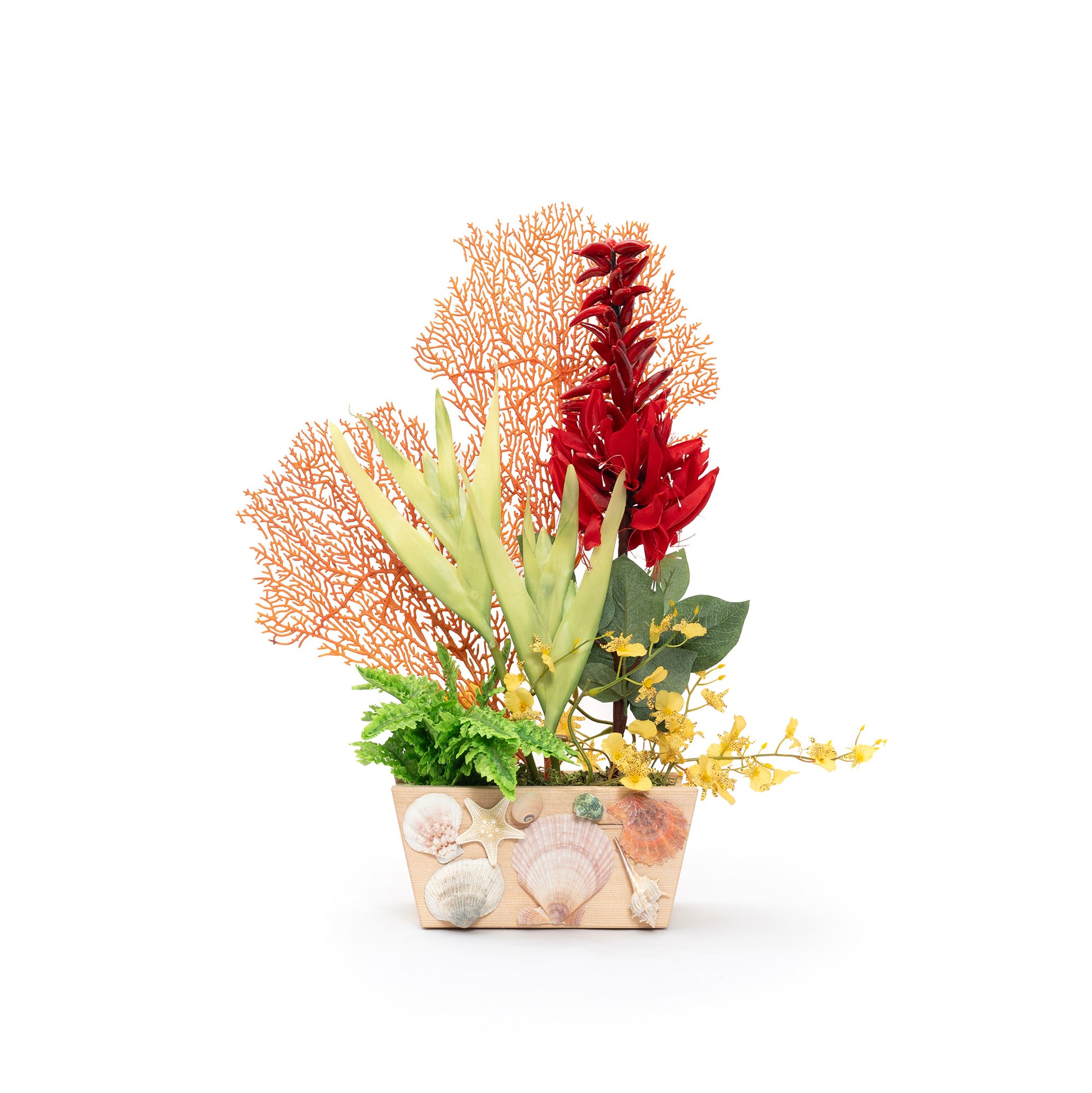 貝殻を散りばめたプランターにオレンジが眩しいサンゴ、インド及びマレー地方を原産とするマメ科の落葉樹であるレッドが鮮やかなデイゴ、華やかな黄色い花として知られるオンシジューム、オウムのくちばしのようなヘリコニア、玉シダがバランス良くデコレーションされた豪華なアレンジメント。置くだけで鮮明な色使い、珍しい植物の美しさに目が奪われる存在感のある一品なので、贈り物にも喜ばれそうです。お部屋のワンポイントに、開店祝いなどのお祝いにもおススメです。