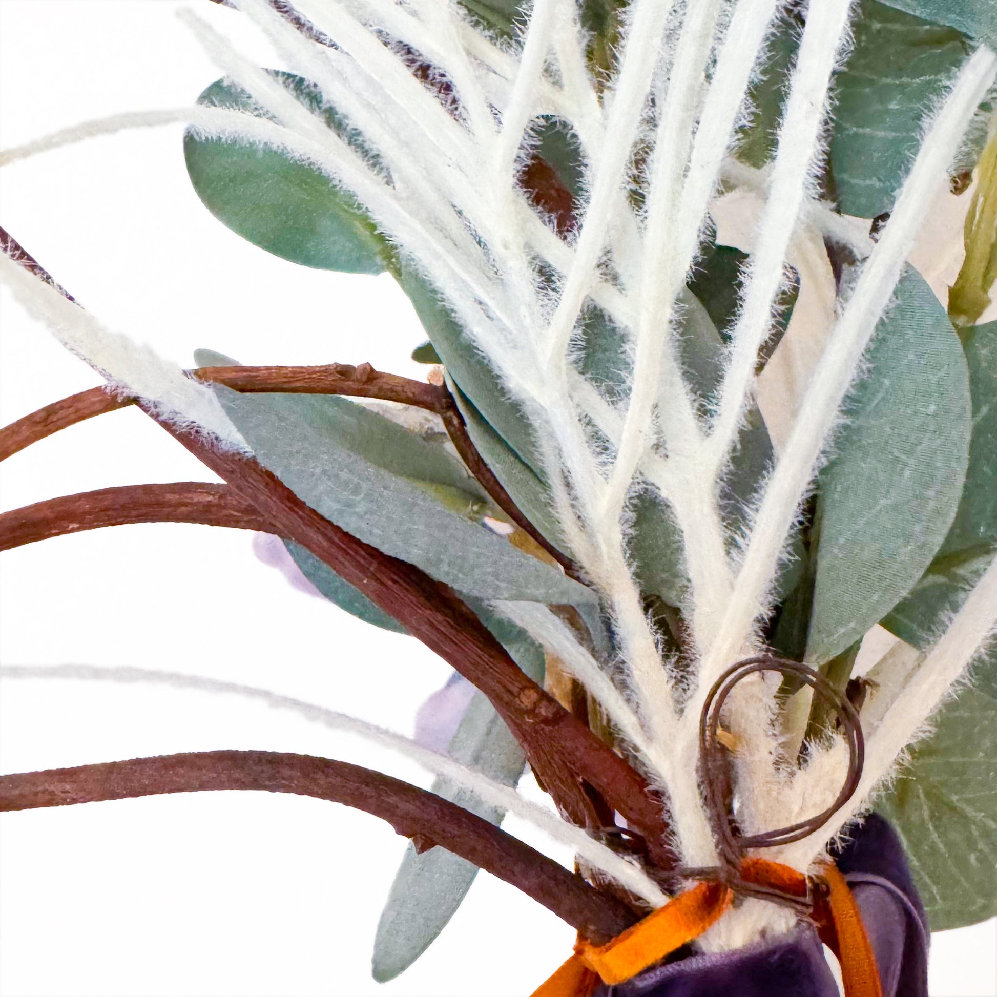 パープル、オレンジのベルベットリボン、枝のアレンジメント、清楚なパープルのモクレンが一際目を引くスワッグ。ユーカリの葉がナチュラルな印象なので、様々な空間に馴染みます。