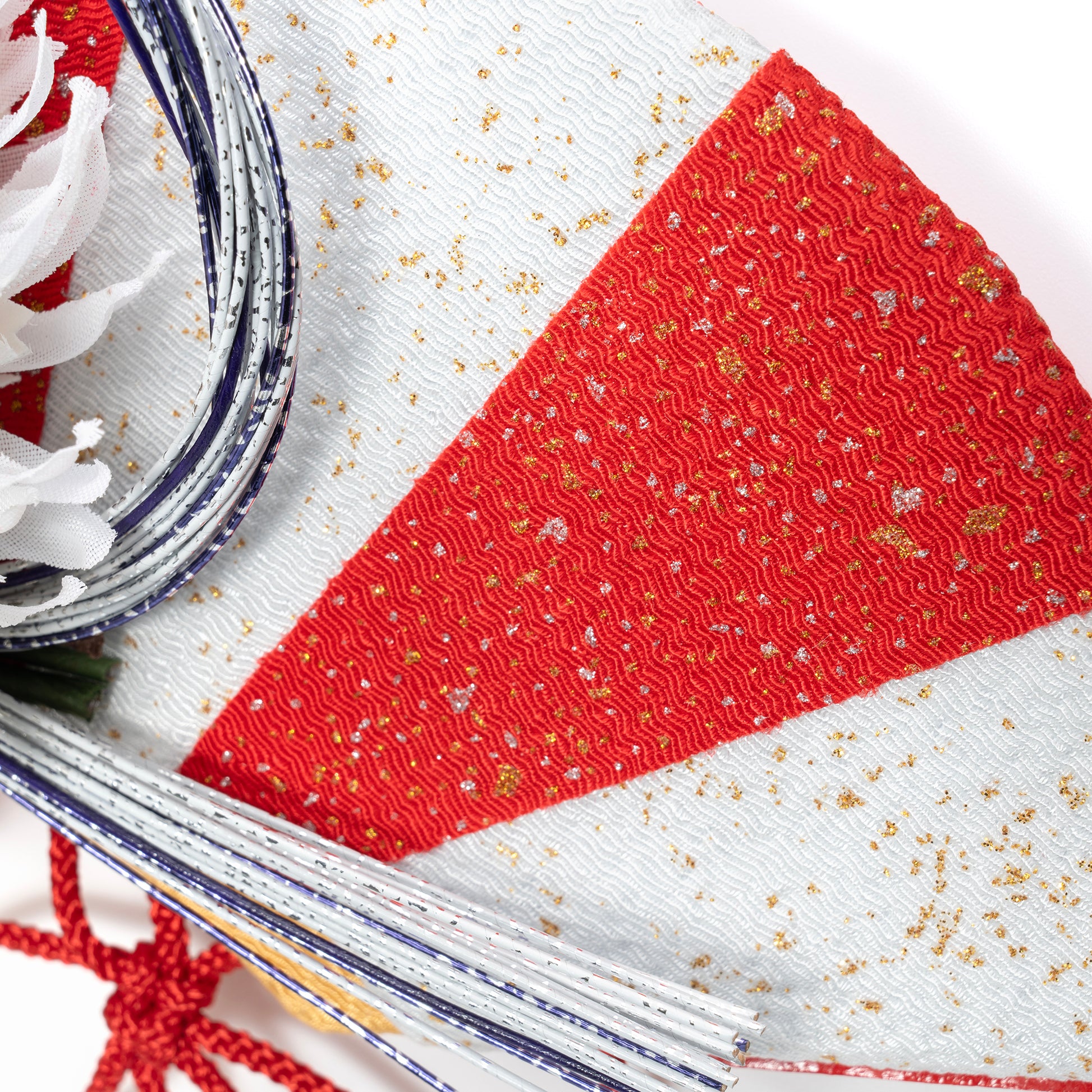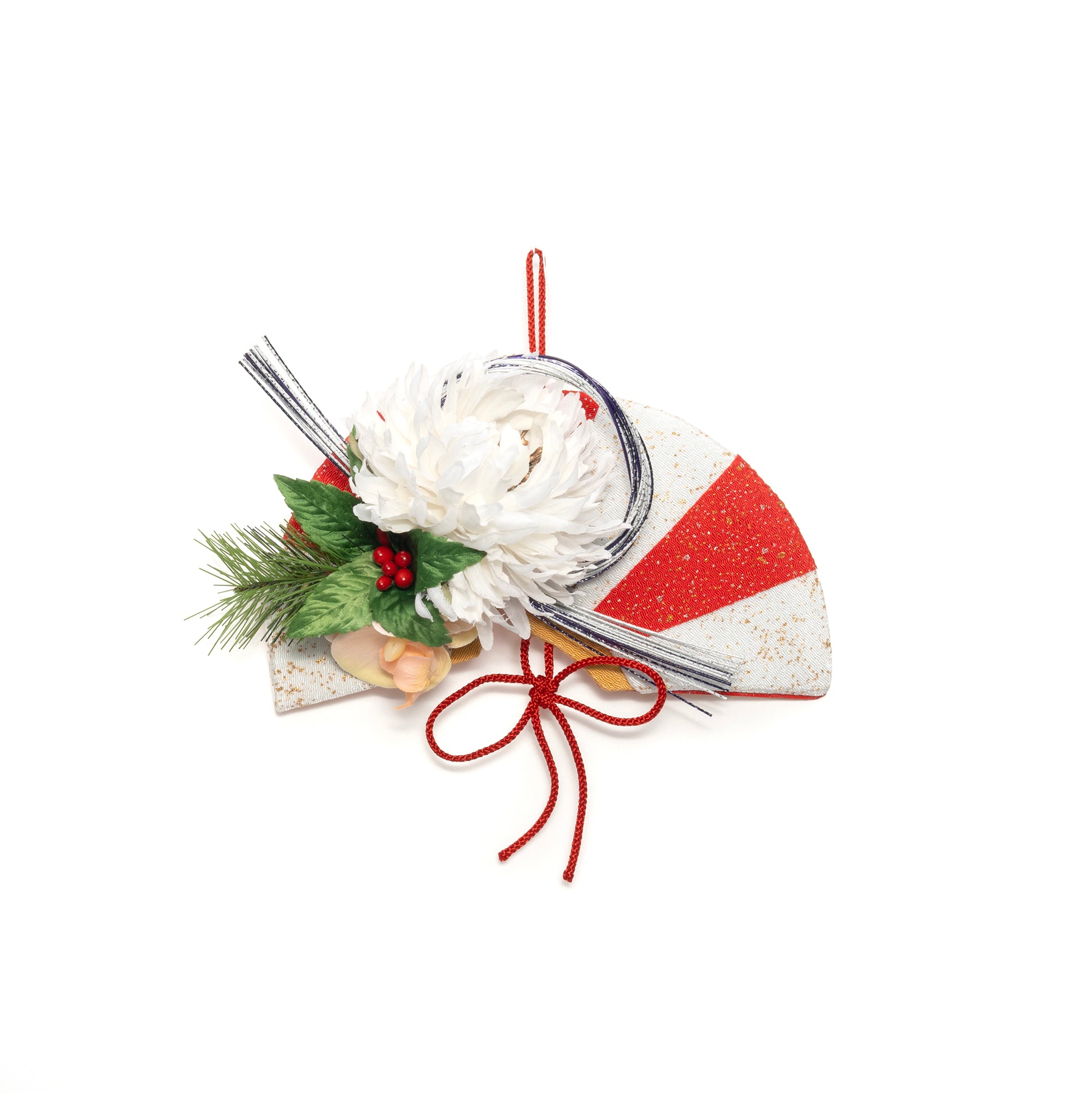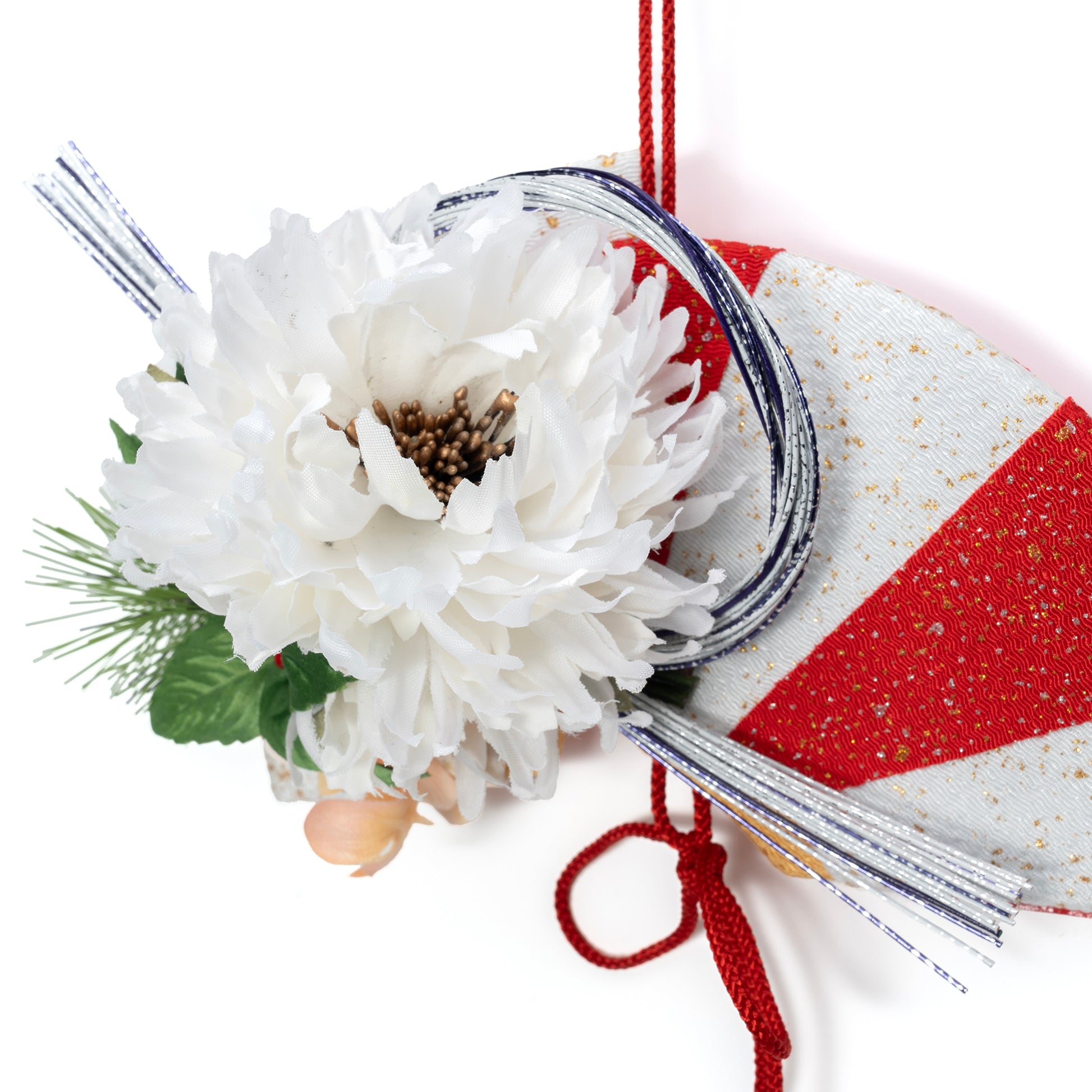 白の菊と紅白の扇子が豪華なお正月飾り