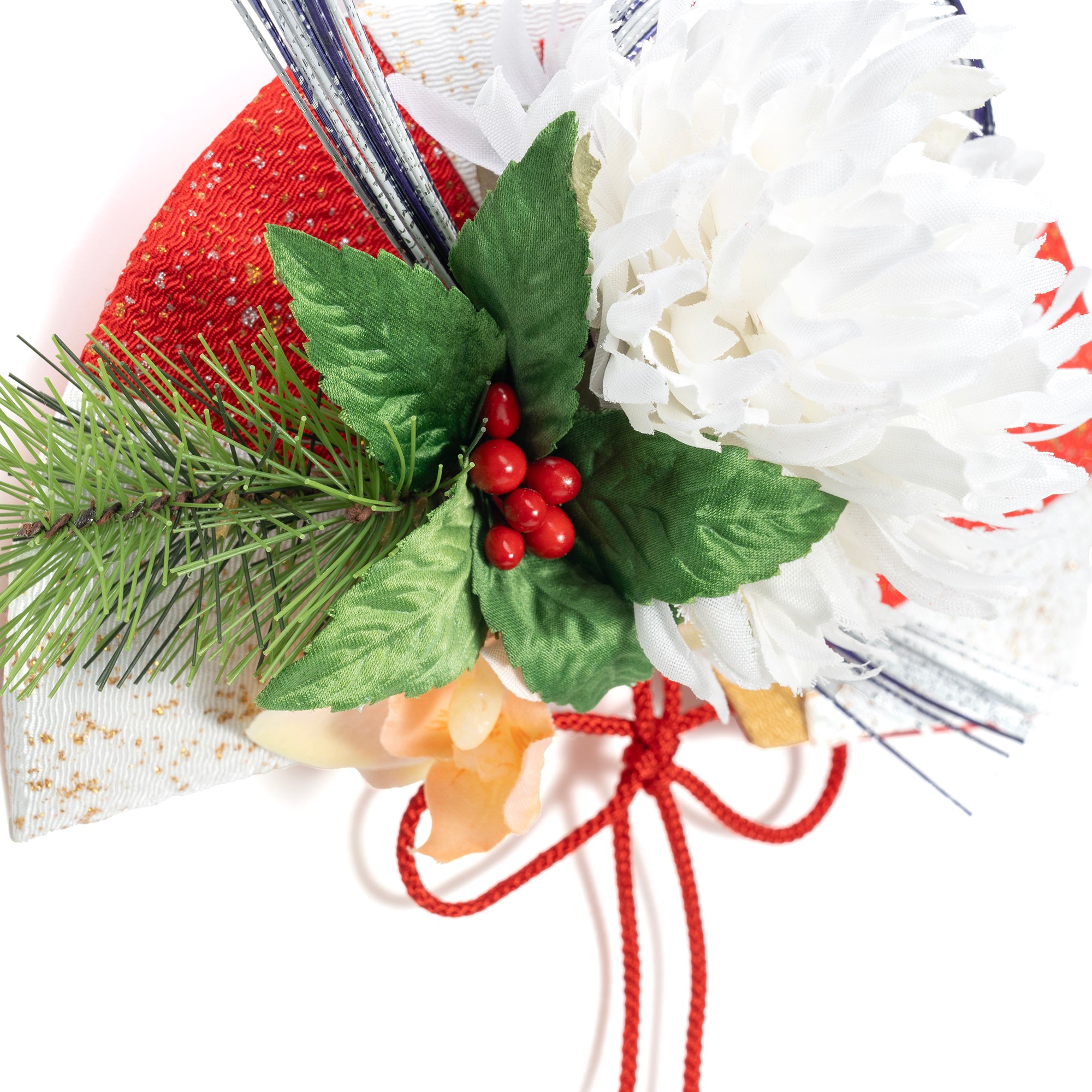 真っ白な菊が象徴的な扇子のお正月飾りです。験のよい大輪の菊に、縁起物として知られ、お正月に欠かせないセンリョウや松、温もりを感じる胡蝶蘭。これだけでも福を呼び込みそうな豪華なアレンジですが、魔よけや人と人を結ぶという意味がある水引を添え、紅白をベースにした粋なアレンジメントとなっております。ご自宅は勿論、ギフト、オフィス、お店などで幅広くお使い頂けます。仕様(サイズ、重さ、素材)