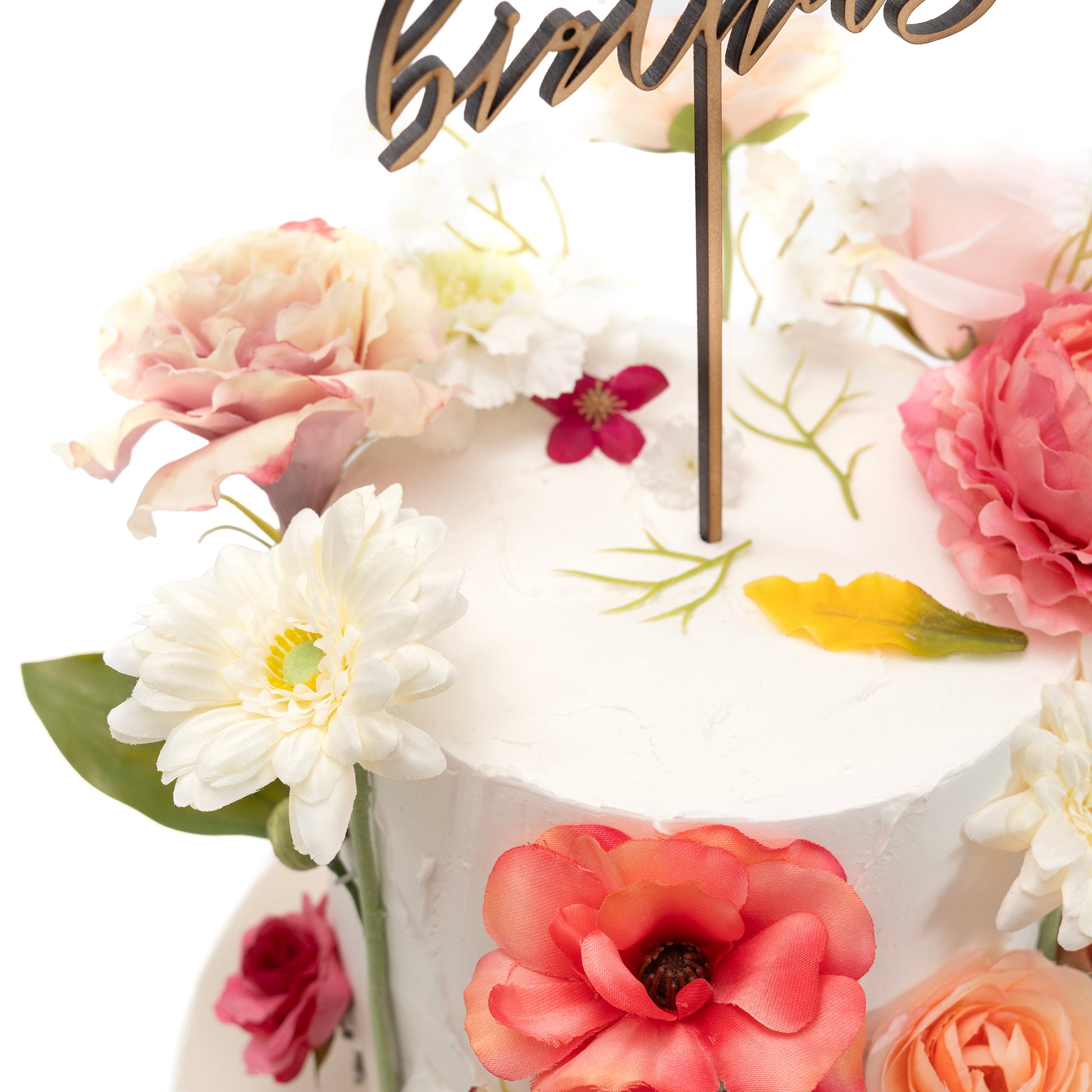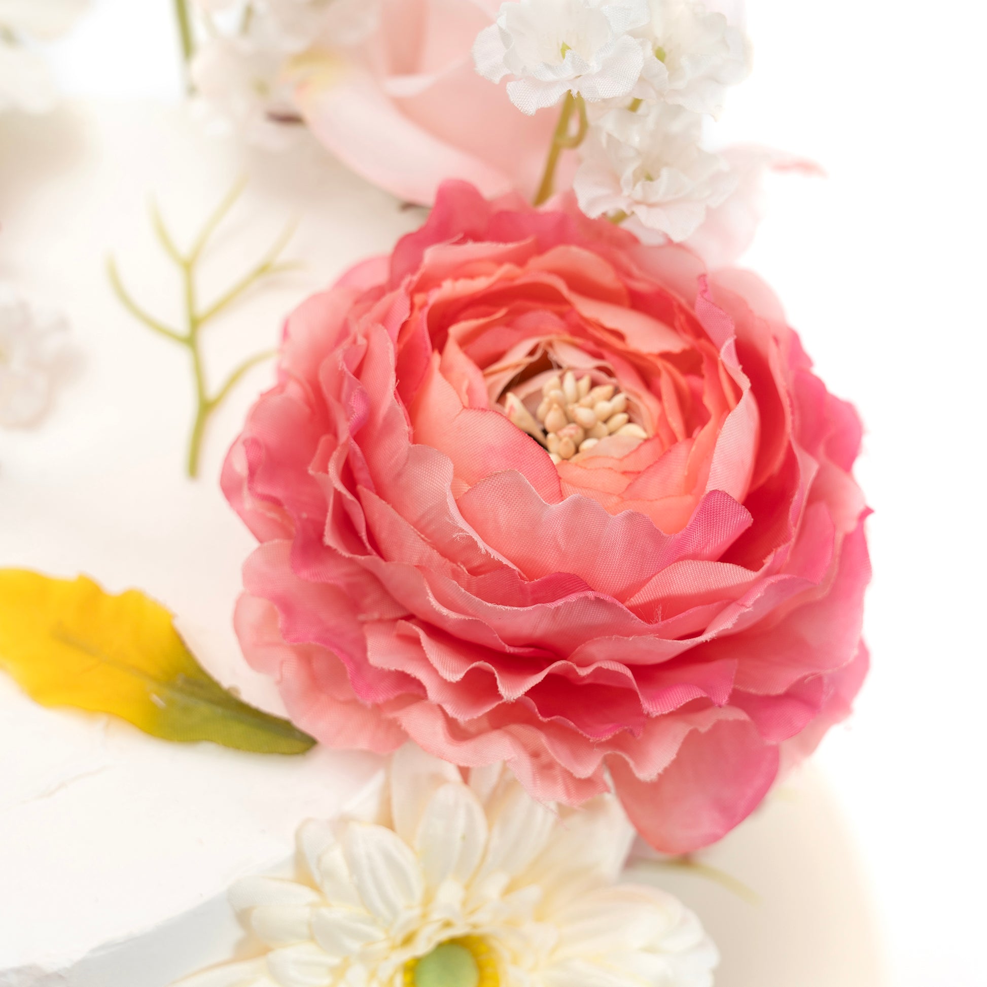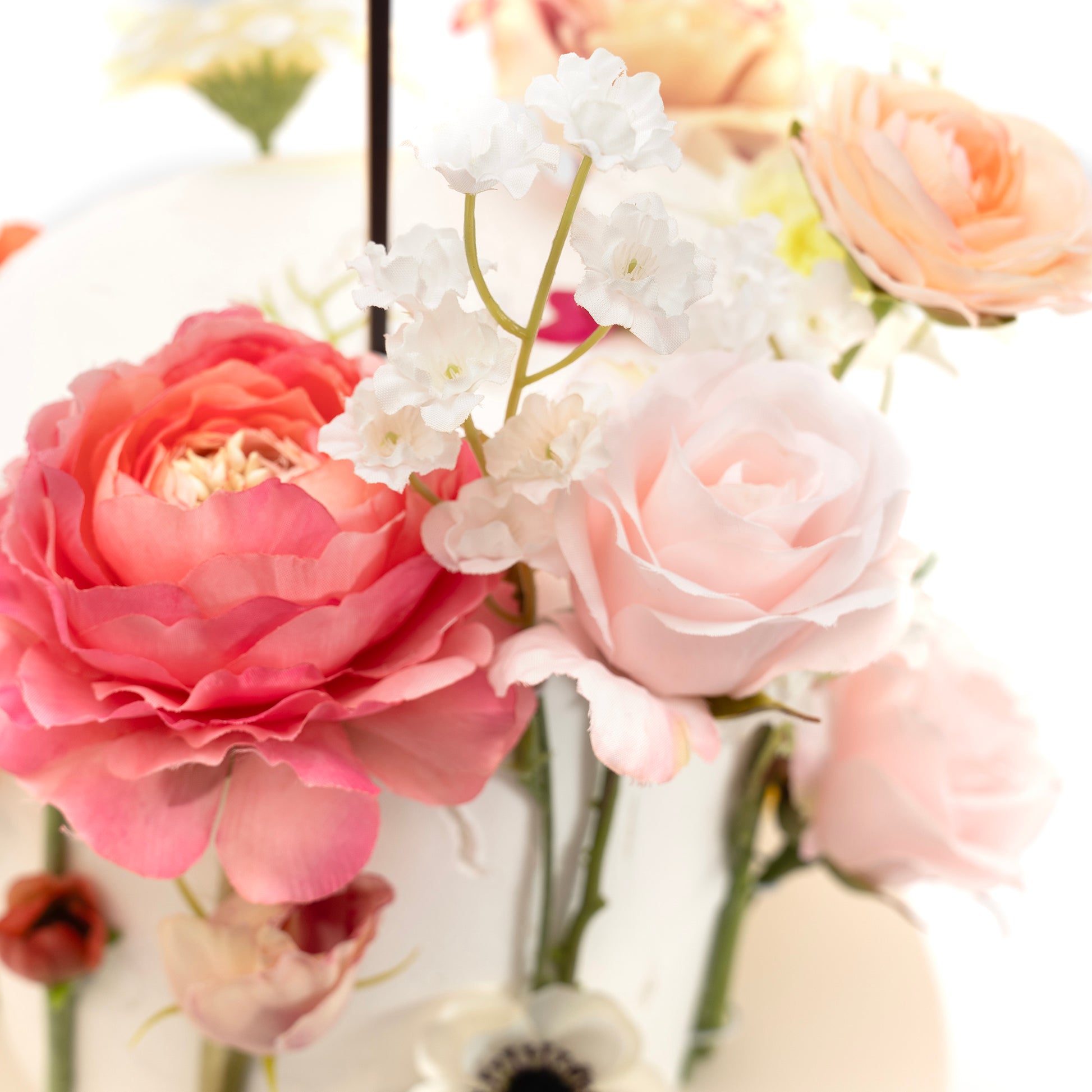ガーベラ、ラナンキュラス、スカビオサ、バラ、ポピー、アネモネなど華やかな花々がホワイトベースのケーキの周囲をファッショナブルに彩るゴージャスなクレイケーキです。ケーキ中央にお誕生日のピックを差せば、バースデーパーティの主役に。ピックを使用せず、ウェディングパーティーや様々なお祝いシーンのデコレーションや撮影小物として場を華やかに装うのもおすすめです。<注:ケーキ台、ケーキトッパーは付属しません。(別売り可能)この商品は食べられません。ケーキ裏面に製造工程で生じる小さな穴が開いている場合がございますが、返品交換対象外となります>