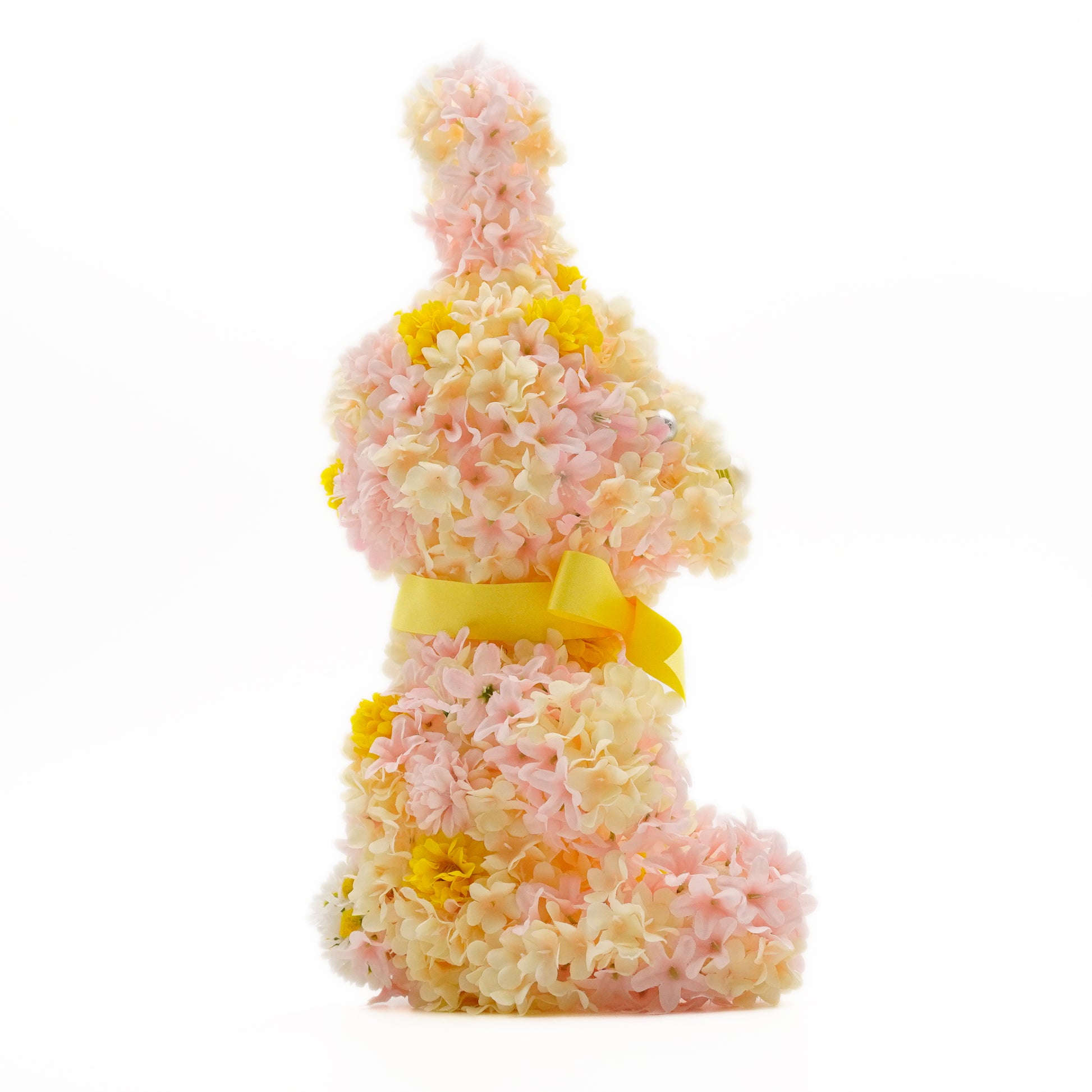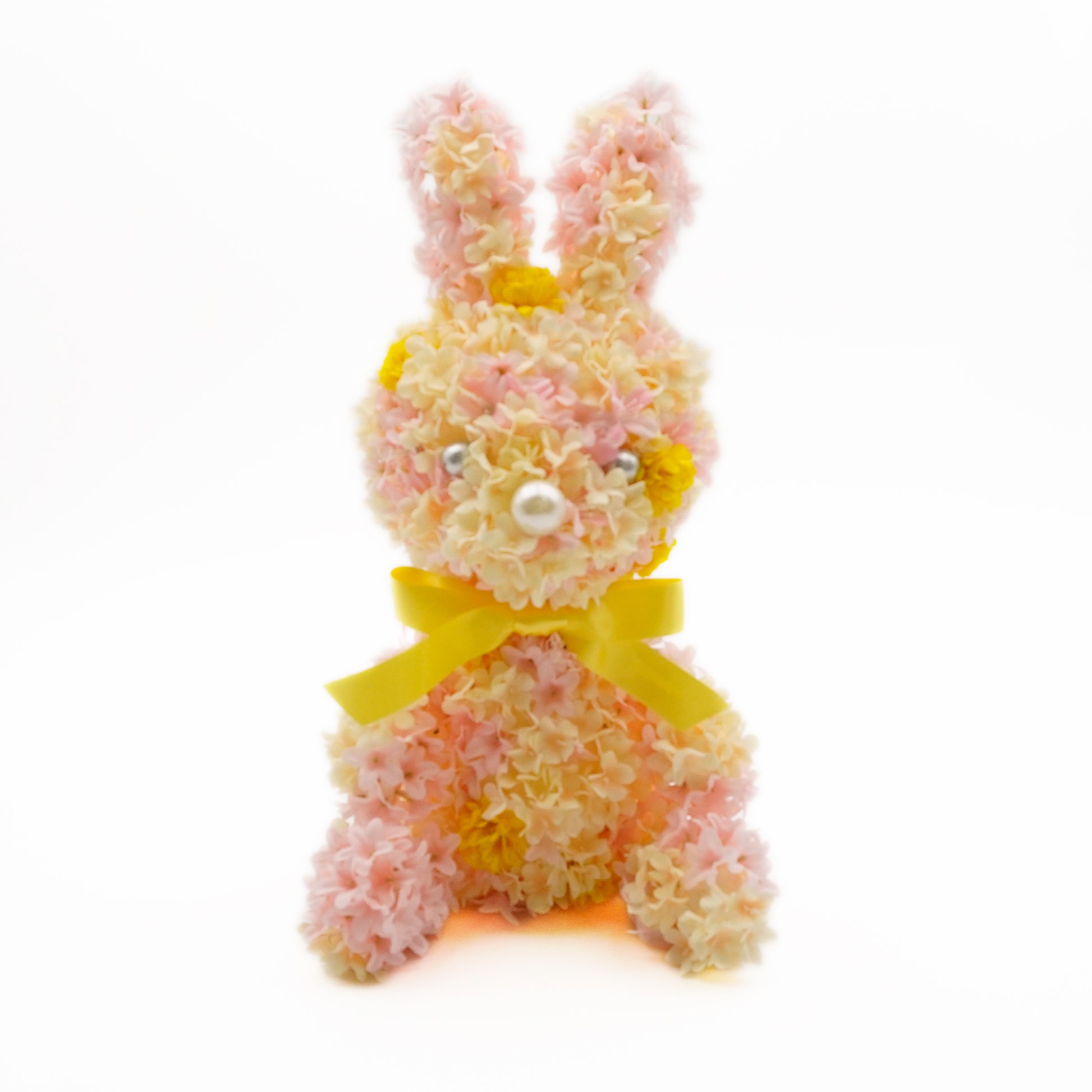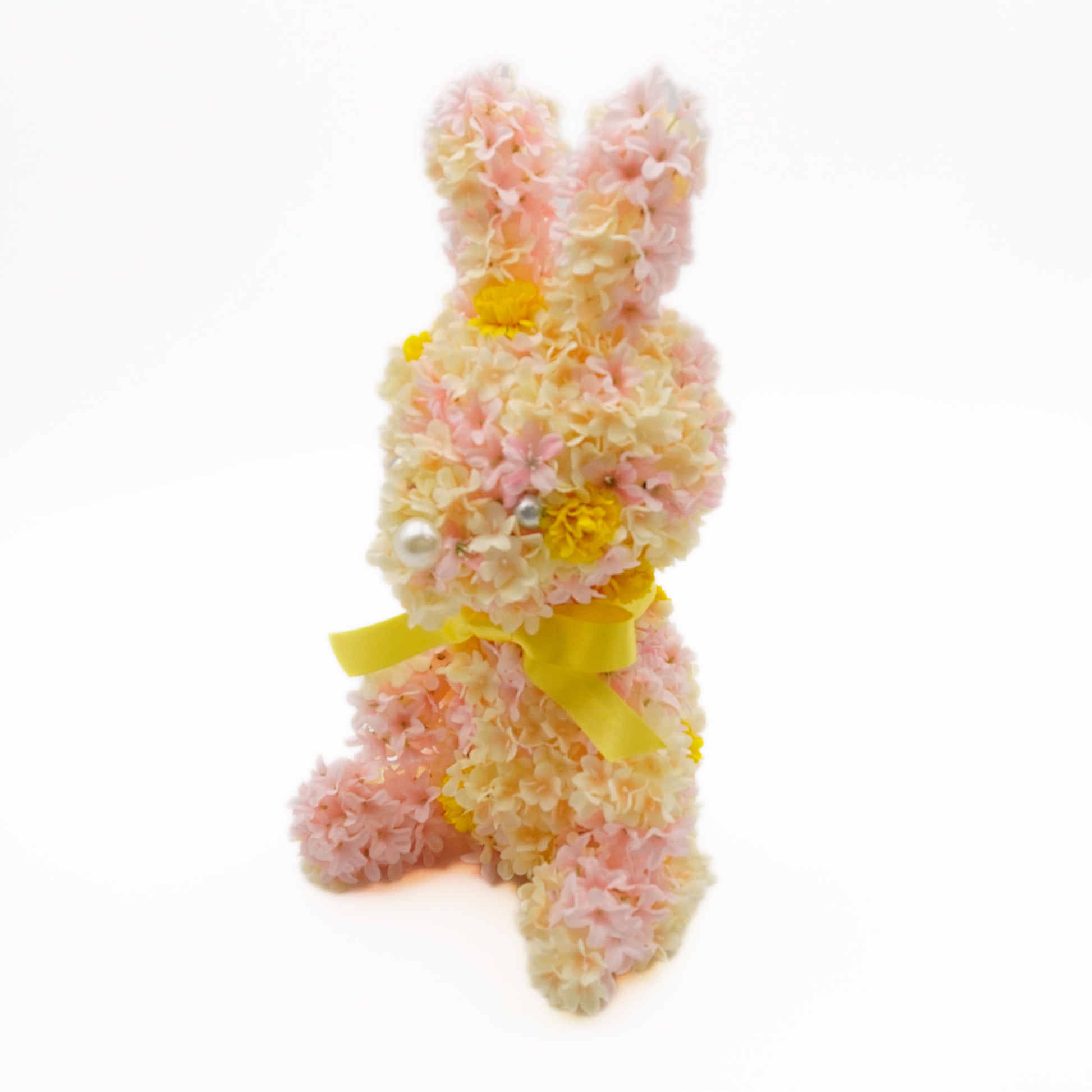 「可愛い!」の一言に尽きるお花でデコレーションされたラビットのオブジェはプレゼントに最適なアイテム。「可愛らしい」という学名をもつデイジー、大きな球形に集まった花びらから象られたスノーボール、穂のようになって咲く姿がとても印象的なライラック、ブロッサムにフェイクパールやリボンがとてもキュートオブジェ。特にホワイトのデイジーが施されたうさぎの尻尾は見ているだけで癒されます。プロの造形職人がスチロールを削って制作し、手作業でアーティフィシャルフラワーを念入りにアレンジした珠玉の逸品は、玄関やウェルカムスペースなどにおすすめです。