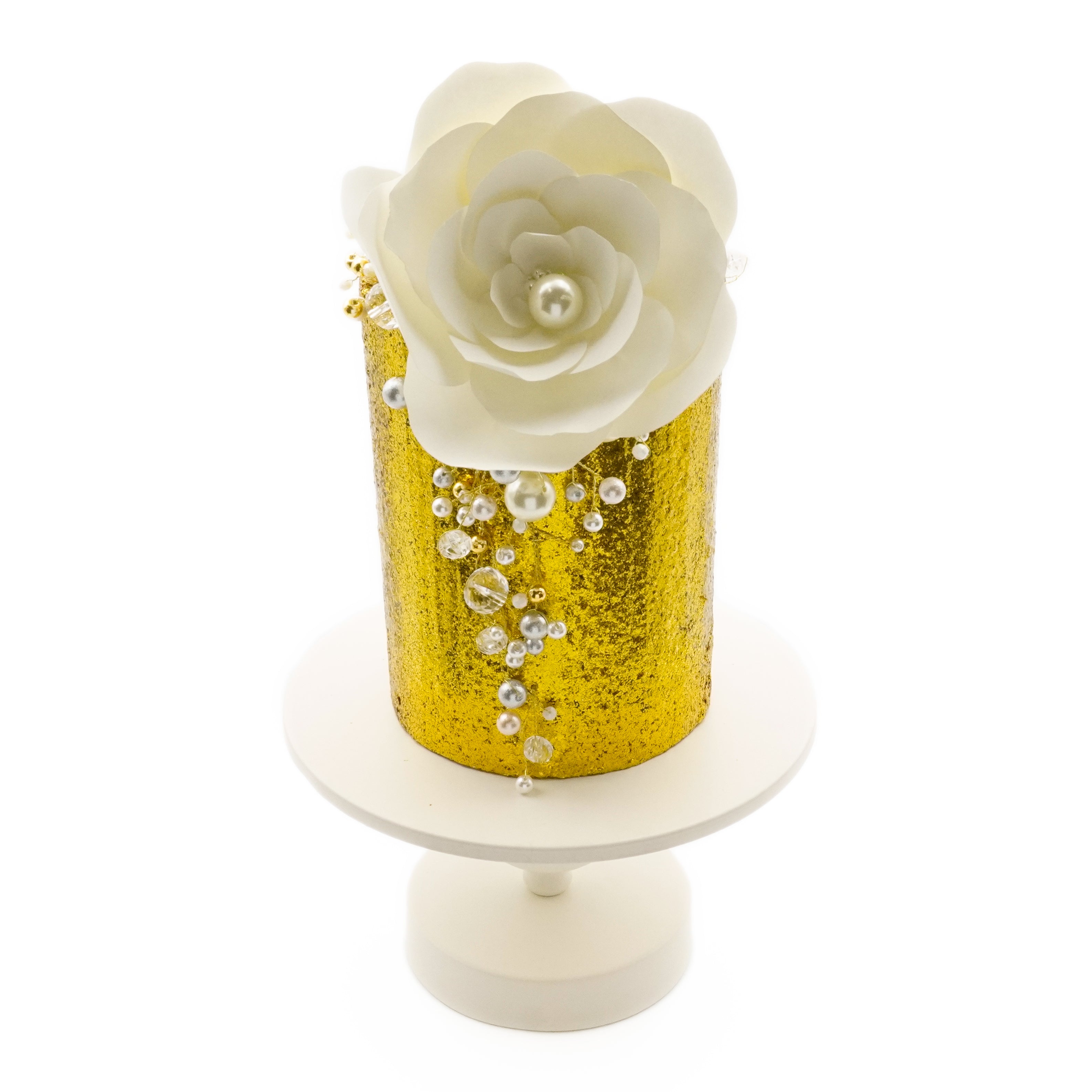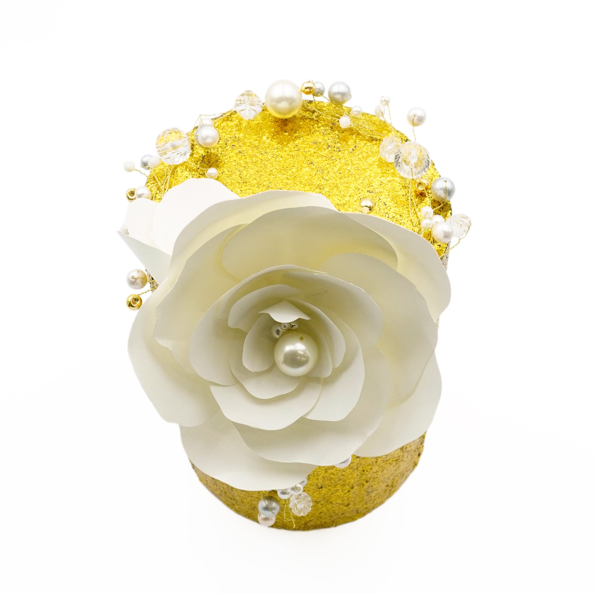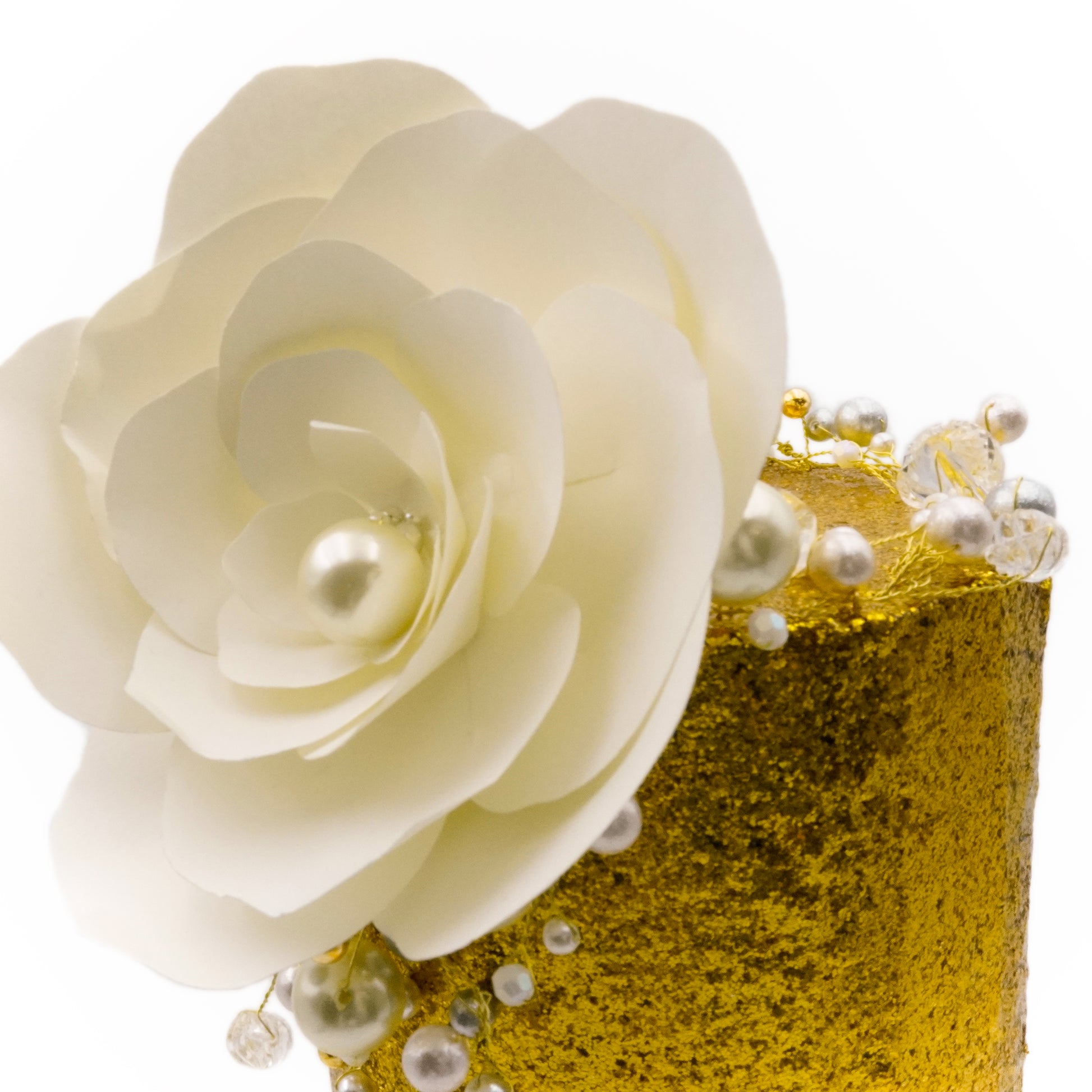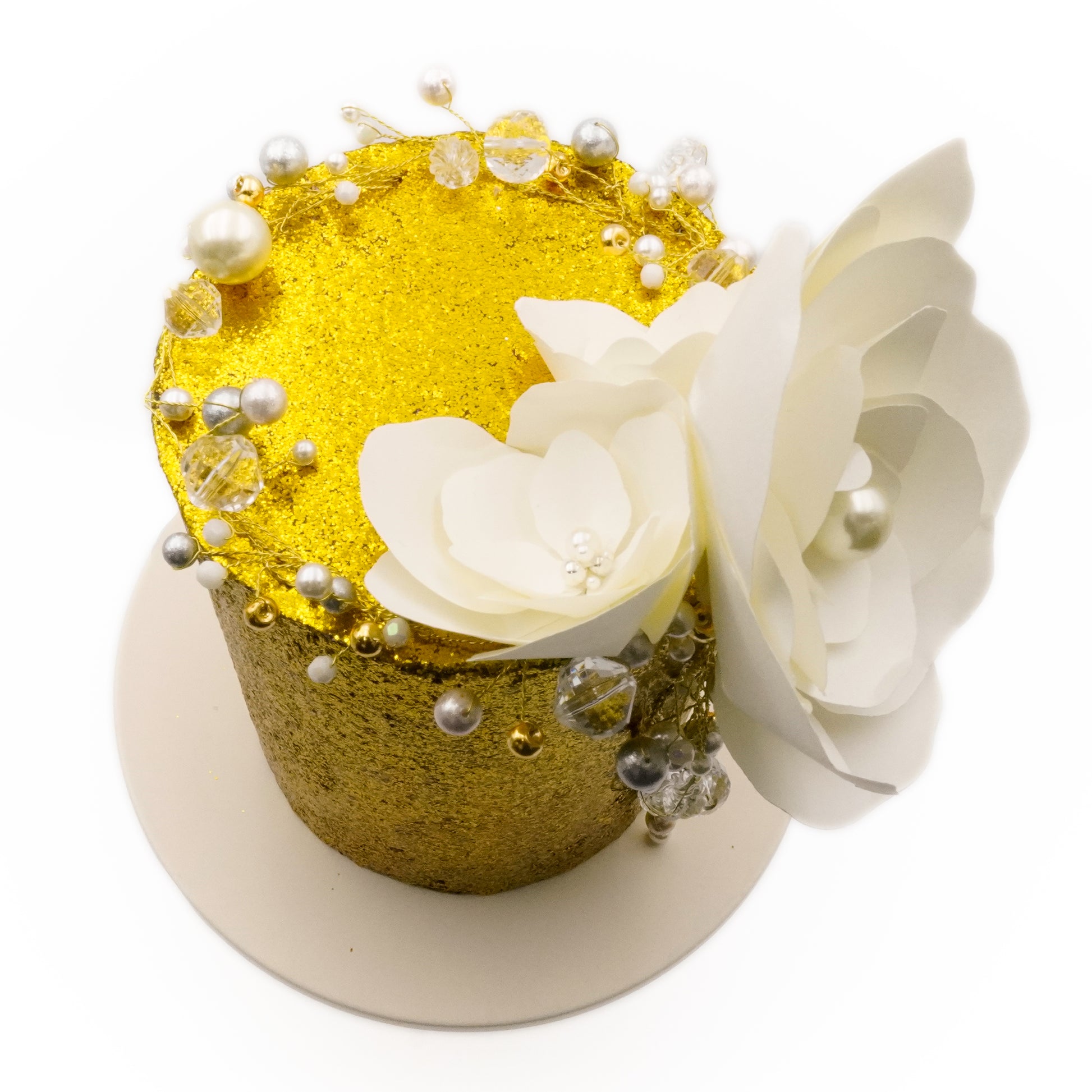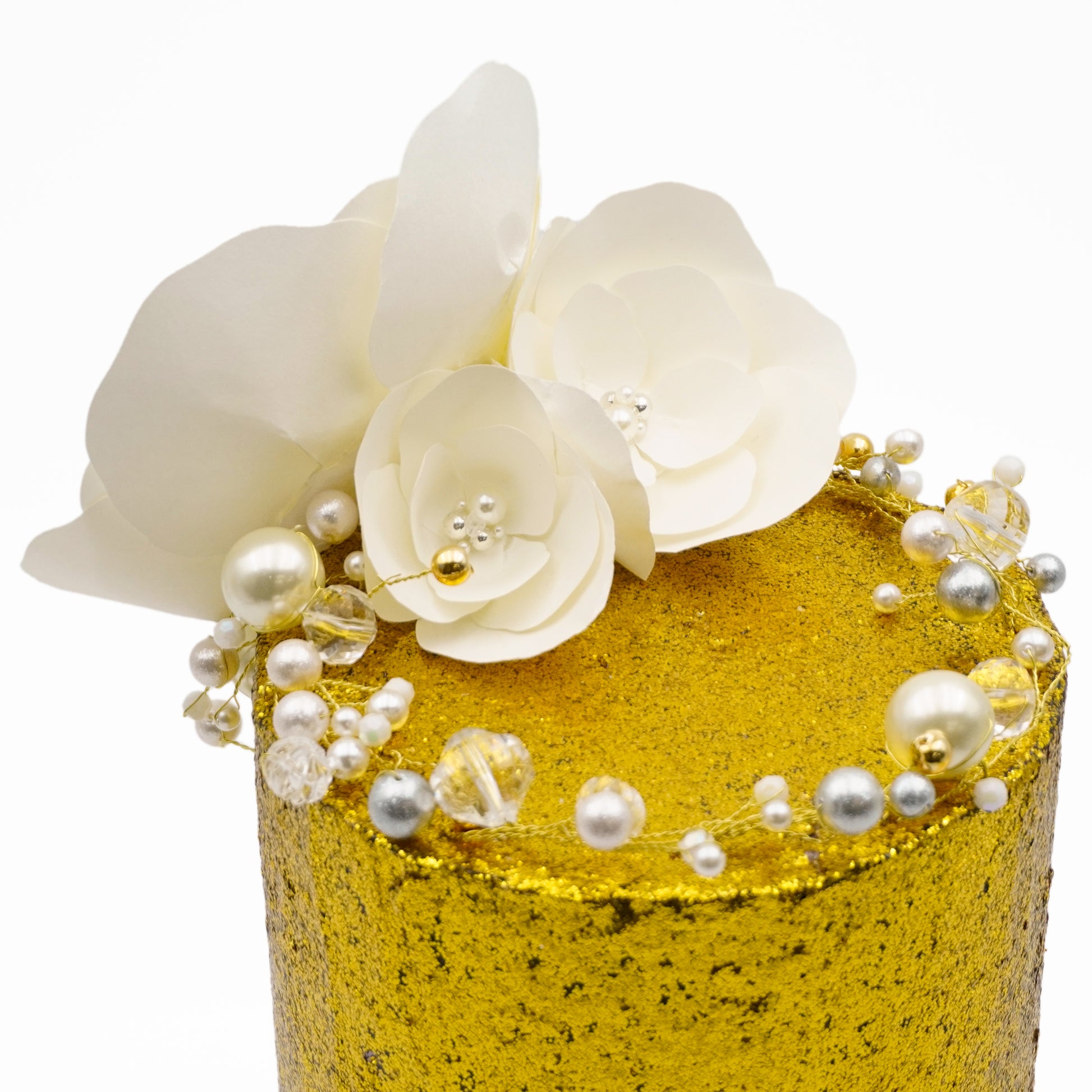 存在感のあるペーパーフラワーのラナンキュラスをアクセントに、ベースは眩いゴールドが印象的なクレイケーキ。パールビーズが繊細な輝きを添えたゴージャスシーンにぴったりなアイテム。サイズ感もやや大きめなのでウェディング、バースデーパーティーやクリスマスのアレンジのオプションとして、またテーブルレコレーションなどにお使い頂きたい豪華なアレンジメント。<注:ケーキ台は付属しません。この商品は食べられません>