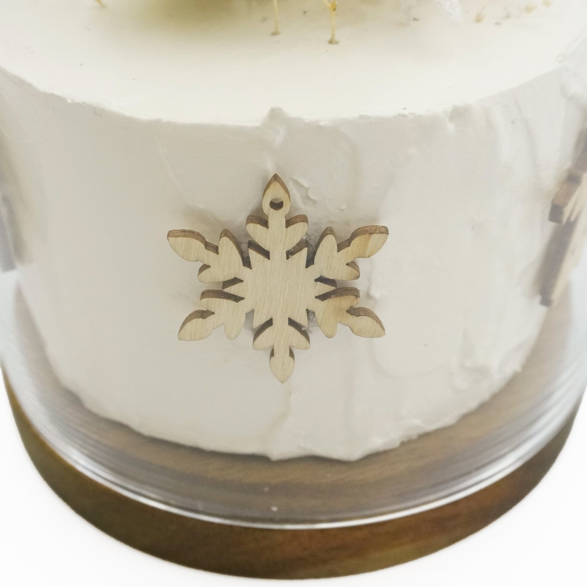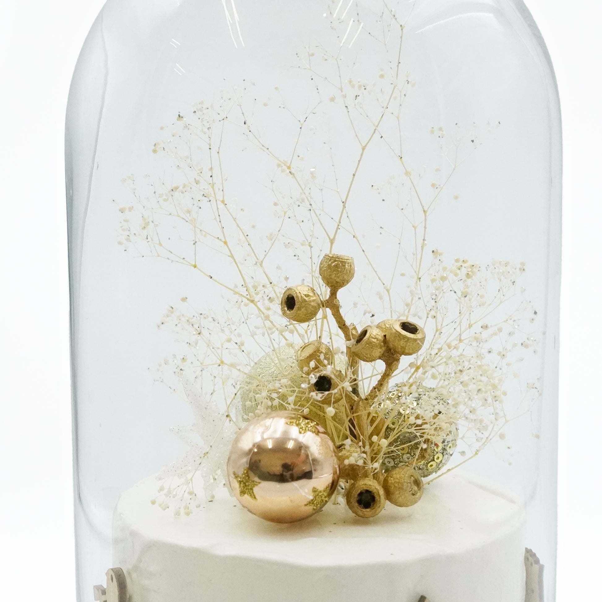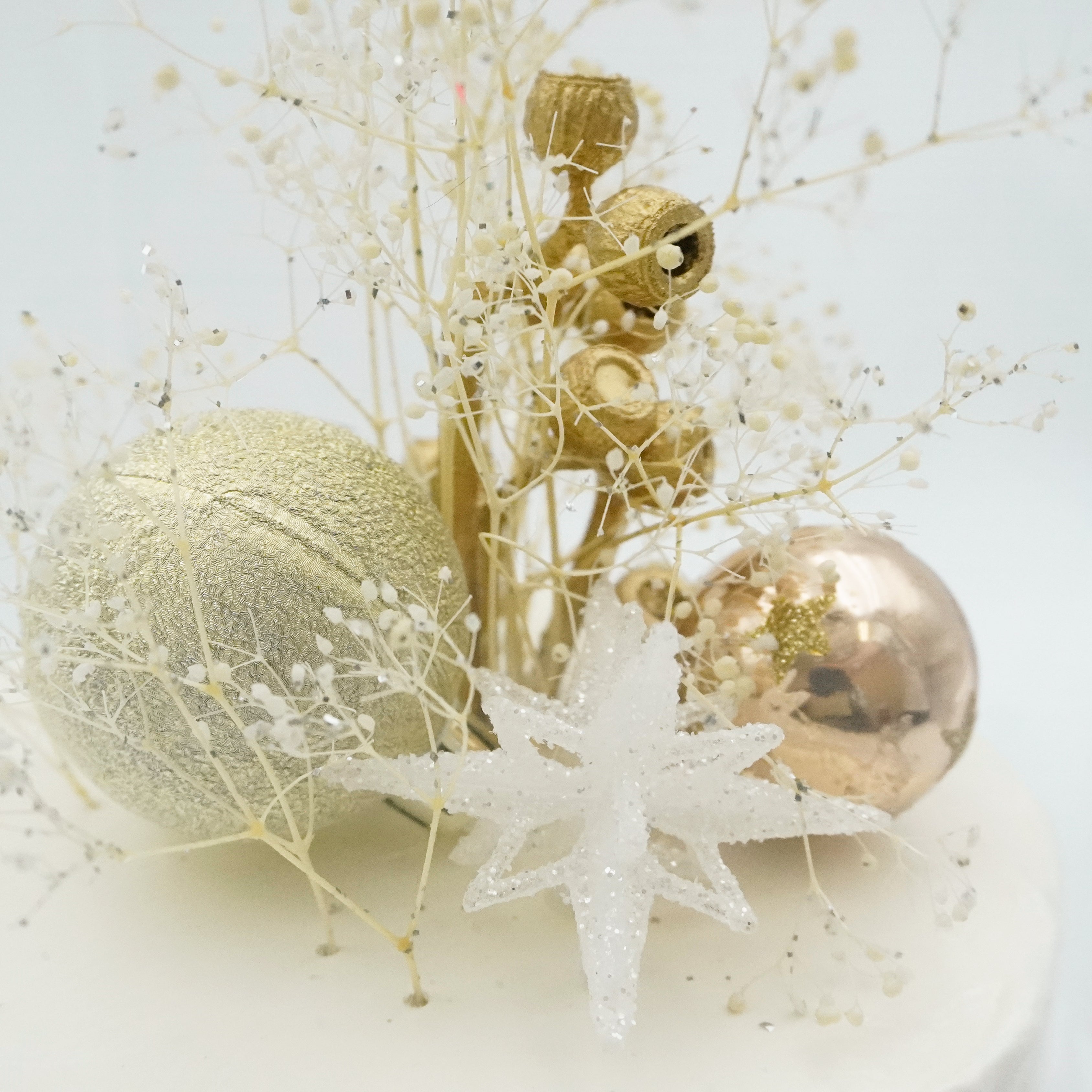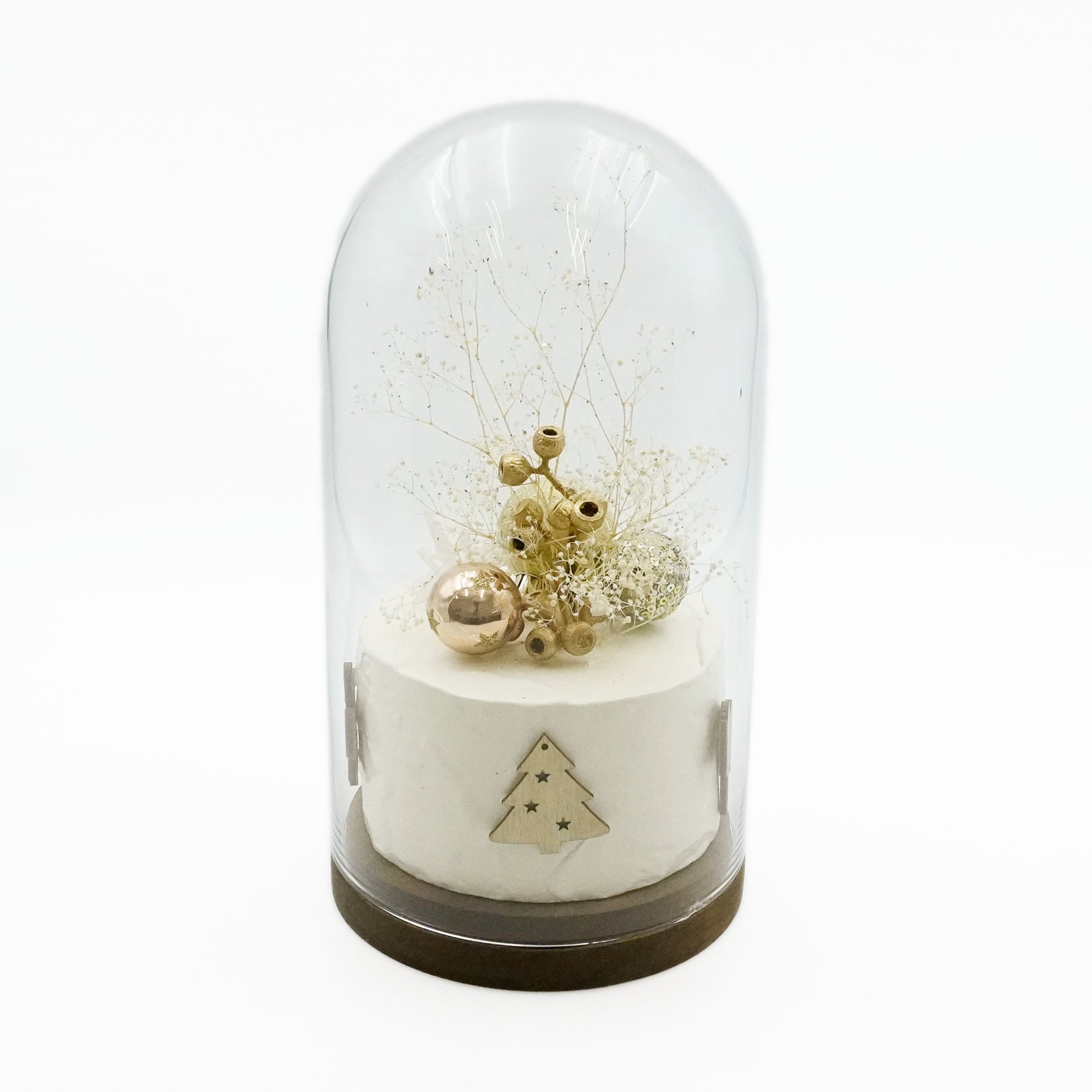 ナチュラルドームクレイケーキは、ゴールドのオーナメントとドライフラワーでアレンジされた、ベースにはツリーや雪の型のウッドチップが散りばめられています。ナチュラルでありながらも、華やかさのあるデザインで、クリスマスの雰囲気をより一層引き立てます。ガラスドームに閉じ込められたこのケーキは、埃を気にすることなく、長い間お楽しみいただけます。<注:この商品は食べられません><注:ドライフラワーは乾燥しているため、散りやすいものや壊れやすい場合がございます。繊細な商品なため飾る場所や季節等により、ご購入後の色の変化や劣化具合は異なります。>