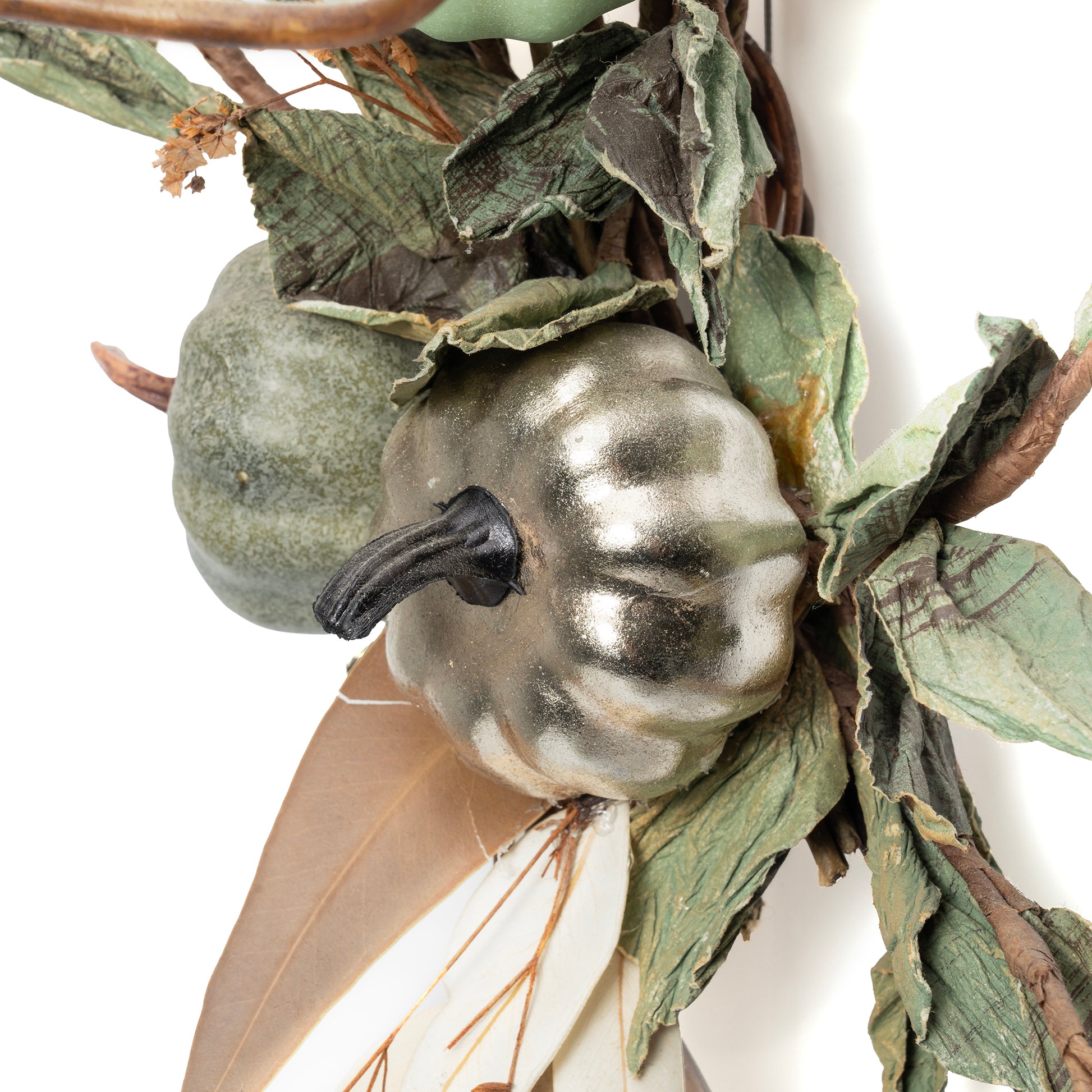グリーンパンプキンをメインにナチュラルかつシックさを醸し出すモダンなアレンジメントです。カラフルな空間が苦手な方や、落ち着いた装飾をお探しの方におすすめです。シンプルの中にもインテリアとしてファッショナブルな印象を与える秀逸なアイテムです。老若男女問わず使いやすいため、プレゼントにも。仕様(サイズ、重さ、素材)