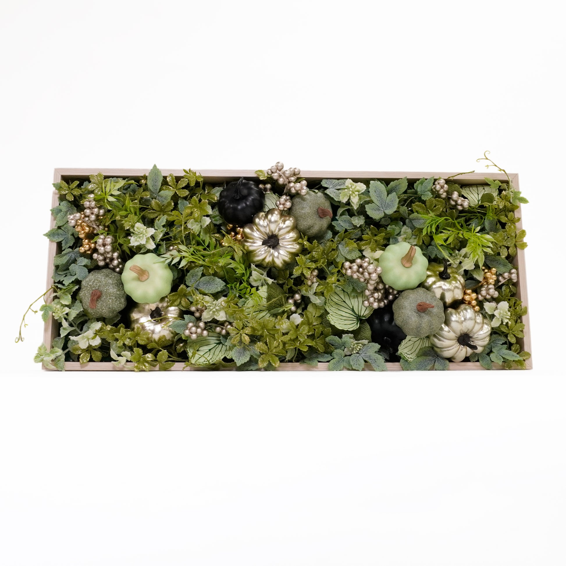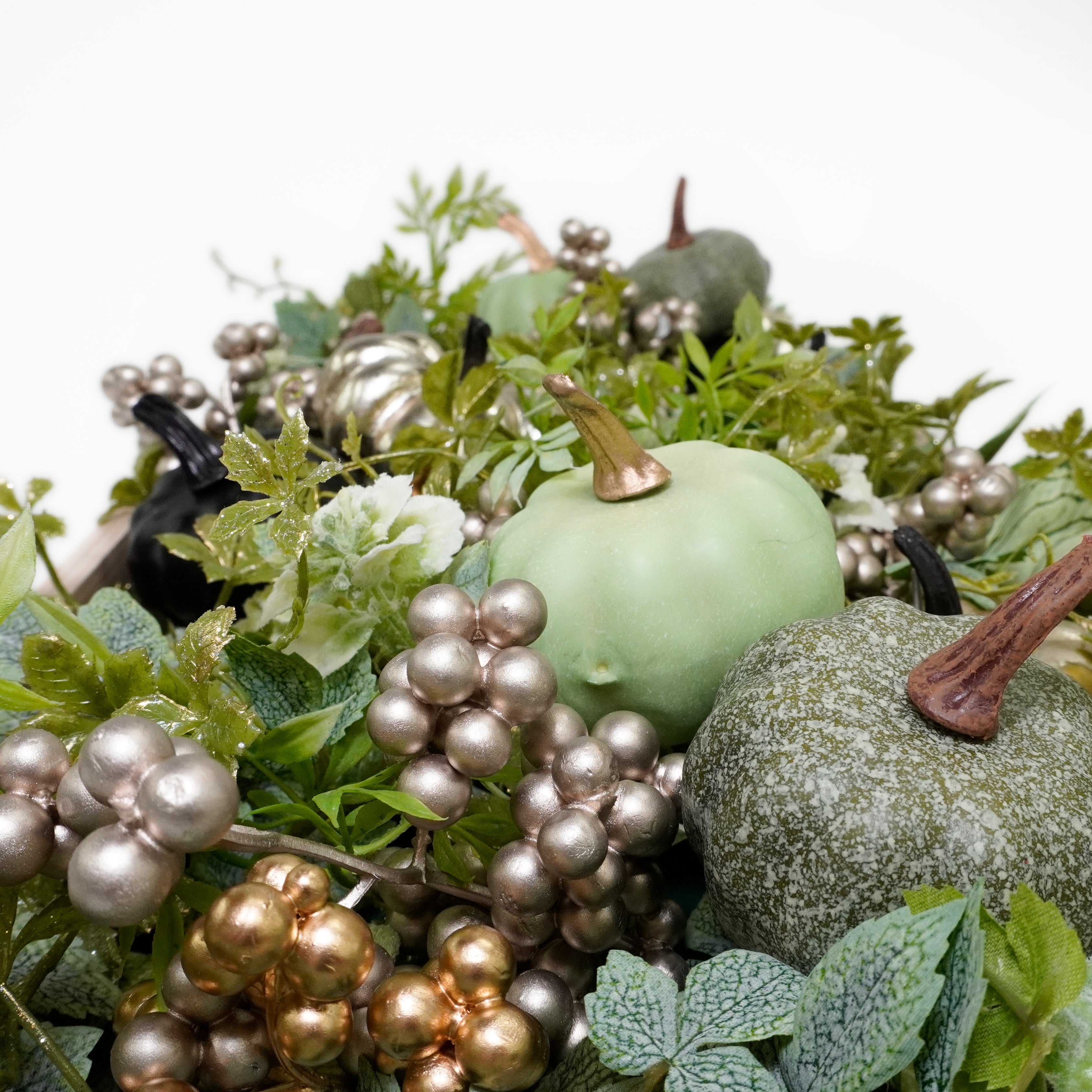 グリーンの色合いに整えられたこのアレンジメントは、置くだけで空間を秋色に染めつつ、落ち着いた印象をあたえてくれるおしゃれなアーティフィシャルフラワーです。プレゼントとしても、ハロウィンのパーティースペースなどの小物としても、空間のすき間を美しく装うためにも使い勝手の良いデコレーションです。