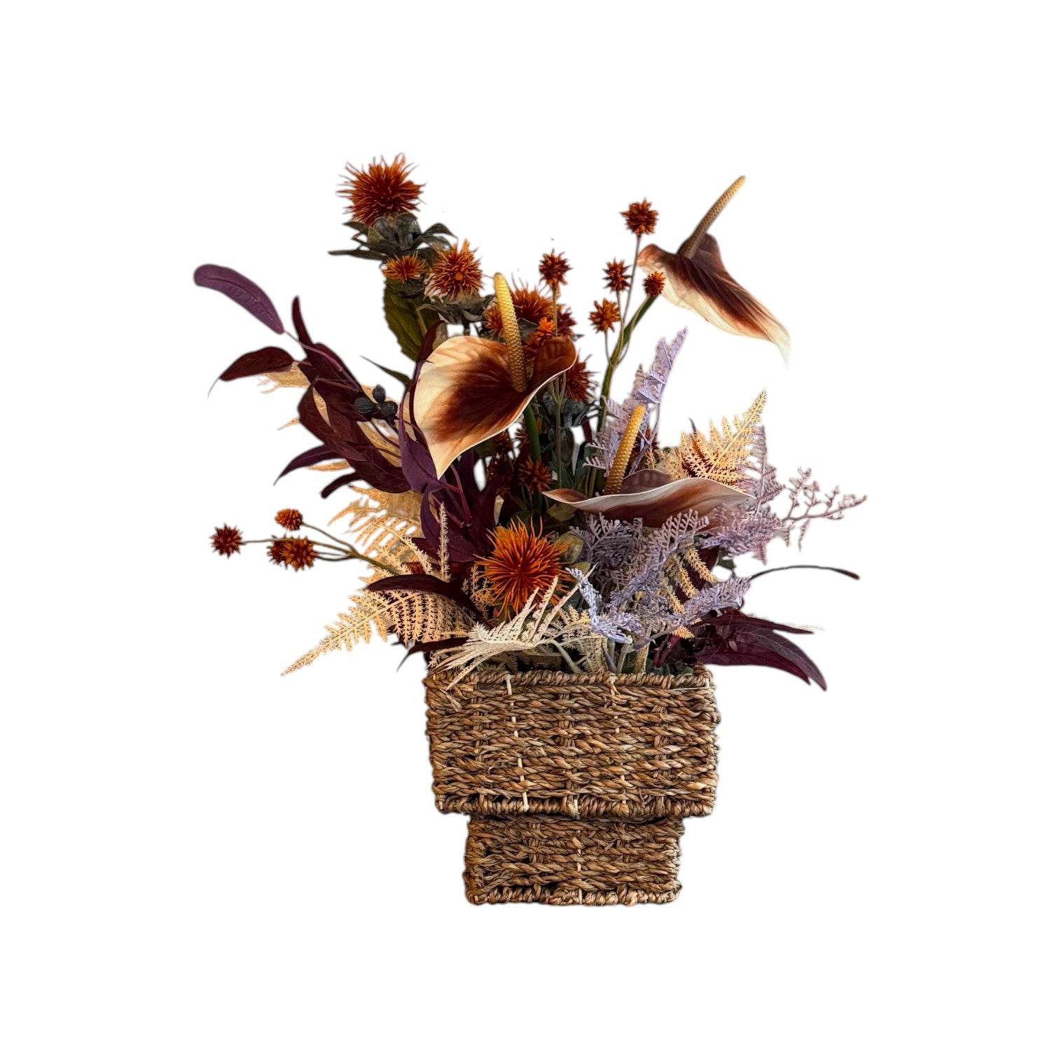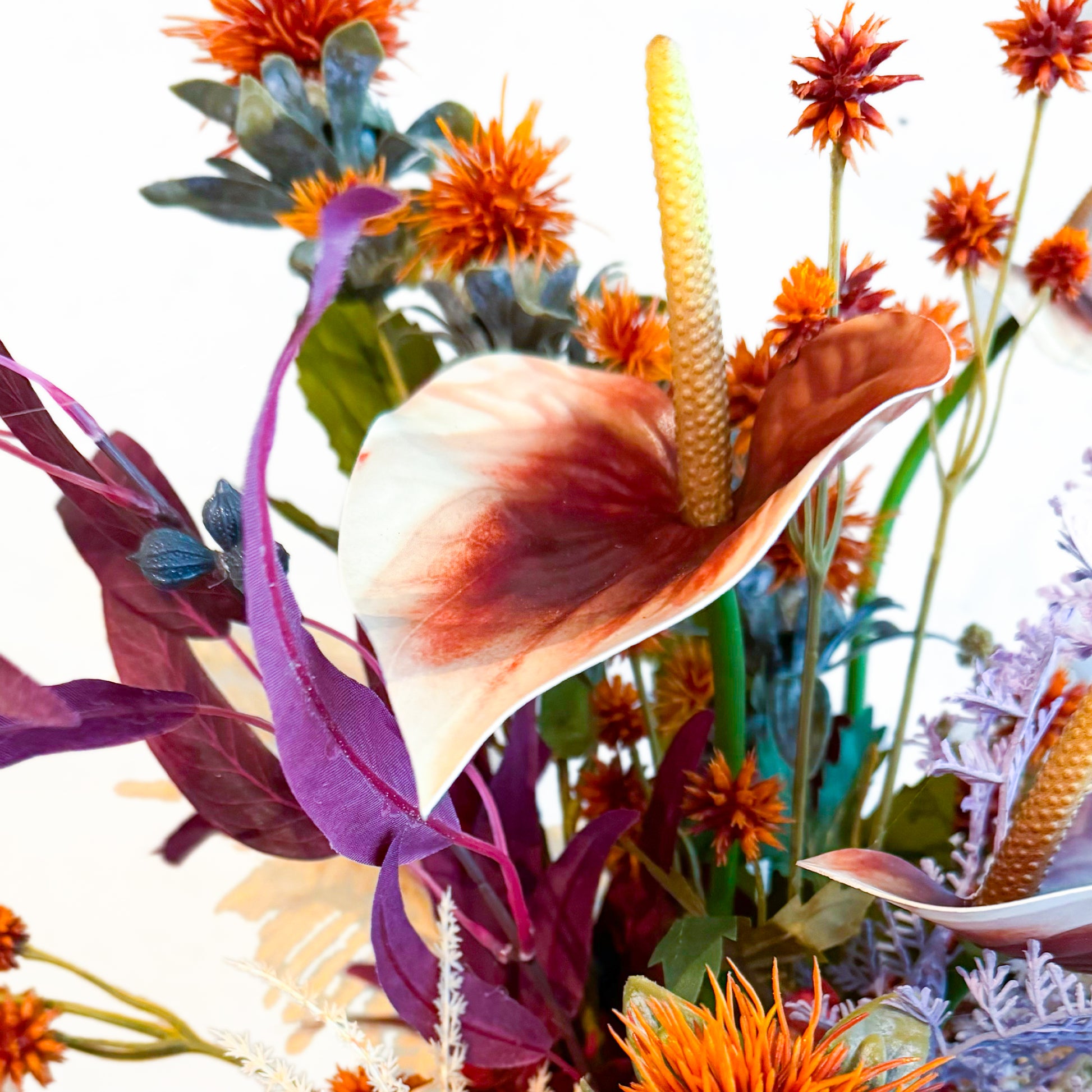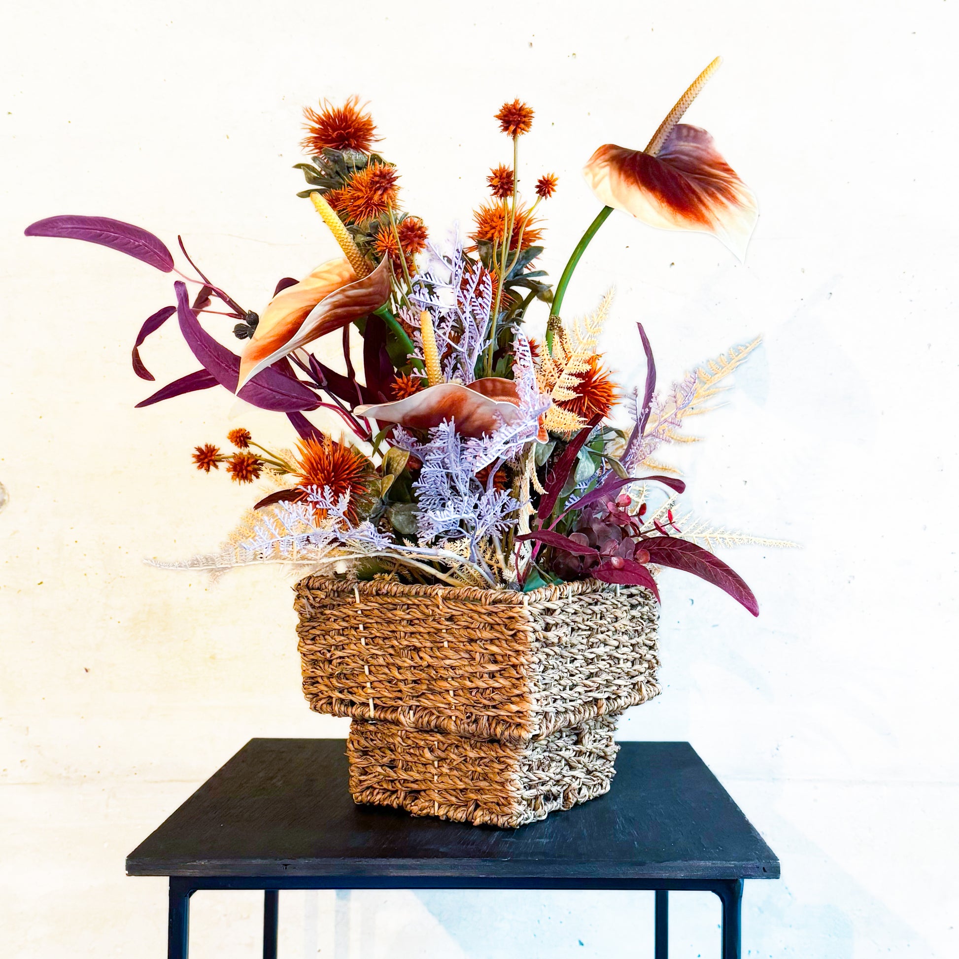 かみのあるオレンジとブラウンの花々に、くすみラベンダーやアイボリーの葉を合わせた、秋らしい深みと余韻を感じさせるアレンジメント。
