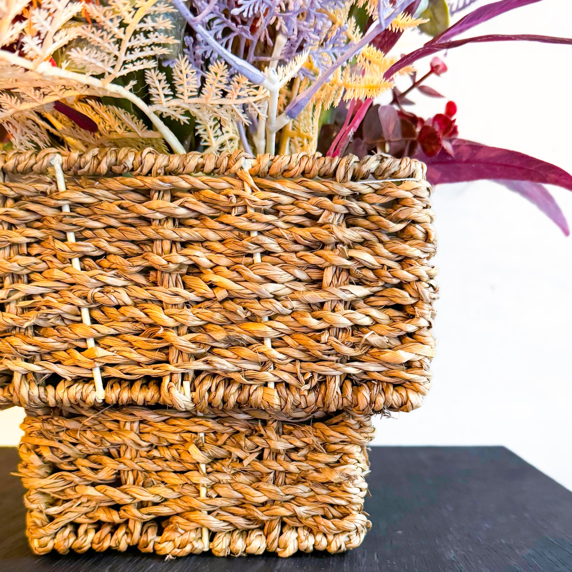 編み込みのナチュラルバスケットが、モダンでありながらどこか素朴な雰囲気を引き立て、空間に落ち着きと個性を添えます。