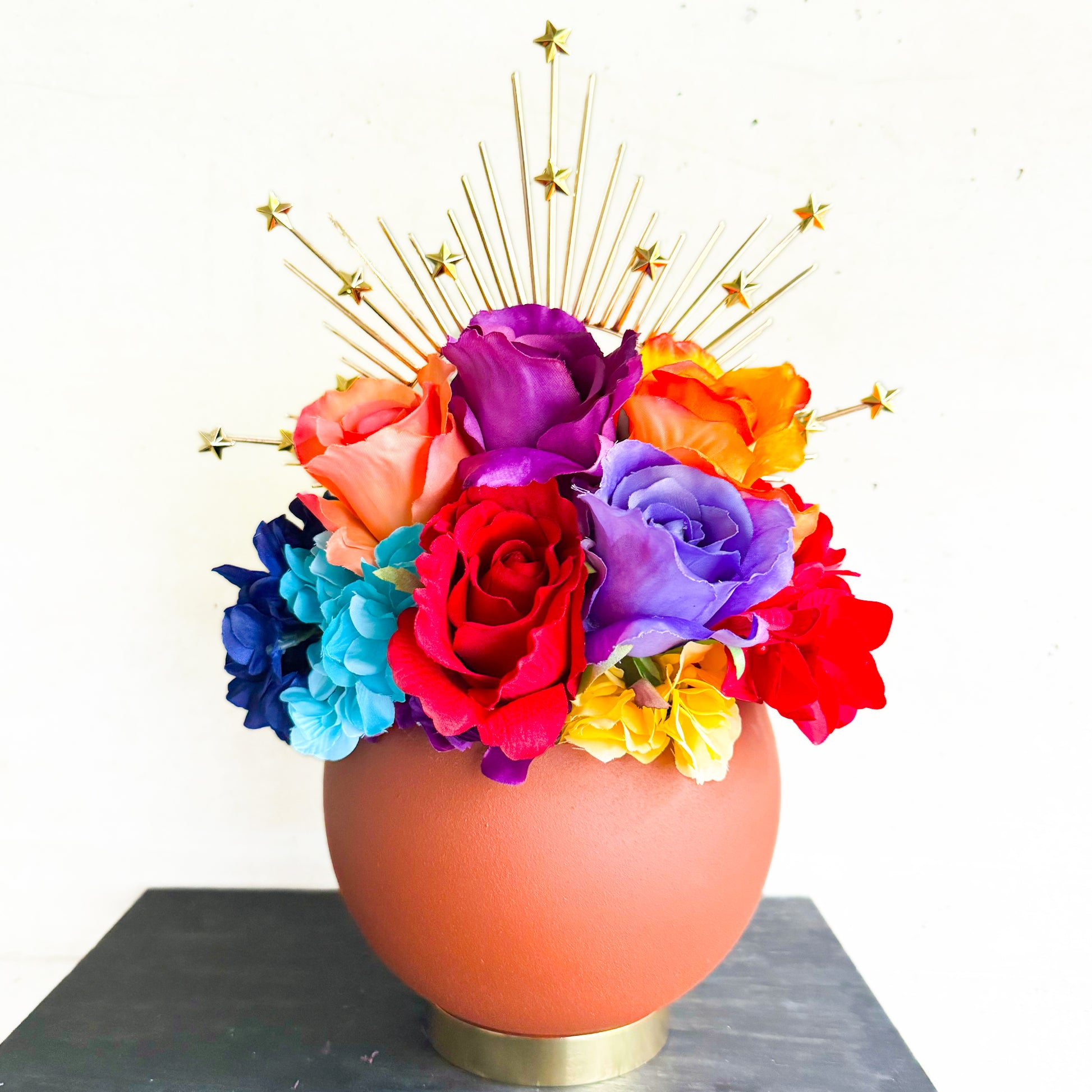 テラコッタカラーの丸みを帯びたベースは、温かみとモダンな雰囲気を兼ね備え、ゴールドのスターオーナメントが祝祭のきらめきを添えます。