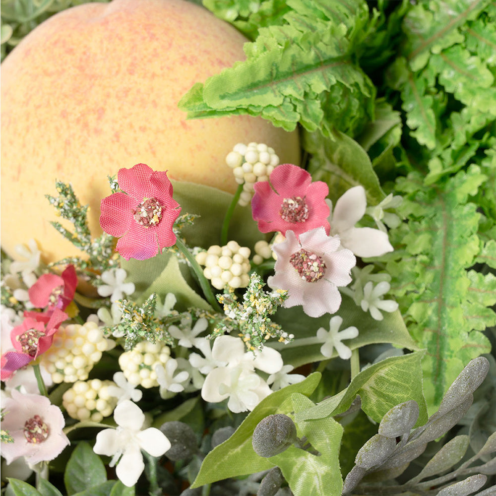 - 花材:リンゴ、青りんご、オレンジ、レモン、洋ナシ、バナナ、ブドウ、グリーン、ブルーベリー、ブロッサムフラワー