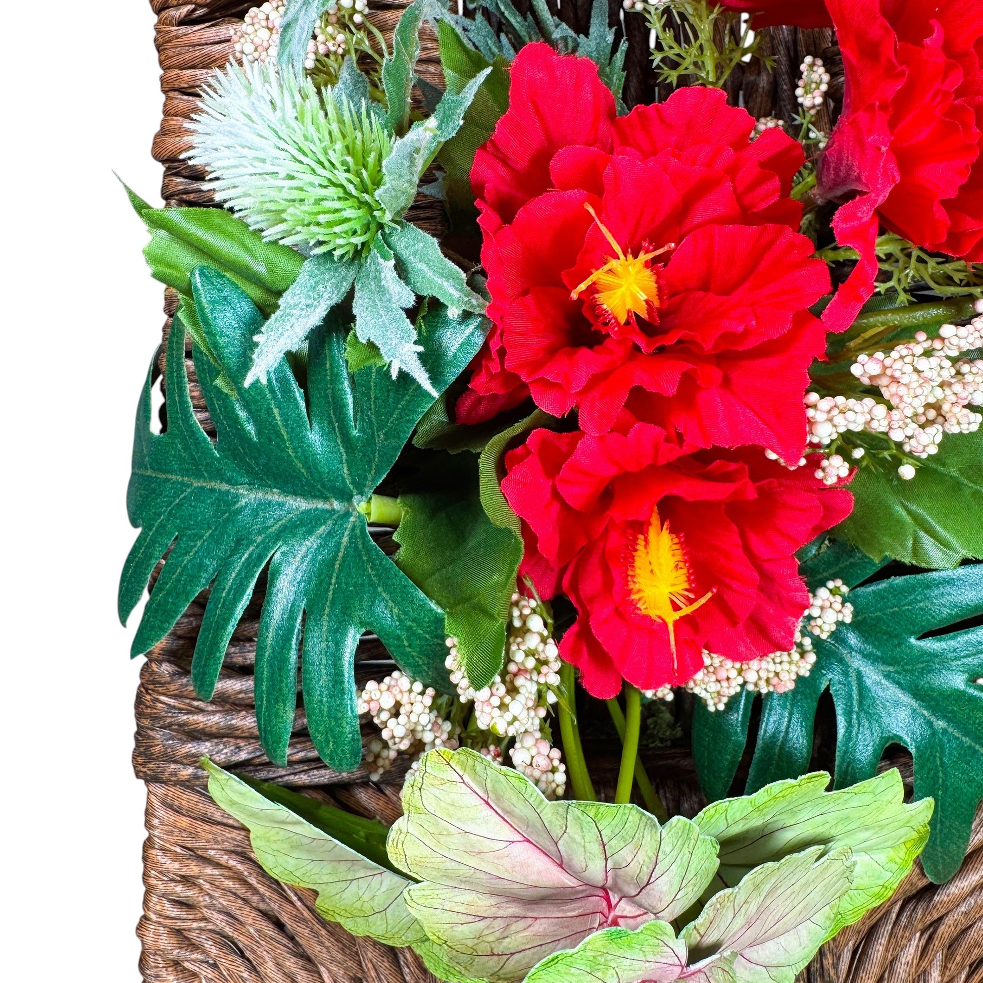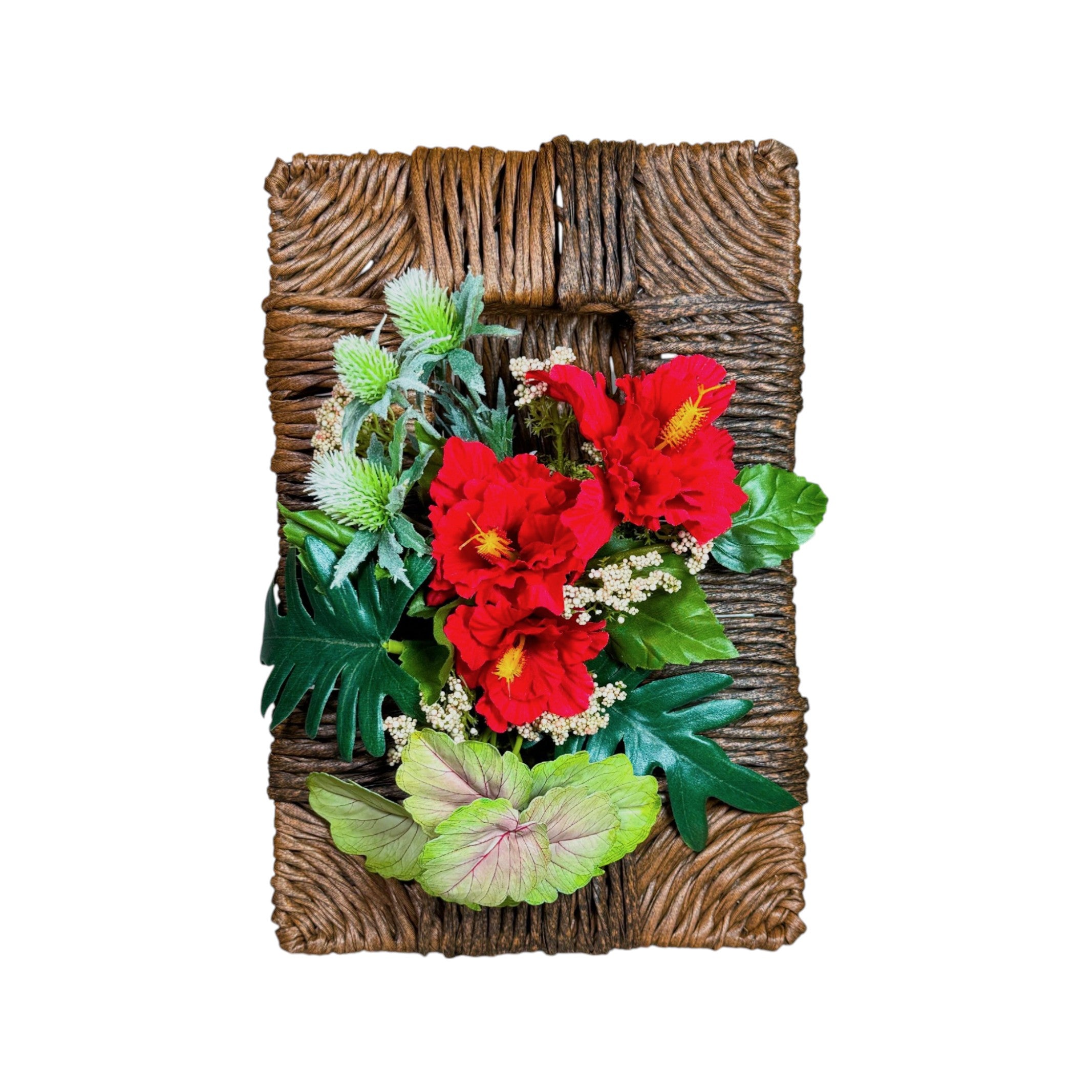 店舗やオフィス、ご自宅において、空間を夏仕様に模様替えしたい時におすすめなハイビスカスのデコレーション。フックに吊るして壁にかけるだけで、まるでリゾート地にいるかのように、潮騒が聞こえてきそうなアレンジメントです。「上品な美しさ」「華やか」な言葉どうり、一際存在感のあるハイビスカス。それを囲むトロピカルな印象のモンステラ、優し気な小花はエリンジウム。ベースもナチュラルに仕上げているため、様々なシーンにマッチしやすく使いやすいアイテムです。