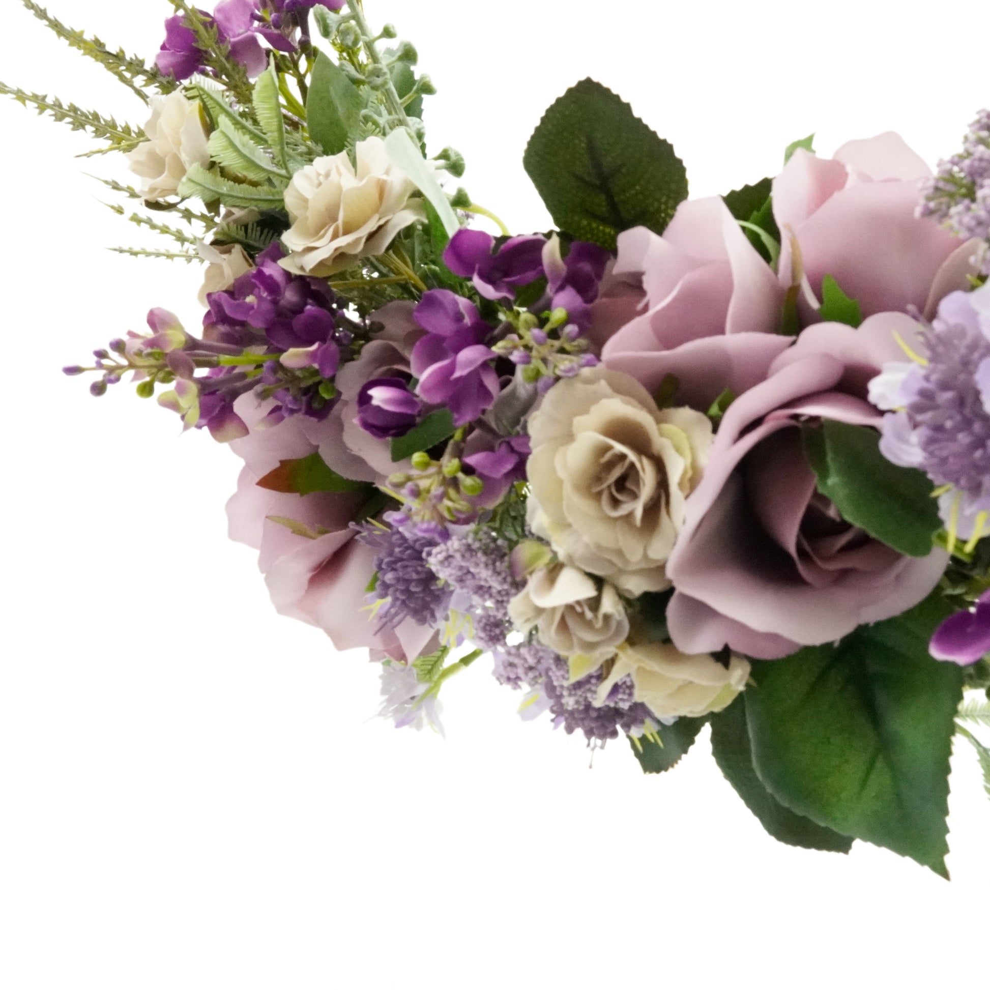 この愛らしいフープブーケは、輪っかの形から「永遠」を意味し、縁起のいい形をしております。ローズ、スカビオサやアカシアベリーを使用した淡いパープルの色合いは、やわらかくロマンティックな雰囲気を演出できます。