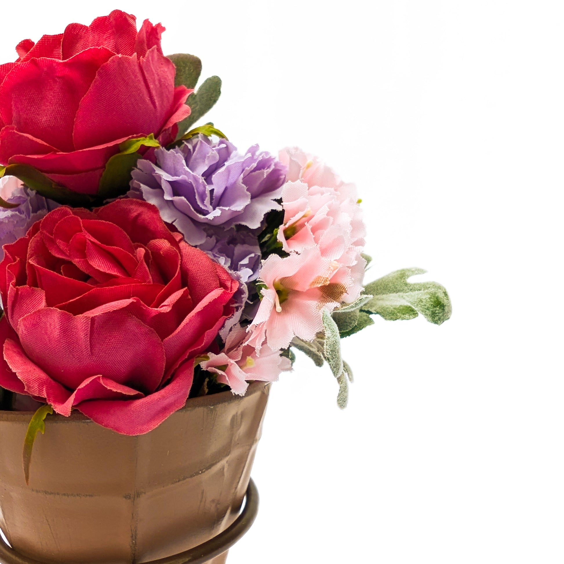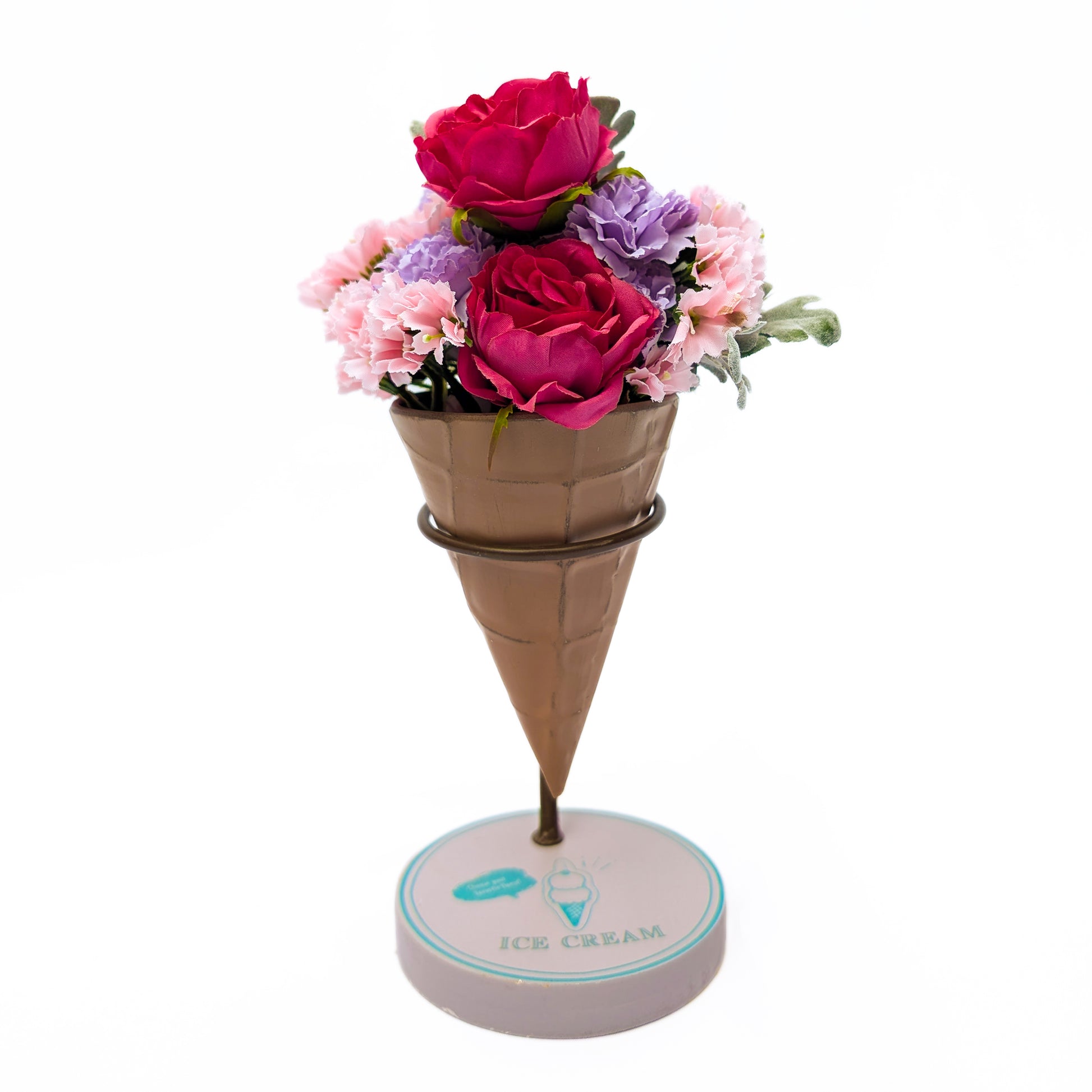 まるでアイスクリームのようなコーンに入った、可愛らしいアイスクリームブーケは渡しやすいだけでなく、付属のカップホルダーを使えば玄関やカウンターなどに飾ることができ、大変使い勝手のよいアーティフィシャルフラワーです。ファッショナブル、おしゃれ好き、かわいい小物が好きなお母様への贈り物として、自分用としても大変おすすめの逸品です。
