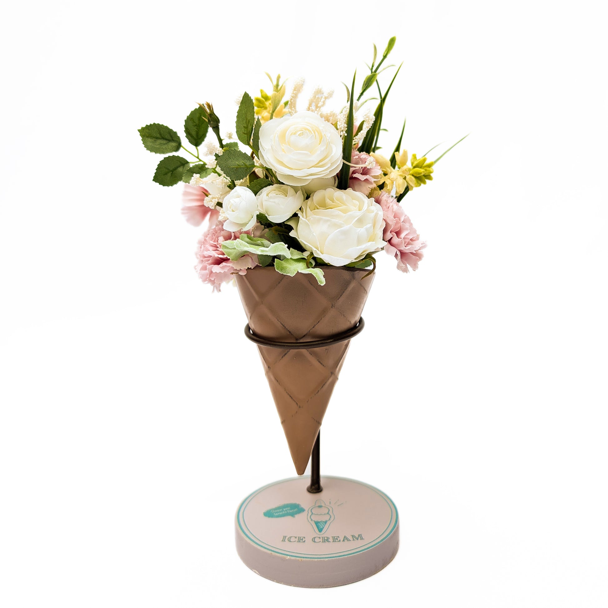 まるでアイスクリームのようなコーンに入った、可愛らしいアイスクリームブーケは渡しやすいだけでなく、付属のカップホルダーを使えば玄関やカウンターなどに飾ることができ、大変使い勝手のよいアーティフィシャルフラワーです。ファッショナブル、おしゃれ好き、かわいい小物が好きなお母さまへの贈り物として、自分用としても大変おすすめの逸品です。