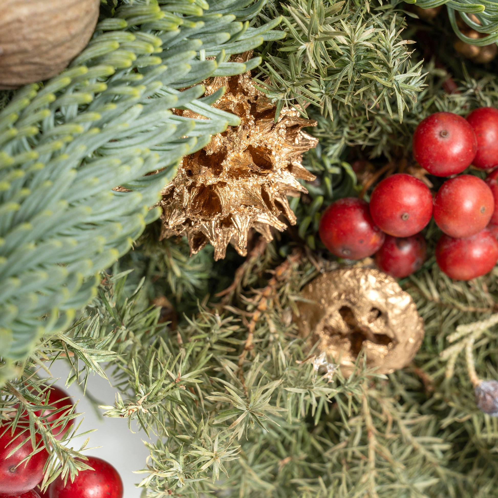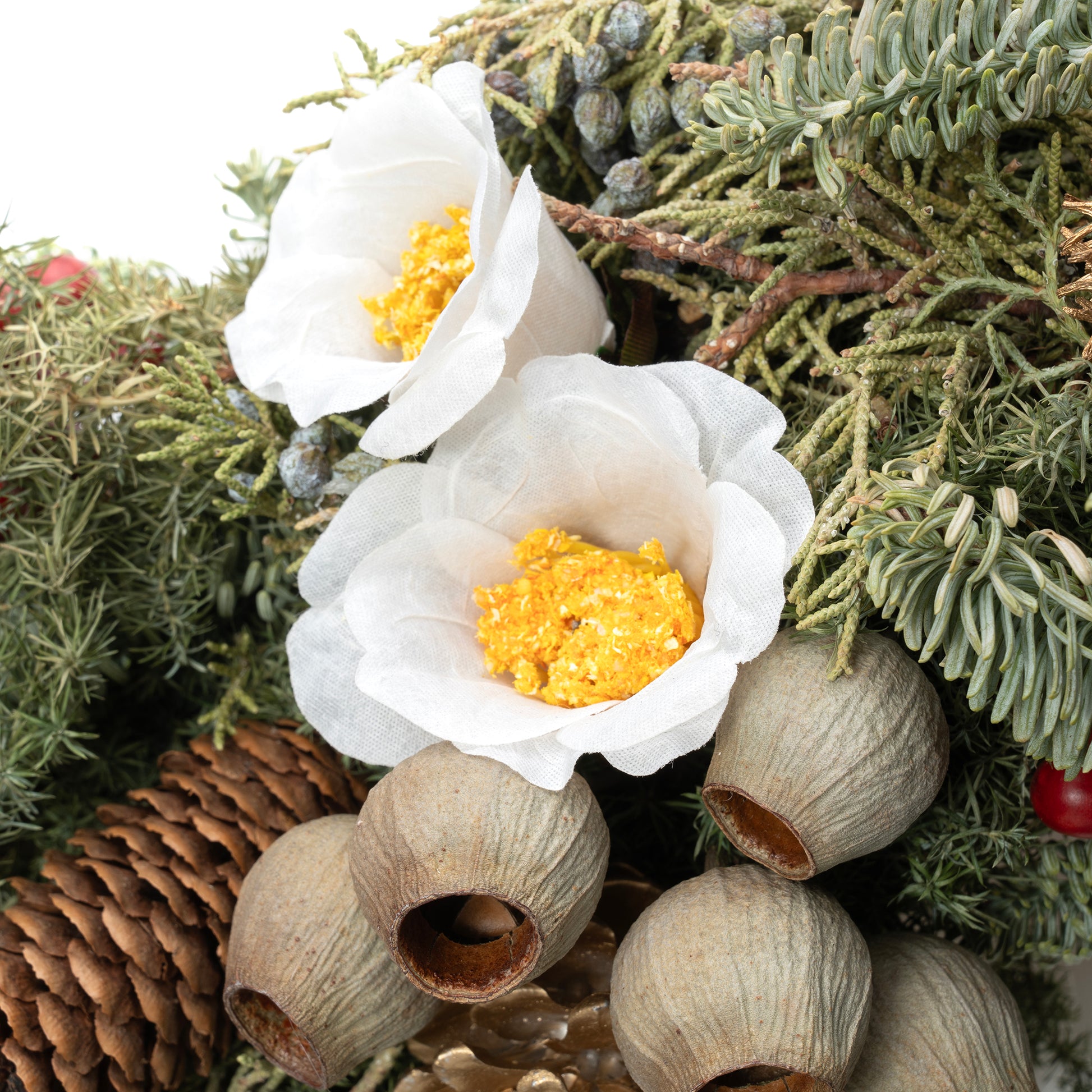 神様をお迎えするのに相応しい和リース。ドライフラワーで作られナチュラルで柔らかな印象を与え、あらゆる空間に馴染みそうな万能なアレンジメントです。福に満ちた新年を迎えるべく、「魔よけ」や「人との縁」の意味を込めた水引、花言葉が不老長寿と言われる松ぼっくり、縁起のよい紅白の椿と菊がモダンの中にたおやかに和を感じさせます。神様をお迎えし、福を呼び込みたい皆様におススメしたい飾りです。
