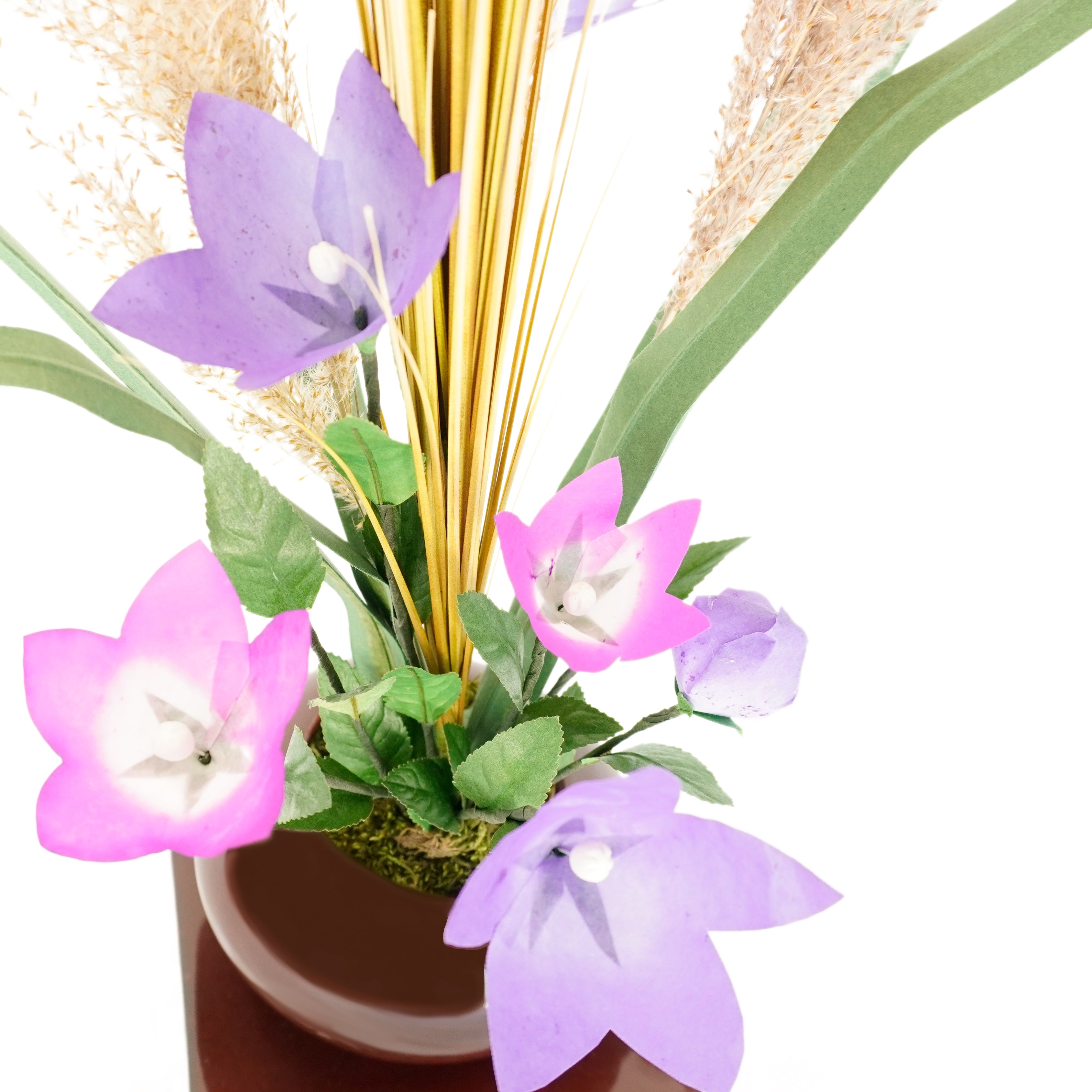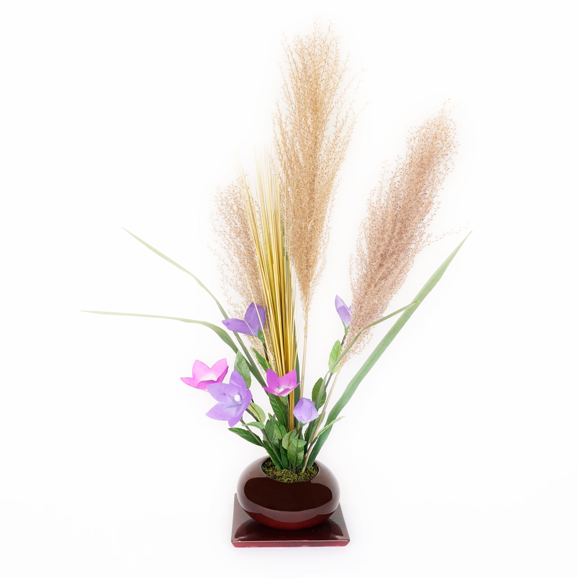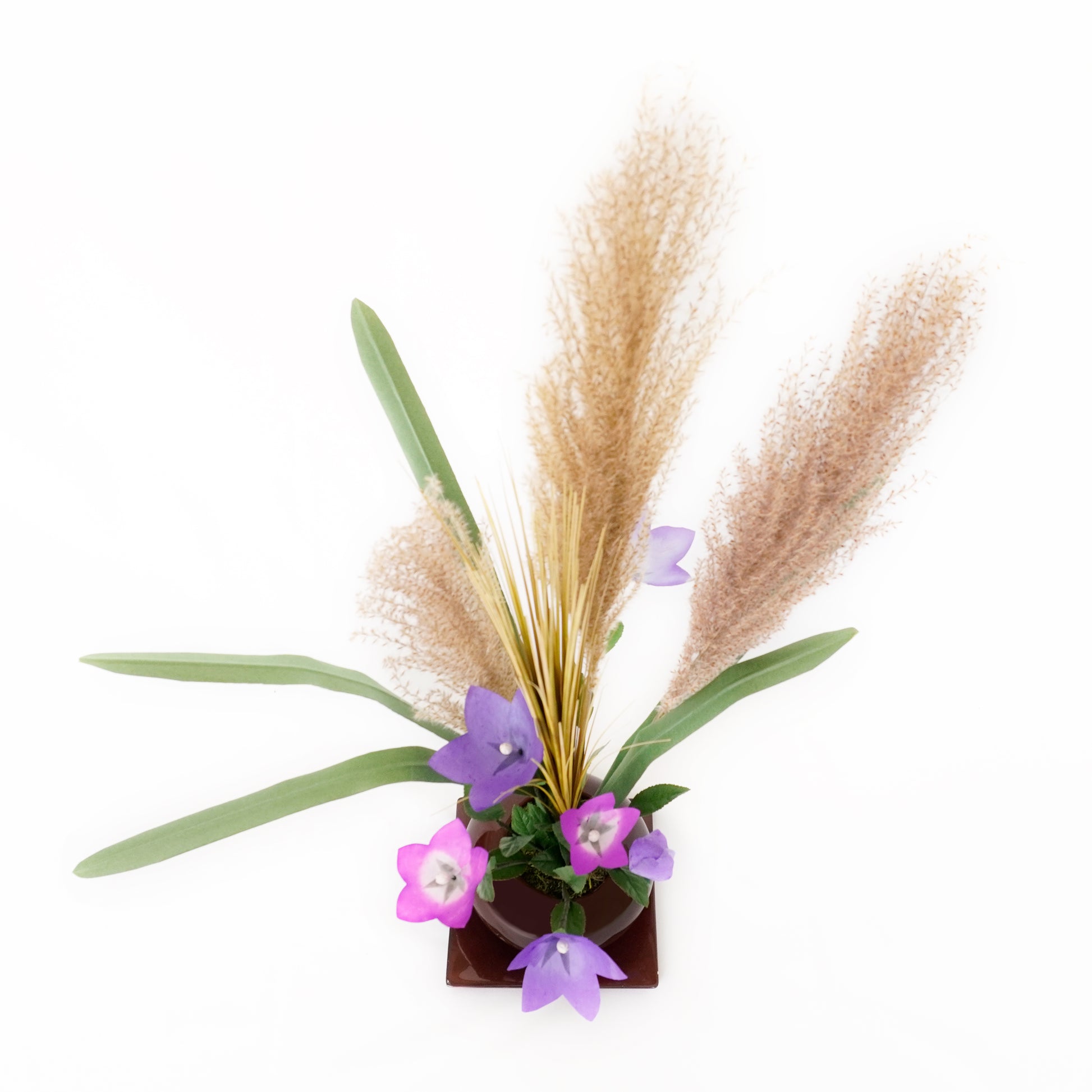 夏の終わりからお月見の時期を目処に、床の間やオフィスなどに飾って頂き、季節の移ろいを堪能頂ける華やかなデコレーション。花言葉どおり「気品」を感じさせる和紙を染め上げて造った桔梗と、イキイキと伸びた穂先から感じられるように「活力」「生命力」が花言葉であるススキ、モスは置くだけで秋の存在を十分感じさせてくれることでしょう。華やかなデコレーションは贈り物としてもおすすめです。