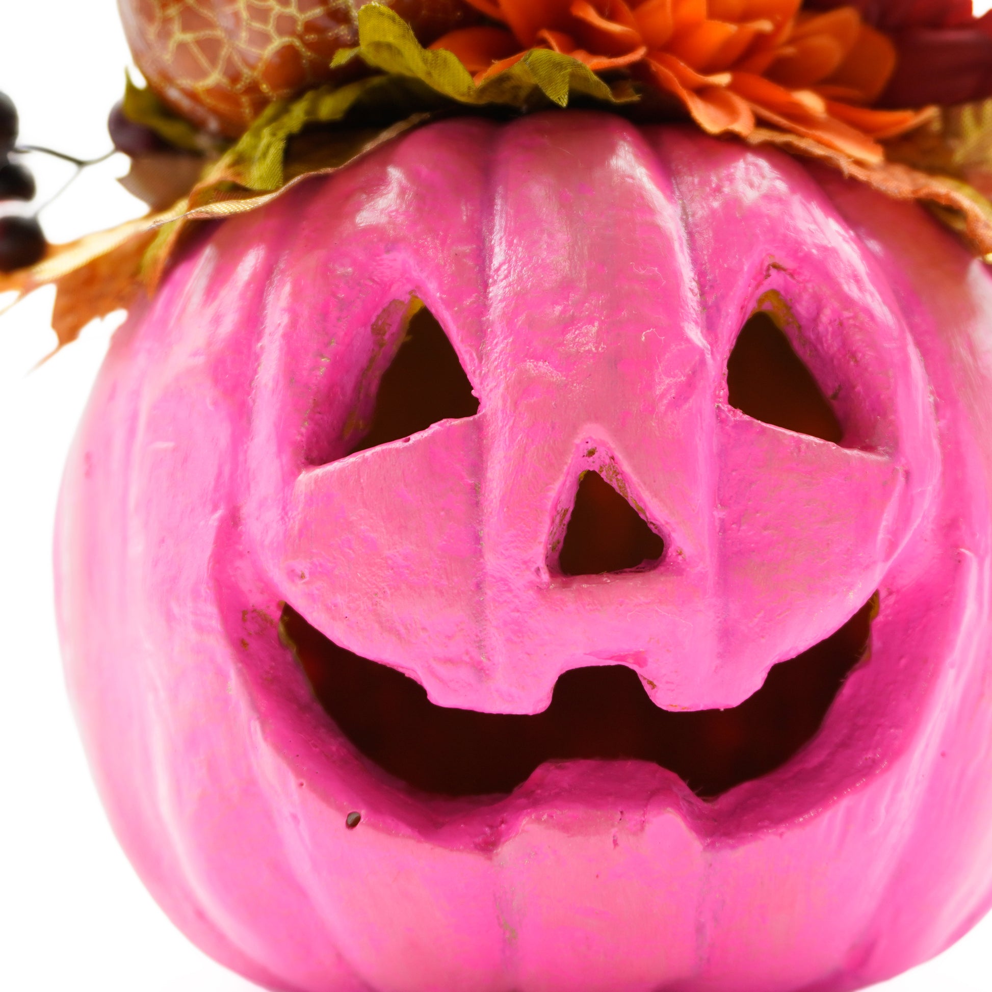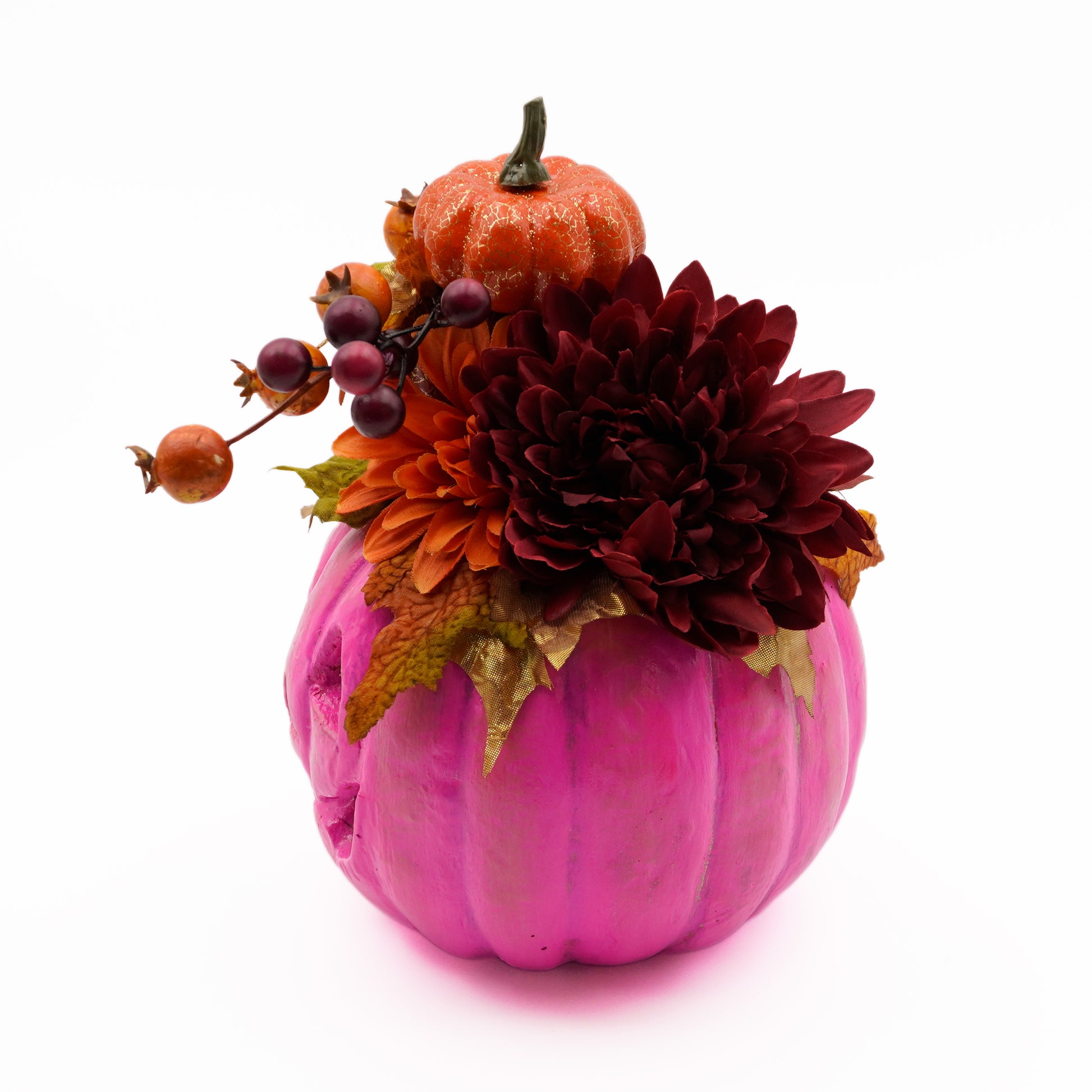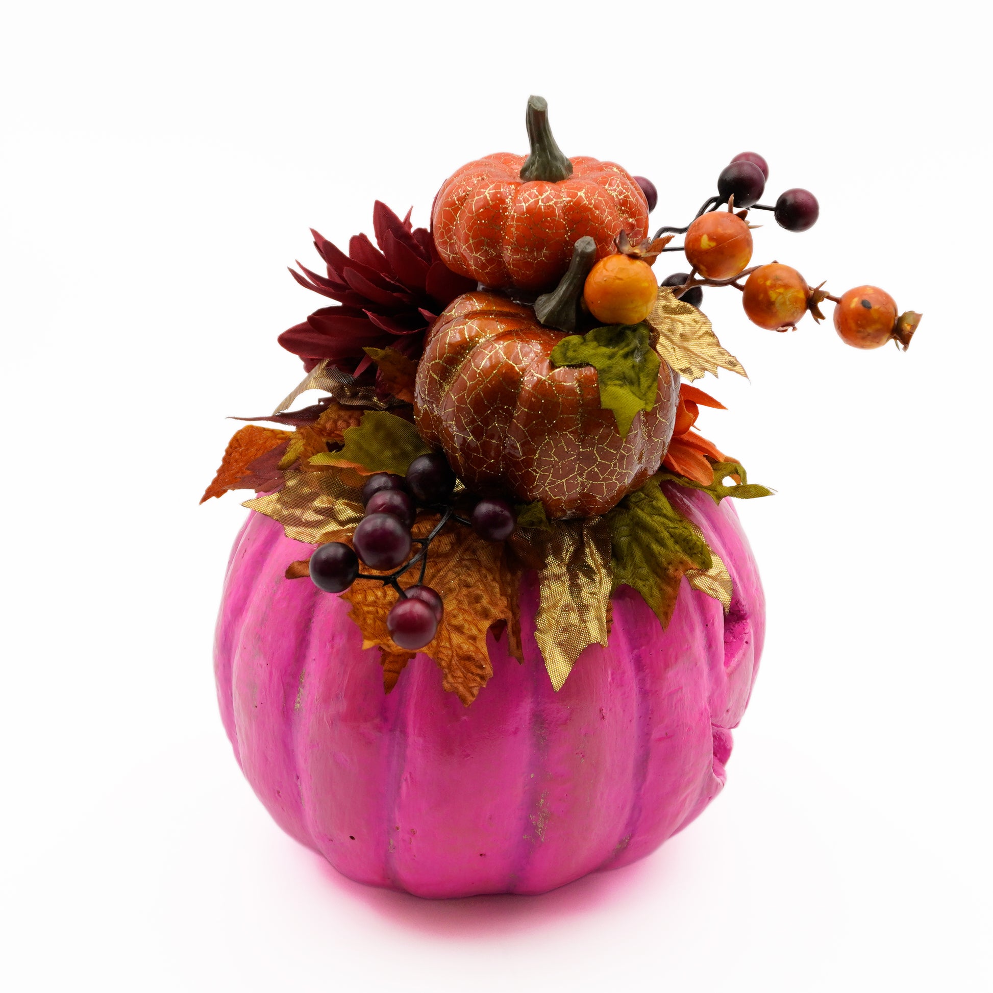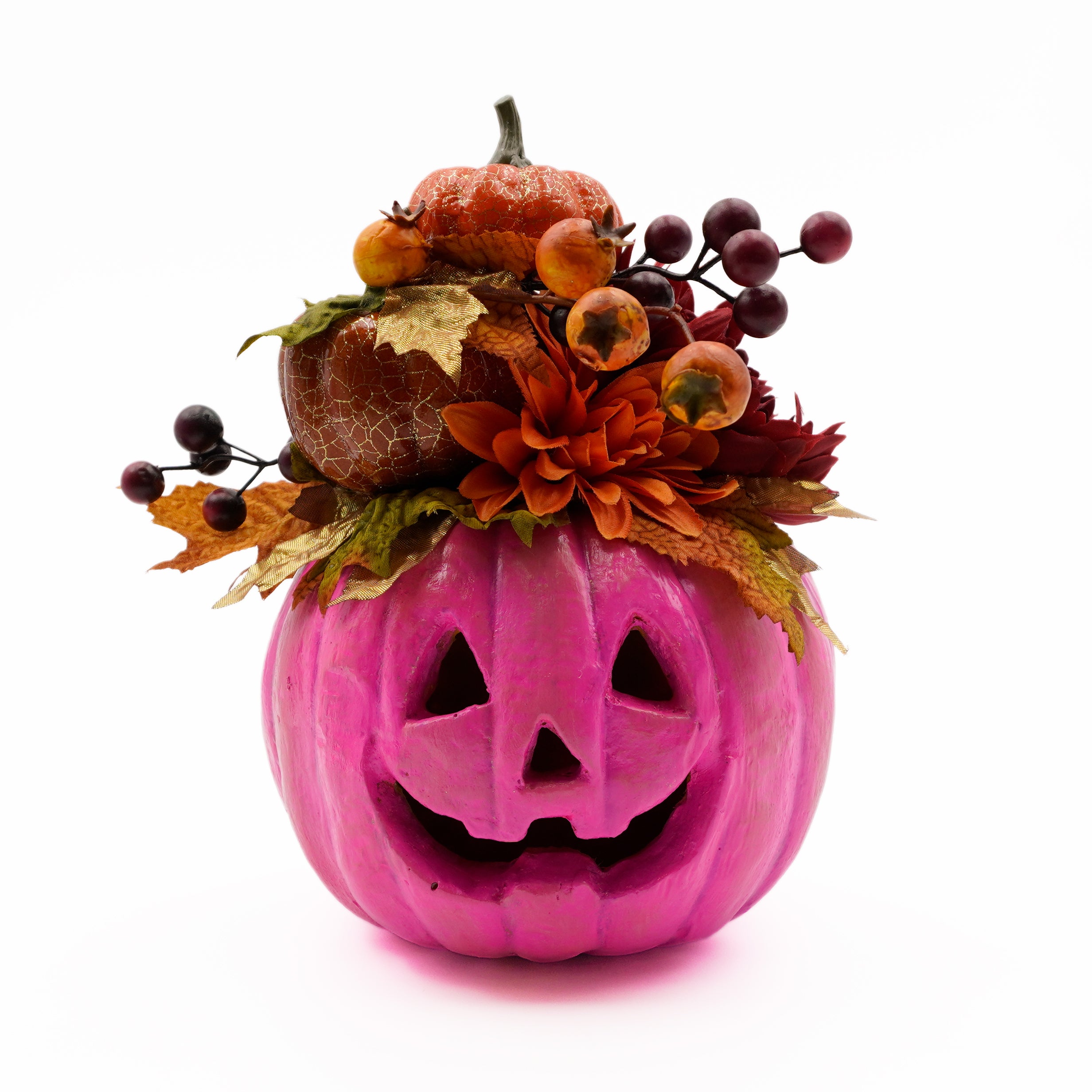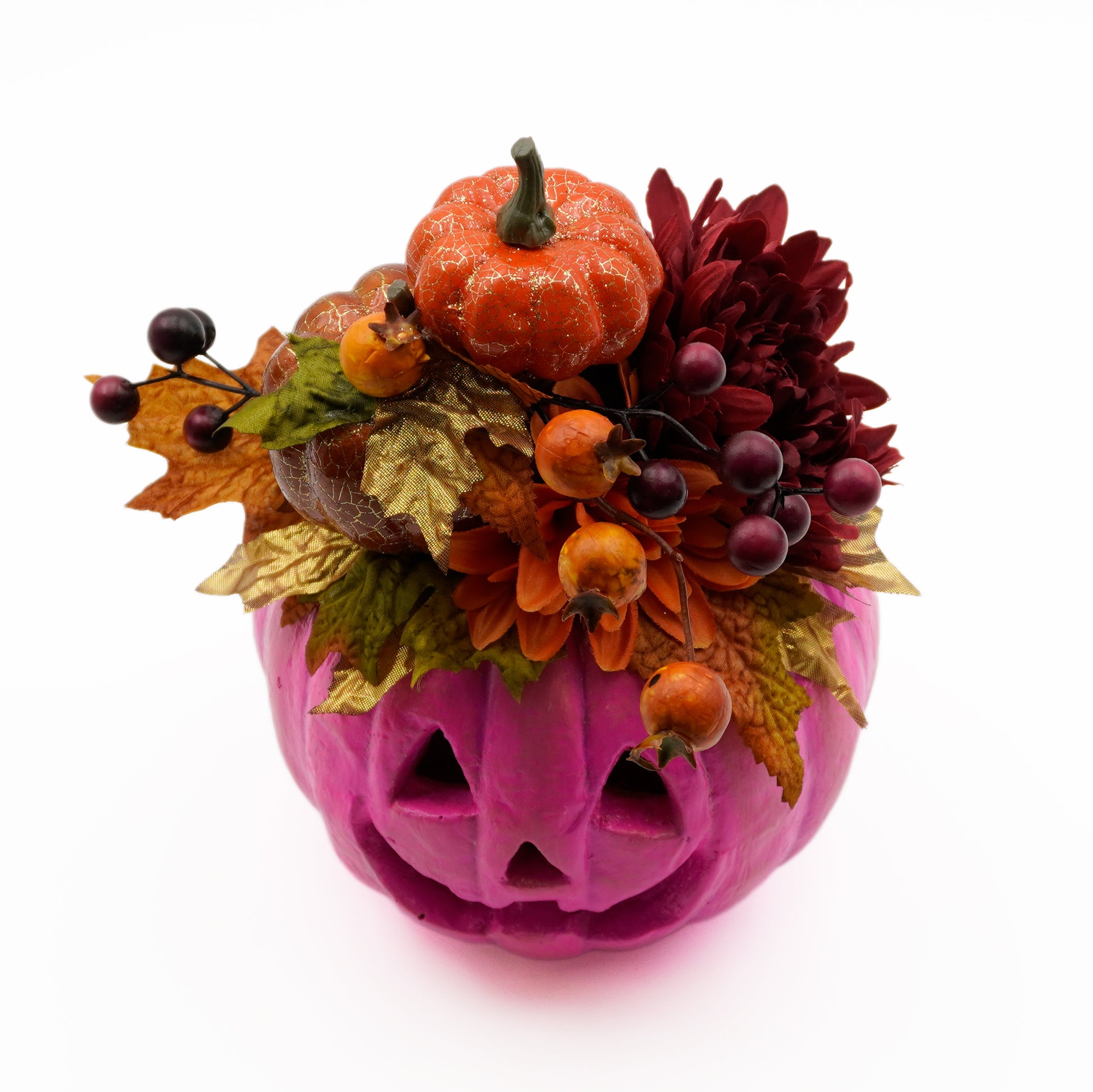 ビビットなマゼンタピンクのかぼちゃランタンに、ベリーやかぼちゃ、ダリアなどの彩りを添えることでインテリアとして華やかさを演出します。ハロウィンのパーティースペースなどの小物としても使い勝手が良く、玄関やウェルカムスペースなどに飾るだけで、場が華やぐでしょう。