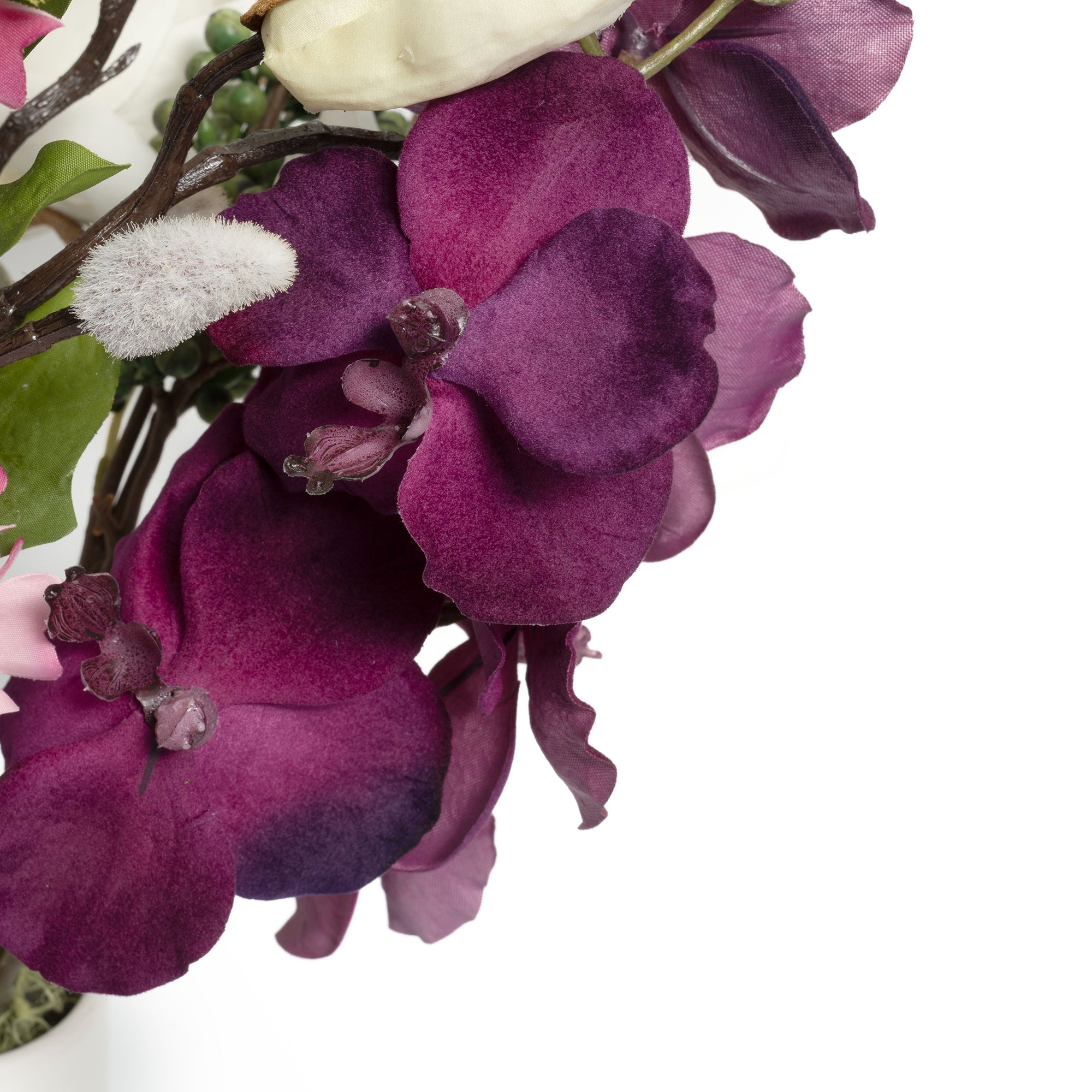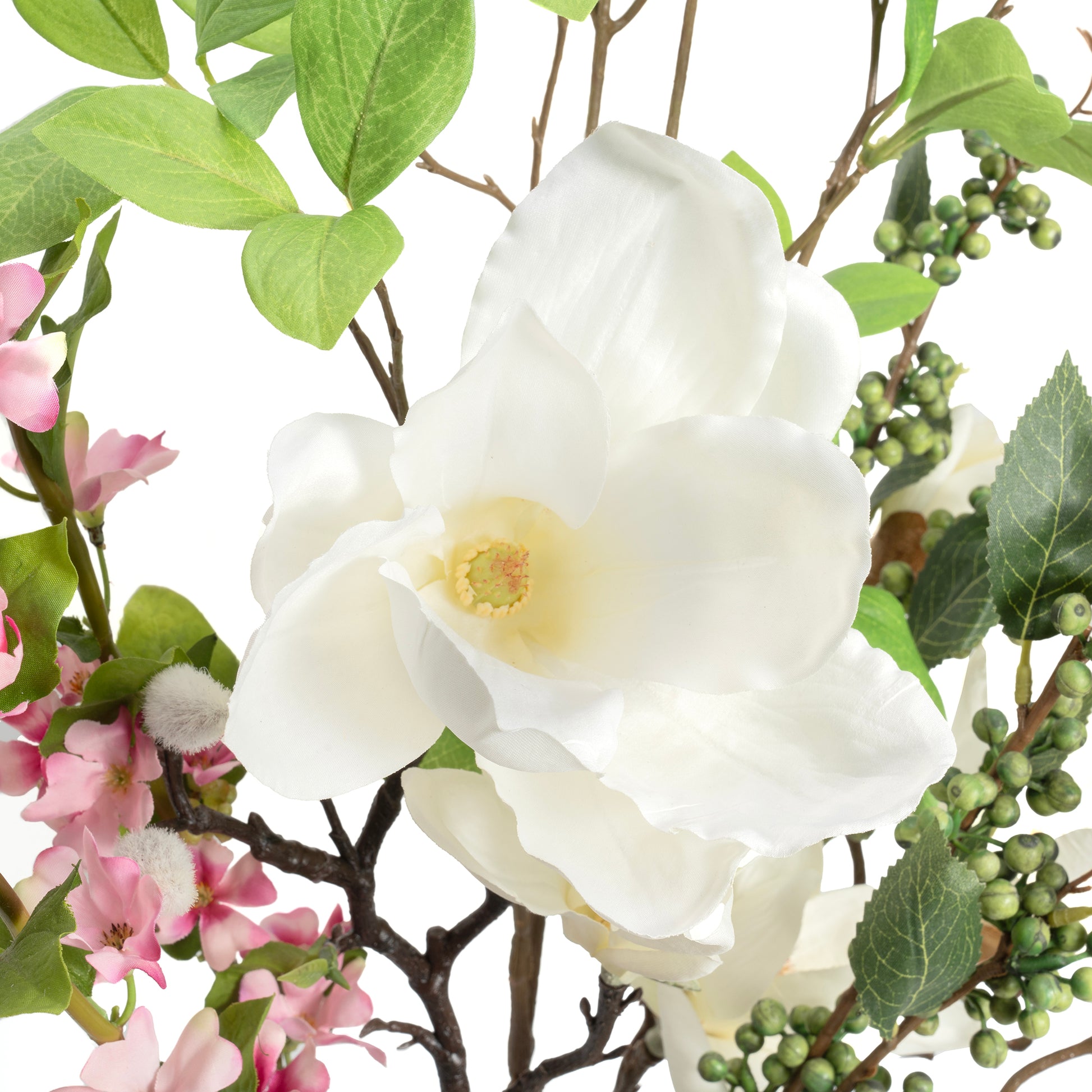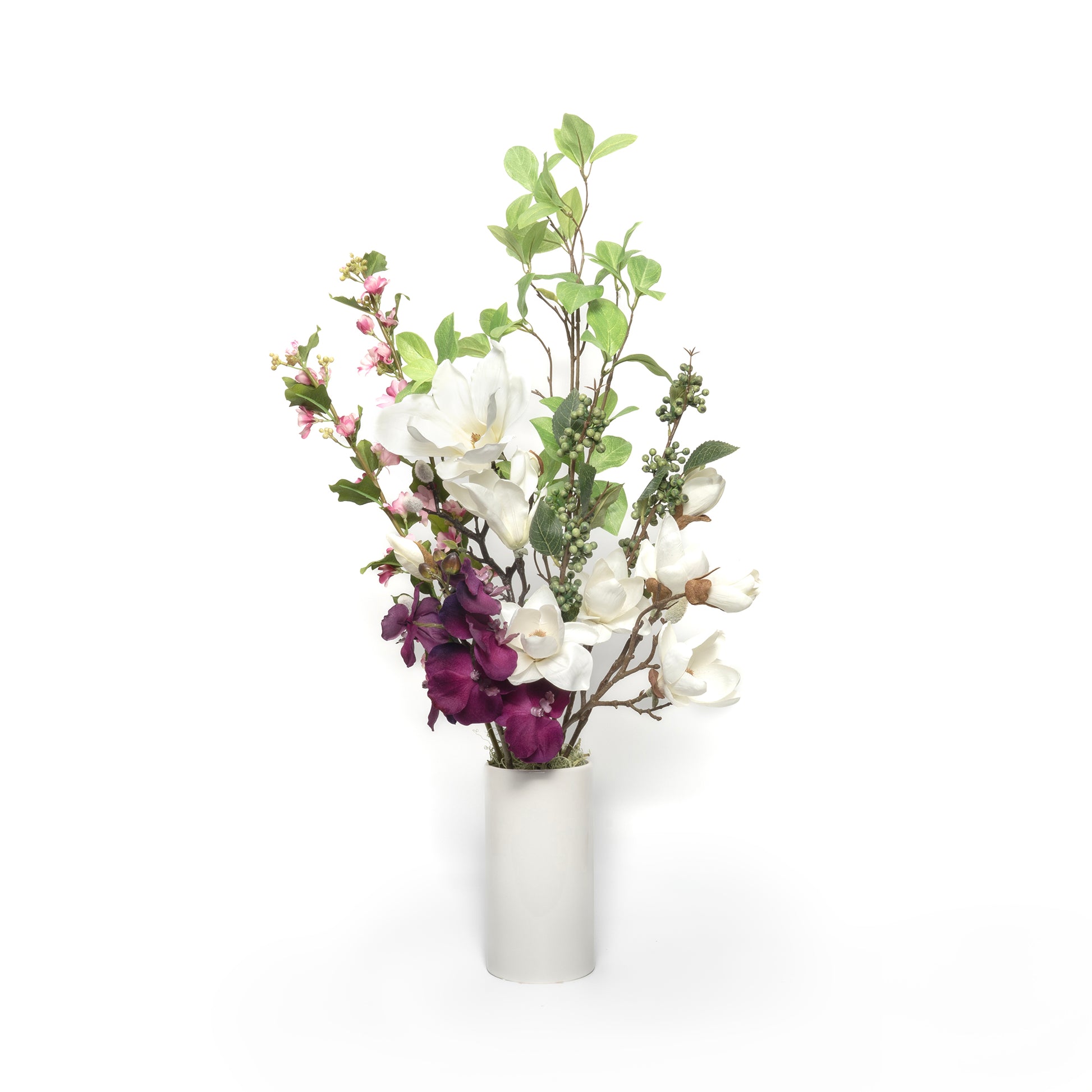 モクレン、胡蝶蘭、ドウダン、ピンク色の愛らしいブロッサムステムなどを組み合わせた上品なアレンジメントです。エレンガントかつラグジュアリーなアレンジメントは、置くだけで空間をランクアップさせてくれる特別な存在感を持っています。お部屋のトーンを邪魔しにくい馴染のよいカラーなので、あらゆる方へ贈りやすい逸品です。