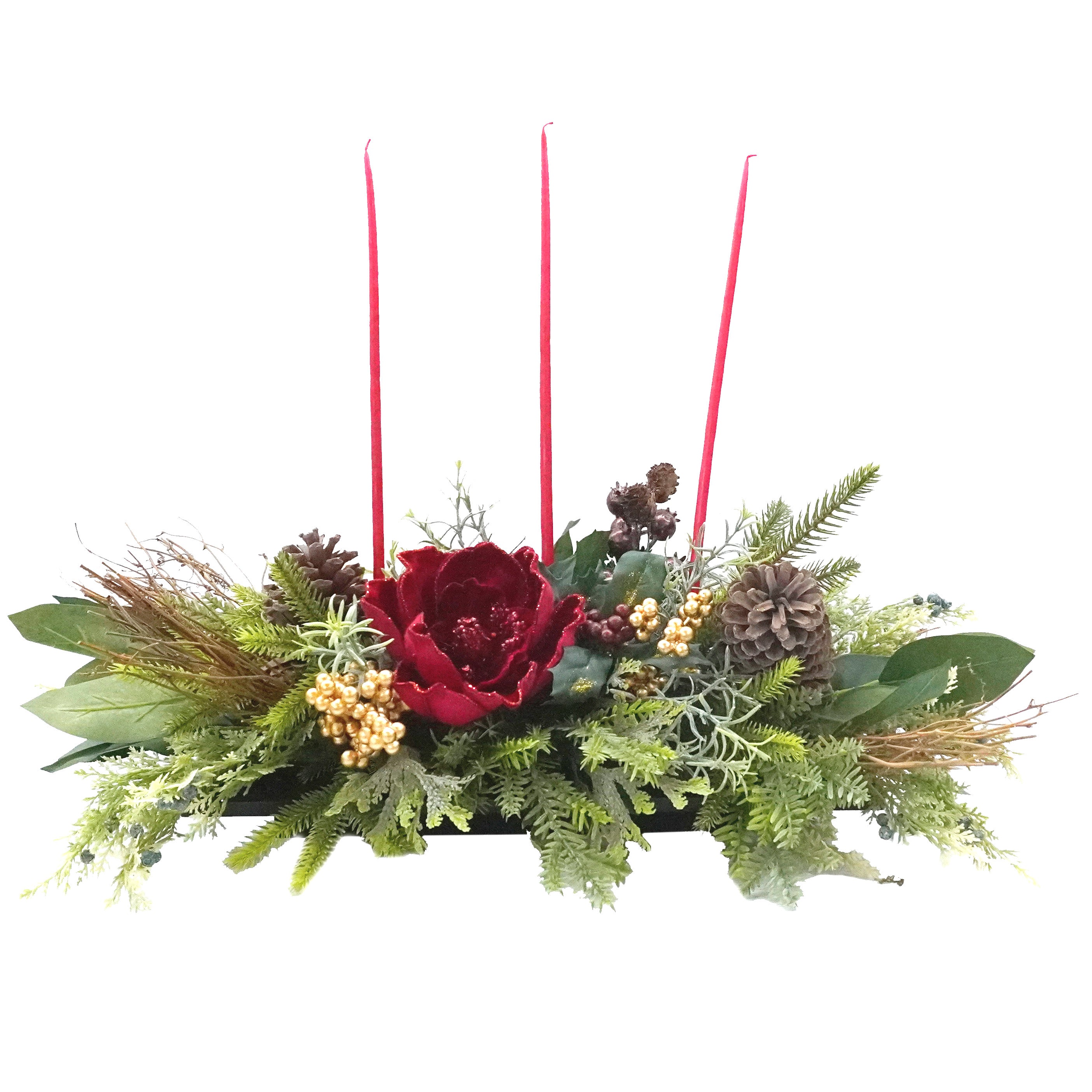 華やかでボリュームのある美しいアレンジメントでクリスマスシーズンを温かく彩ります。赤いベルベットのマグノリアがポイントになり、贅沢さと優雅さを演出します。豊かな雰囲気を与えることで、さらに特別な空間へと変えます。テーブルやお玄関のコンソール・オフィス等多様に使える、贅沢な一品です。