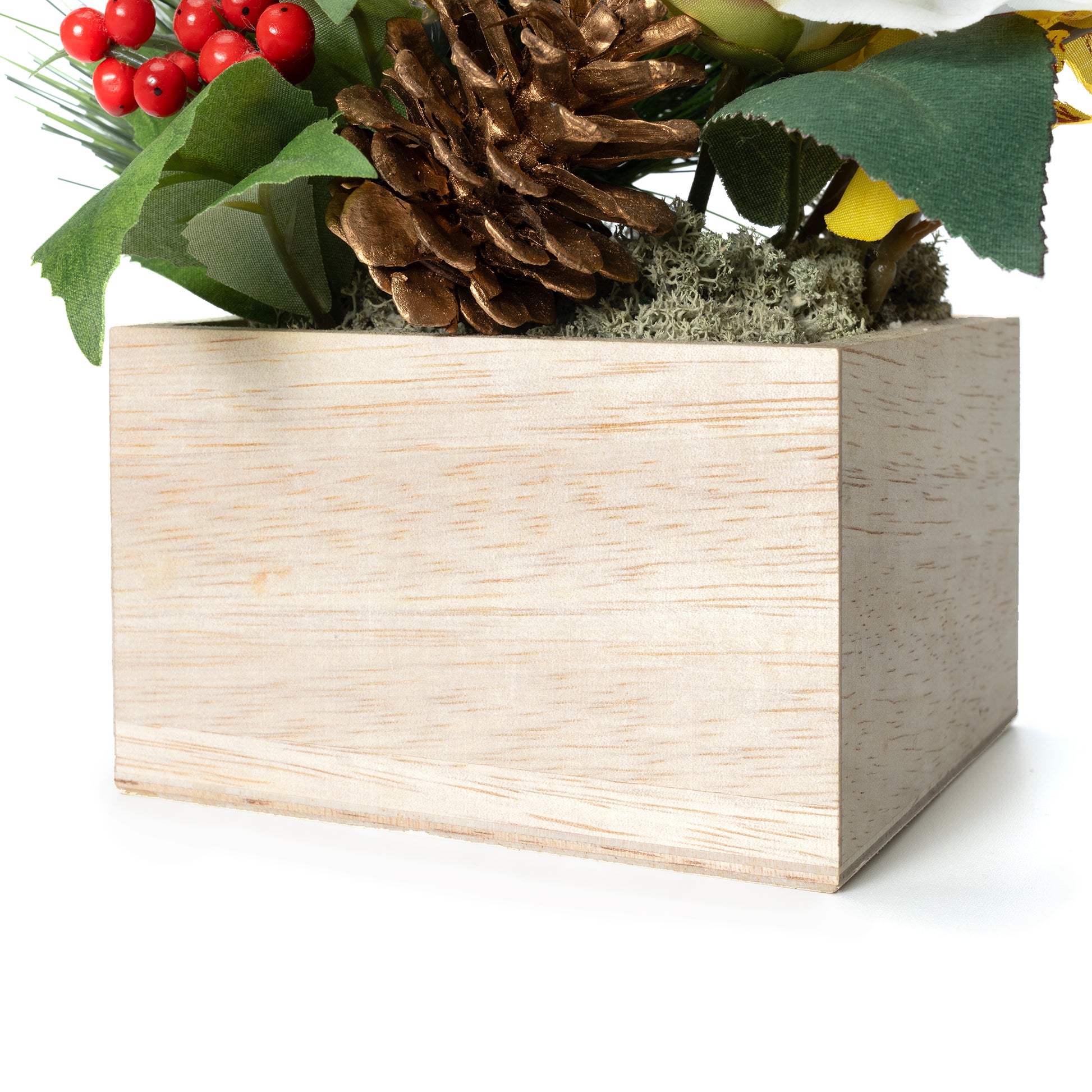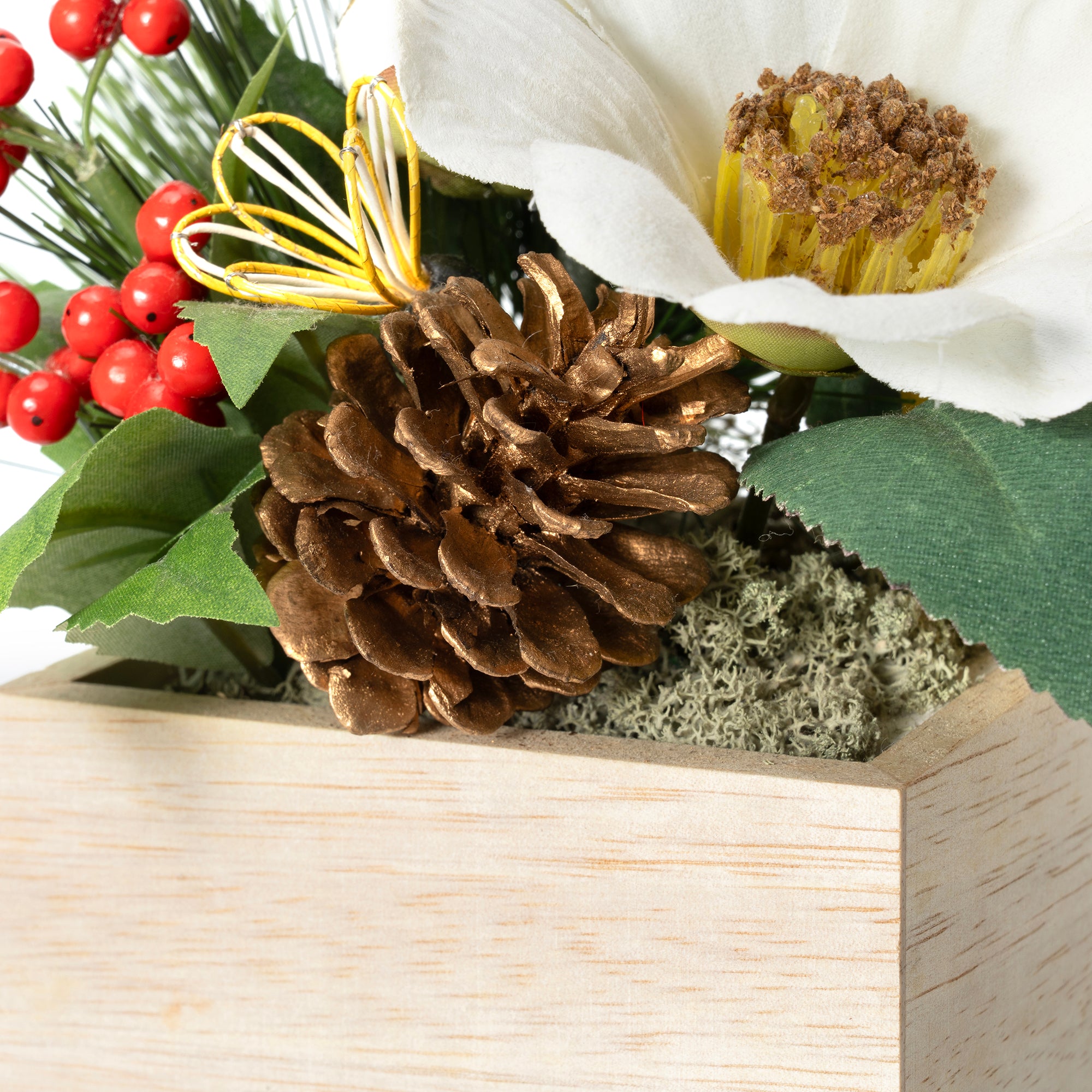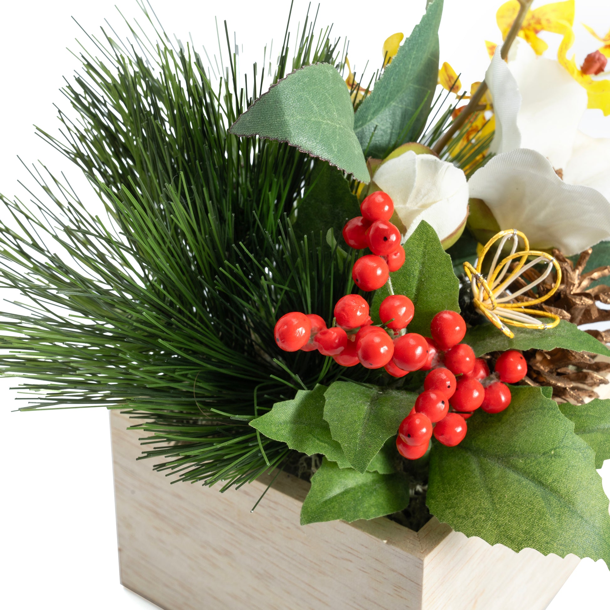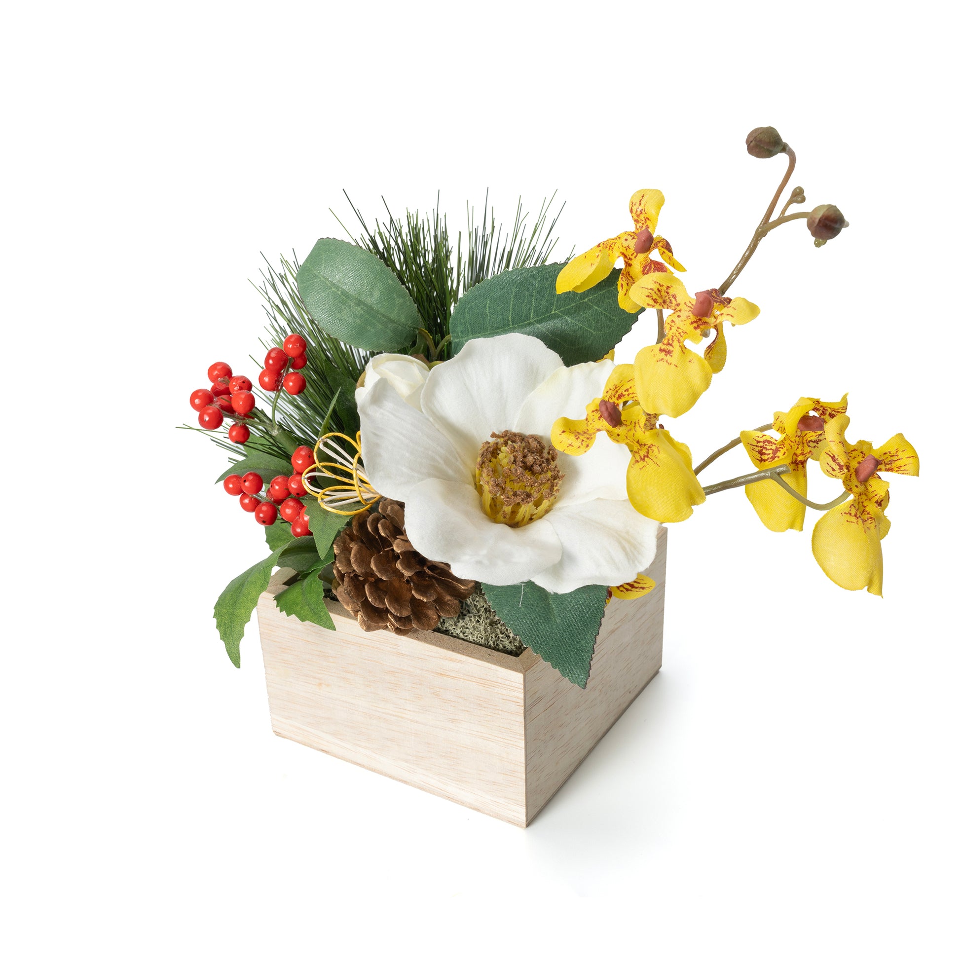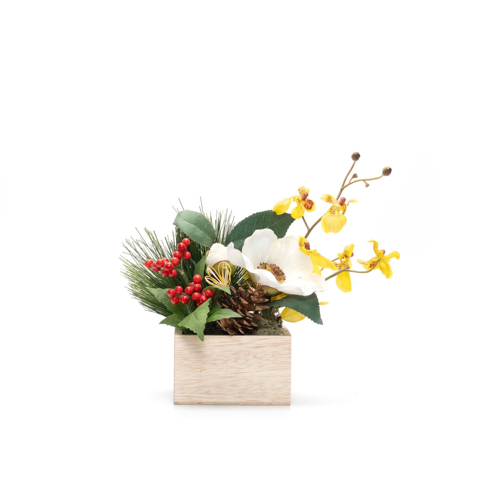 テーブルやデスクに置くだけで、空間全体をお正月の世界観に引き込む、コンパクトながらに効果的な升のアレンジメント。縁起の良さそうな松と松ぼっくり、椿、可憐なシンピジウム、そしてお正月にかかせない縁起物、センリョウ(千両)を美しくアレンジ。センリョウは赤い実が印象的な植物で、たくさんの実がつく姿から、花言葉は「富貴、利益、裕福、財産」など豊かな印象です。ミニマルなアレンジメントでお正月をお祝いしてみましょう。