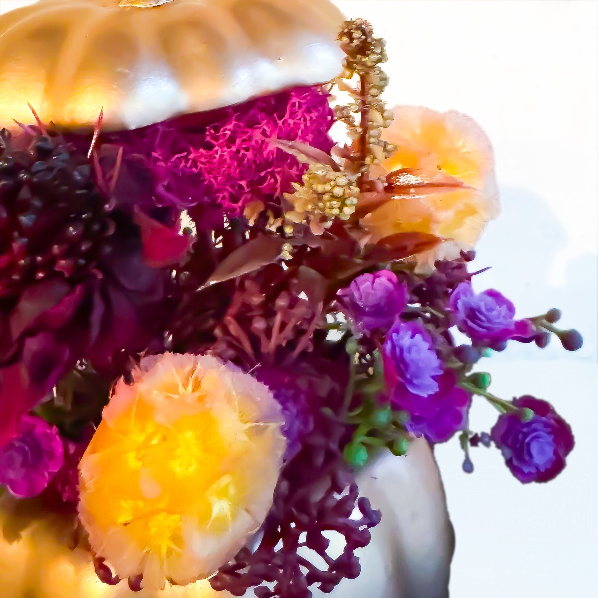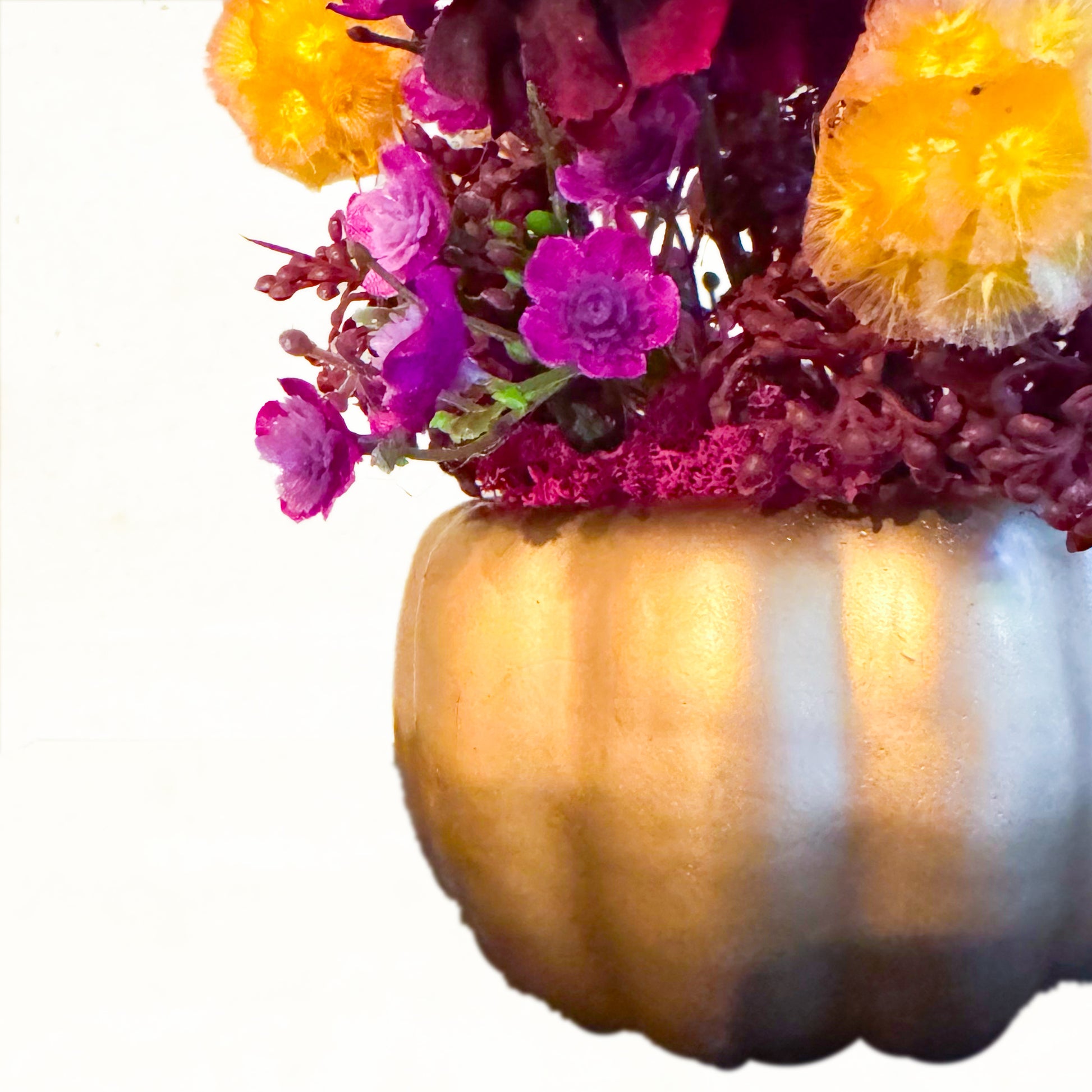 ゴールドに輝くパンプキンベースに、深みのあるバーガンディや鮮やかなパープル、柔らかなイエローの花々をアレンジ。