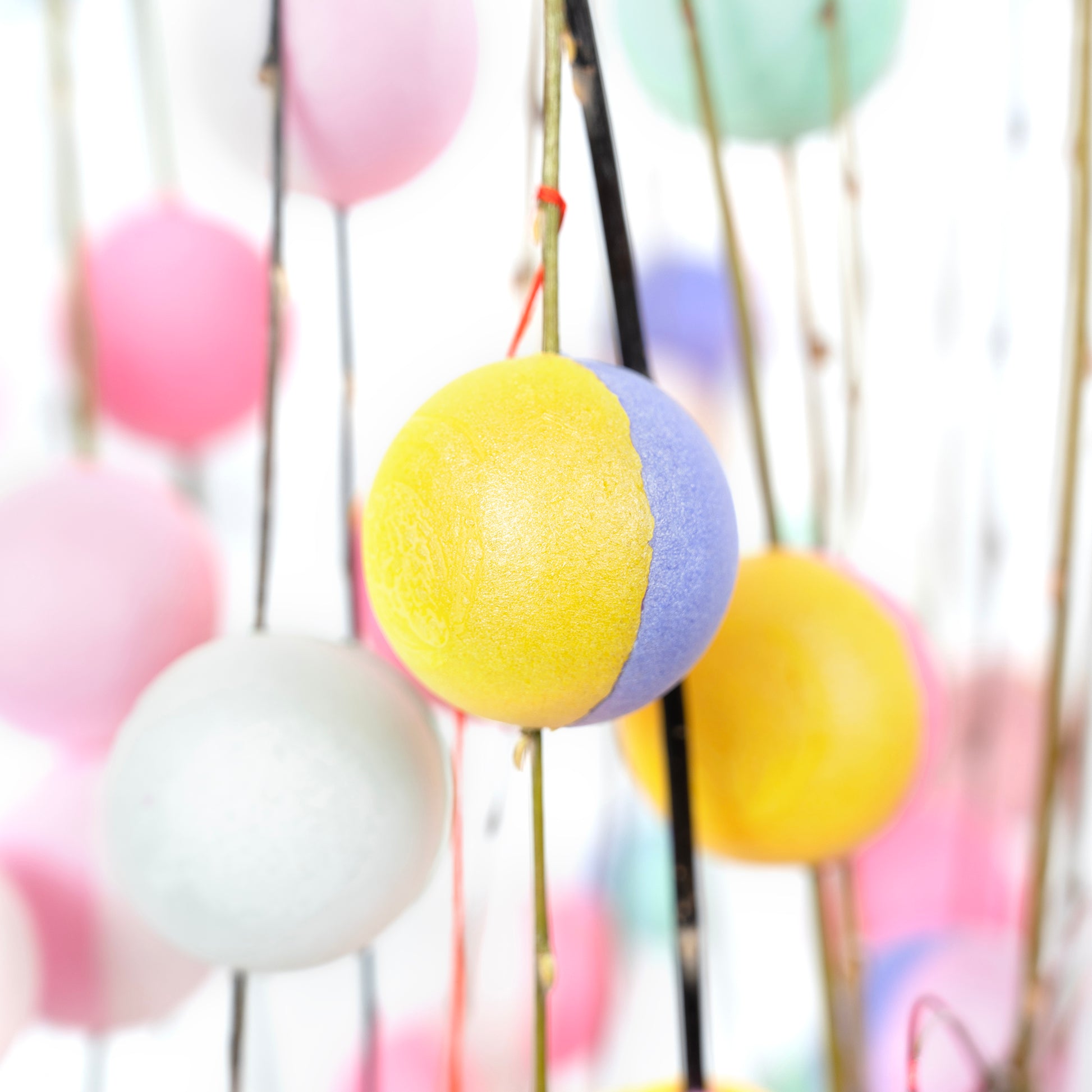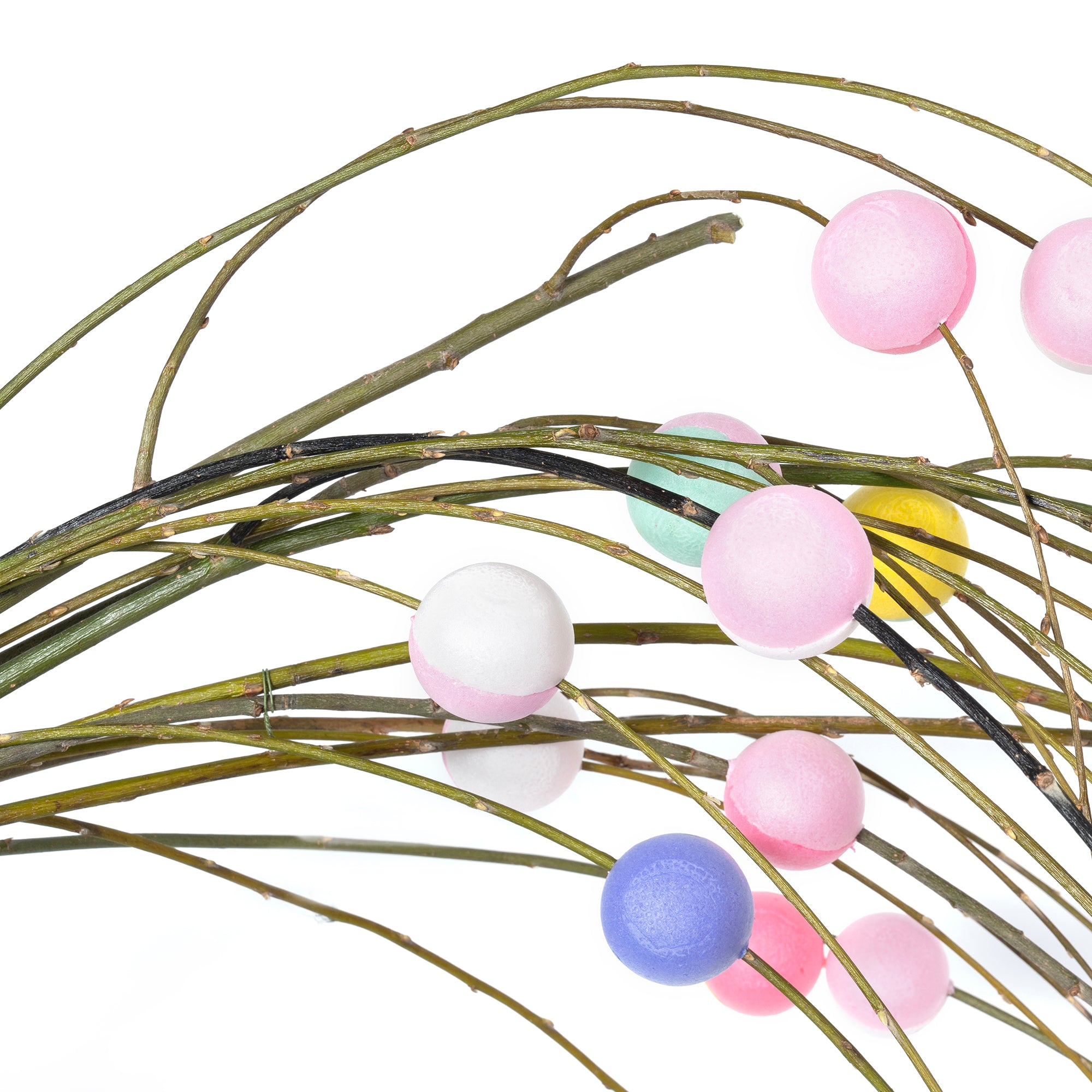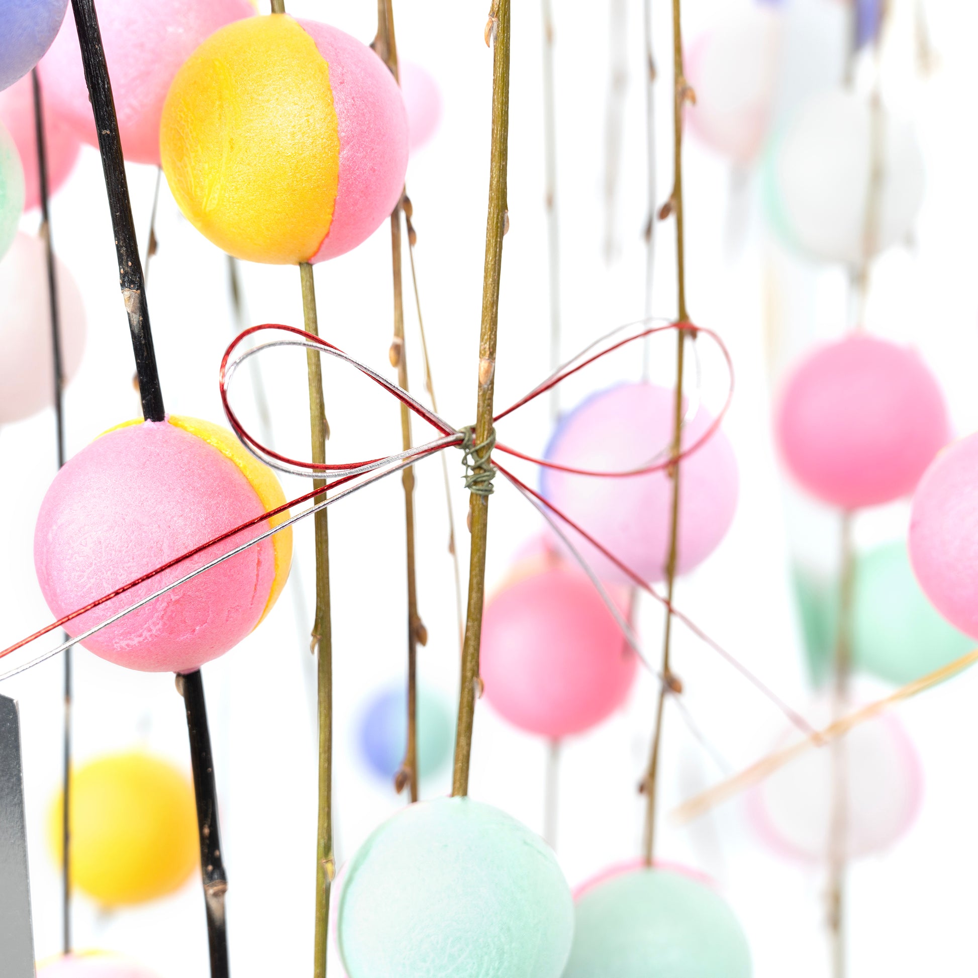 餅花は柳、水木、榎などの枝に、紅白などの小さな餅をくっつけ、神棚や玄関の近く、座敷などの柱に飾り付ける正月飾りです。古来から五穀豊穣を祈念すると言われています。中でもこの餅花はパープル、ピンク、グリーンなどの華やかなパステルカラーが艶やかかつ存在感があるため、広い空間やお店、オフィスにマッチしやすそう。色鮮やかな生花の色が少ないこの時期だからこそ、カラフルな餅花で幸せな1年をお祈りしましょう。(竹は付属しません)