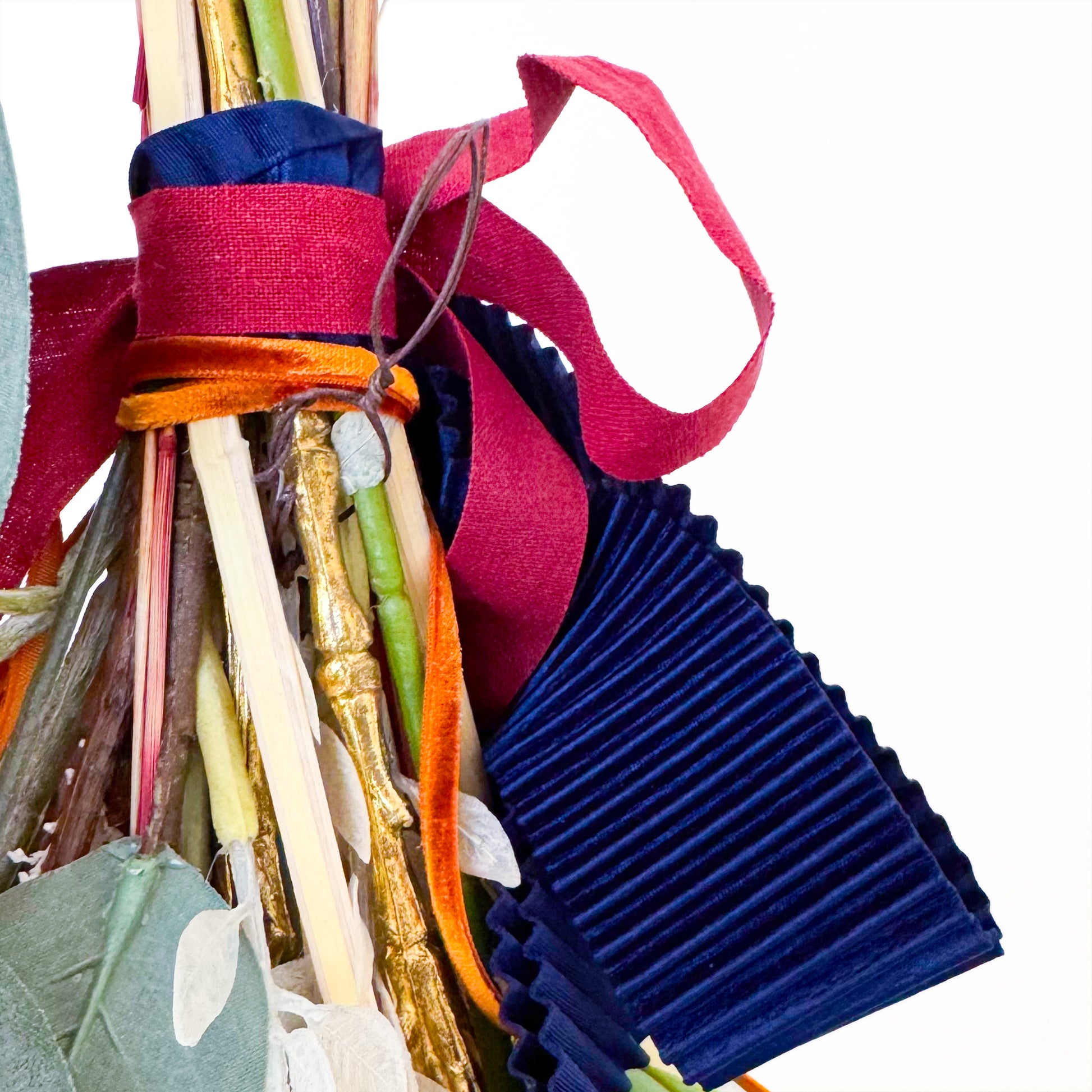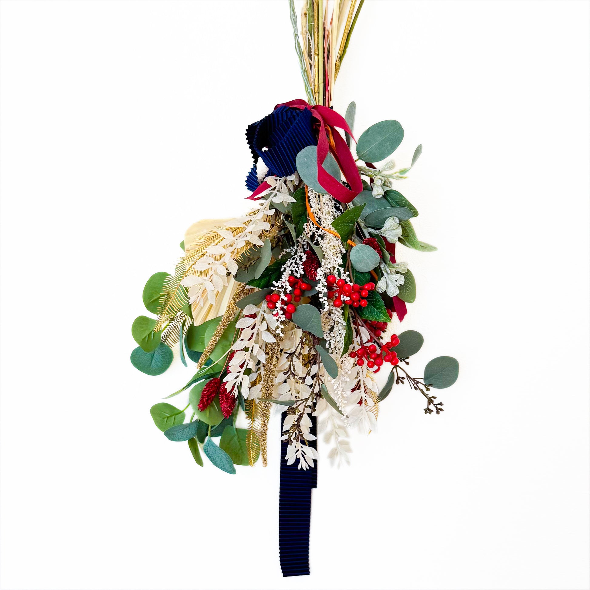 - 花材:ユーカリ、シダ、ドライパームの葉、エクリルミニリーフ、テトラゴナ、ヒイラギ ・その他:リボン、飾る用のフック付き(持ち手なし)