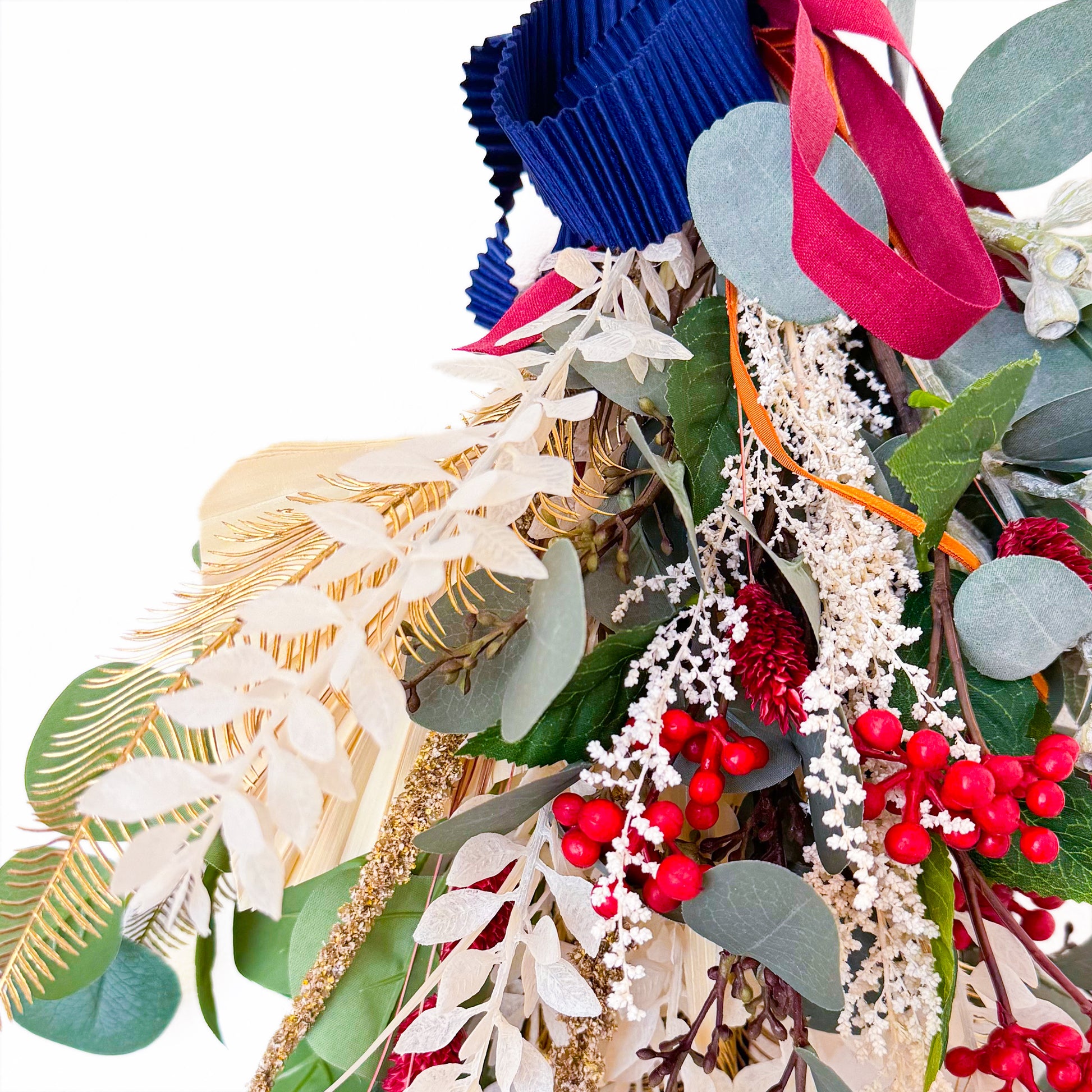 ホワイト、レッド、ゴールド、グリーンを基調に、グログラムのネイビーリボンとコットンのレッドリボン、オレンジのベルベットリボンで華やかさをプラスしたスワッグ。