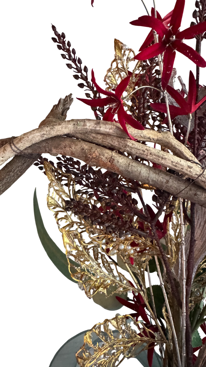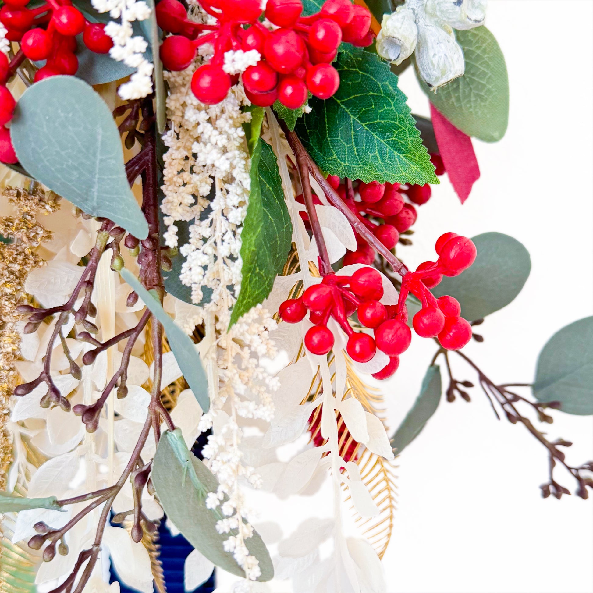 ユーカリ、シダ、ドライパームの葉、エクリルミニリーフ、ヒイラギがナチュラル&ボタニカルを演出し、テトラゴナのレッドがクリスマスらしいポイントに。