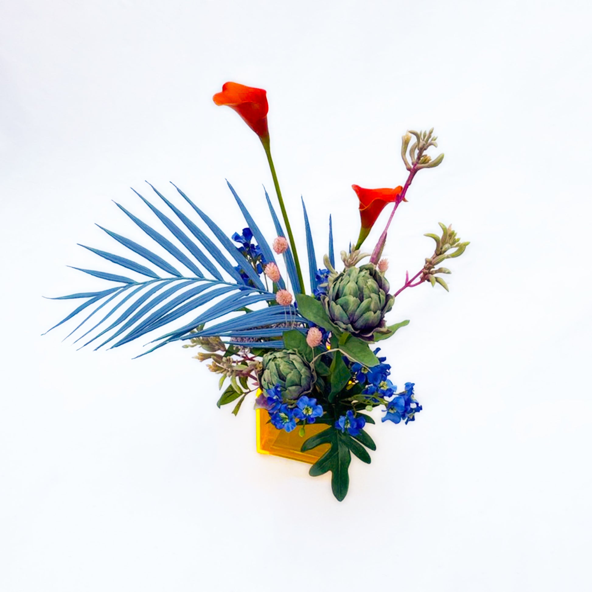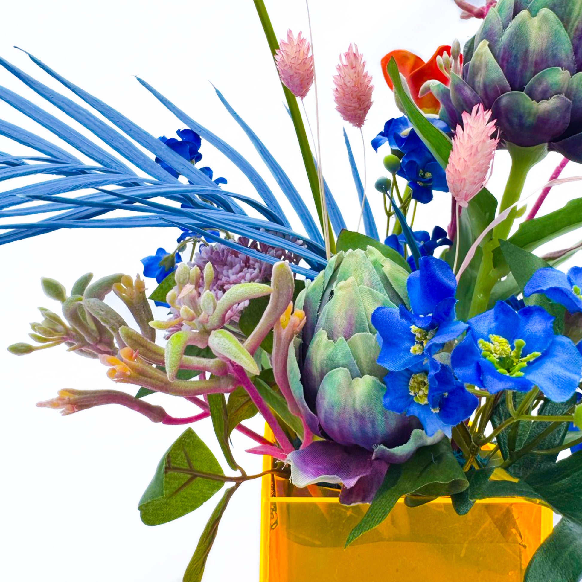 爽やかな風が吹き抜けるようなアーティチョークを主役に、エレガントなオレンジのカラーが空間を引き締めます。スタイリッシュなブルーのヤシ、個性的でおしゃれなカンガルーポー、鮮やかなブルーが映えるブルーブロッサムスプレー、ふんわりと甘さを添えるピンクブロッサムスプレーが、モダンに調和したアレンジメントです。イエローのポットと中のブルーモスがファッショナブル。トレンド感あふれるフレッシュな印象の中に、知的で重厚な趣も感じさせる逸品。大切な方への贈り物としてはもちろん、お部屋のアクセントにもおすすめです。