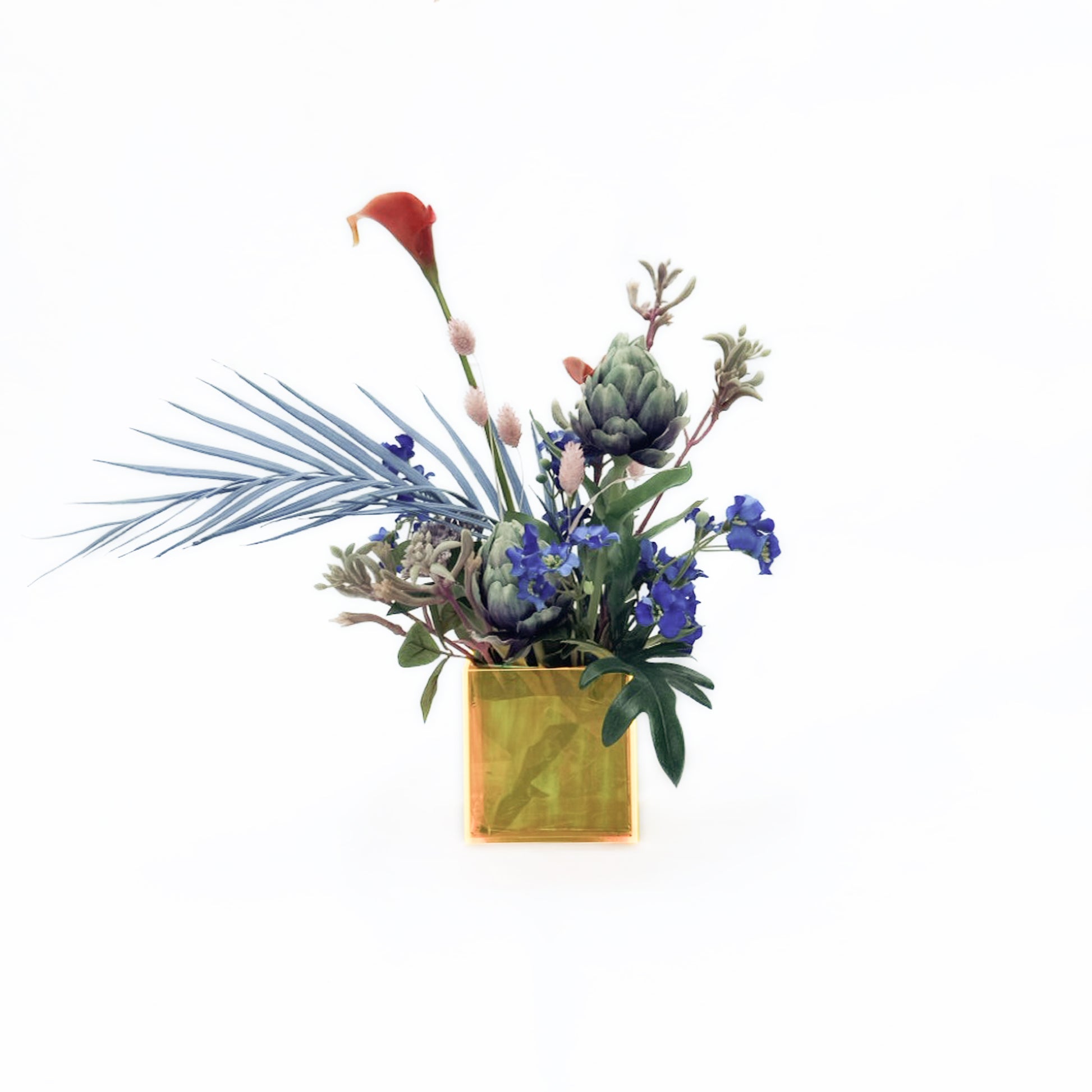 トランスペアレントなボックス型ポットに、ビビッドなネオンカラーを施し、オーロラフィルムとカラフルなモス(苔)でアクセントを加えた、ポップでファッショナブルなアレンジメントです。